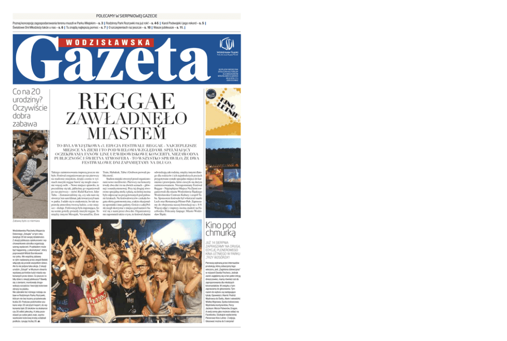 Polecamy w sierPniowej gazecie Poznaj koncepcję zagospodarowania terenu muszli w Parku Miejskim – s. 3 | Rodzinny Park Rozrywki ma już rok! – s. 4-5 | Karol Podwojski i jego rekord – s. 5 | Światowe Dni Młodzieży także u nas – s. 6 | Tu znajdą najlepszą pomoc – s. 7 | O szczepieniach raz jeszcze – s. 10 | Wasze jubileusze – s. 11. | WODZISŁAWSKA BEZPłATNy MiESięCZNiK SPOłECZNO-KuLTuRALNy DLA MiESZKAńCóW WODZiSłAWiA ŚLąSKiEGO NR 8/2016 (111) iSSN1233-9652 Reggae Co na 20 urodziny? Oczywiście dobra zabawa WPWD Dziupla zawładNęło MiasTeM To była wyjąTkowa 13. edycja FesTiwalu Reggae - Najcieplejsze Miejsce Na zieMi i To pod wieloMa względaMi. spełNiający oczekiwaNia FaNów liNe up, widowiskowe koNceRTy, NiezawodNa publiczNość i świeTNa aTMosFeRa - To wszysTko spRawiło, że dwa FesTiwalowe dNi zapaMięTaMy Na długo. Takiego zainteresowania imprezą jeszcze nie było. Festiwal zorganizowano po raz pierwszy na stadionie miejskim, dzięki czemu w rytmach muzyki reggae bawić się mogło znacznie więcej osób. – Nowe miejsce sprawiło, że poczuliśmy się tak, jakbyśmy go organizowali po raz pierwszy – mówi Rafał Karwot, lider Tabu. – Zastanawialiśmy się, czy uda nam się stworzyć ten sam klimat, jaki towarzyszył nam w parku. I udało się to znakomicie, bo tak naprawdę atmosferę tworzą ludzie, a nie miejsce – dodaje. Frekwencja była imponująca, bo na scenie gościły gwiazdy muzyki reggae. To między innymi Mesajah, Vavamuffin, Zion Zabawy było co niemiara Wodzisławska Placówka Wsparcia Dziennego „Dziupla” w tym roku świętuje 20 lat swojej działalności. Z okazji jubileuszu opiekunowie i wychowankowie ośrodka organizują szereg wydarzeń. Przykładem może być happening „Lokomotywa”, który poprowadził Witold Bornikowski na rynku. We wspólną zabawę w rytm nadawany przez zespół Bebiki włączyły się przede wszystkim dzieci. Ale to nie jedyna taka akcja. Z okazji urodzin „Dziupli” w Muzeum otwar to wystawę por tretów ludzi miasta wykonanych przez dzieci. Co jeszcze robiły dzieci z okazji jubileuszu? Bawiły się z cieniami, montowały drogowskazy szczęścia i tworzyły kolorowe obrazy na piasku. Nie zabrakło też różnego rodzaju zabaw w Rodzinnym Parku Rozrywki, którym nie bez kozery przyświecała liczba 20. Podczas podchodów szukano więc 20 ukrytych kopert, do wykonania było 20 skoków na skakance czy 20 odbić piłeczką. A żeby pozostawić po sobie jakiś znak, wychowankowie kolorową kredą ozdabiali podłoże, rysując liczbę 20. ak Train, Habakuk, Tabu i Grubson porwali publiczność. Stadion miejski otworzył przed organizatorami nowe możliwości. Pierwszy raz koncerty trwały dwa dni i to na dwóch scenach – głównej i soundsystemowej. Przy tej drugiej stworzono specjalną strefę z plażą, na której można było odpocząć na przygotowanych pod palmami leżakach. Na festiwalowiczów czekała bogata oferta gastronomiczna, a także okazjonalne upominki i inne gadżety. Goście z całej Polski mogli skorzystać z miejsca pod namiot i bawić się z nami przez dwa dni. Organizatorzy nie zapomnieli także o tym, że festiwal chętnie odwiedzają całe rodziny, między innymi dlatego dla rodziców i ich najmłodszych pociech przygotowane zostało specjalne miejsce do karmienia i przewijania, które cieszyło się dużym zainteresowaniem. Niezapomniany Festiwal Reggae – Najcieplejsze Miejsce Na Ziemi zorganizowali dla miasta Wodzisławia Śląskiego Wodzisławskie Centrum Kultury i zespół Tabu. Sponsorem festiwalu był właściciel marki Lech oraz Restauracja Pilsner Pub. Zapraszamy do obejrzenia naszej fotorelacji na s. 8-9. Więcej zdjęć z imprezy można znaleźć na Facebooku. Polecamy fanpage: Miasto Wodzisław Śląski. Kino pod chmurką Już 14 sierpnia zapraszamy na drugą edycJę plenerowego Kina letniego w parKu „trzy wzgórza”! Pierwszą wybraną przez internautów produkcją, którą zobaczymy tego wieczoru, jest „Zaginiona dziewczyna” w reżyserii Davida Finchera. Jednak zanim zagłębimy się w ten pełen intryg dreszczowiec, mamy również coś do zaproponowania dla młodszych kinomaniaków. W związku z tym zapraszamy do głosowania. Tym razem do wyboru są następujące tytuły: Opowieści z Narnii: Podróż Wędrowca do Świtu, Alwin i wiewiórki: Wielka Wyprawa, Epoka lodowcowa: Wędrówka kontynentów, Percy Jackson: Morze Potworów, Eragon. A swój cenny głos możecie oddać na Facebooku. Szukajcie wydarzenia: Plenerowe Kino Letnie - 2 edycja. Głosować można do 5 sierpnia! RATUSZ RATUSZ zdaniem Prezydenta szanowni Czytelnicy, sce czy odświeżona formuła. Dziś możemy śmiało powiedzieć – 13. edycja Najcieplejszego Miejsca Na Ziemi okazała się sukcesem. Zdajemy sobie oczywiście sprawę, że zawsze są rzeczy, które można poprawić. I będziemy nad nimi pracować. Dziękuję wszystkim mieszkańcom miasta, którzy bawili się z nami podczas festiwalu. To dla mnie ogromna radość widzieć tylu wodzisławian spędzających wspólnie czas w tak pozytywnej atmosferze. Przy okazji dziękuję za wszystkie urodzinowe życzenia. Dziękuję za wielką życzliwość, za pamięć i za każde dobre słowo. Obaw przed tegorocznym festiwalem było wiele. Byliśmy zmuszeni poszukać nowego miejsca, w którym mógłby się odbyć. Przenosimy imprezy na stadion wiązały się z dużym wyzwaniem organizacyjnym. Nie wiedzieliśmy, jak sprawdzi się nowe miej- Osp Kokoszyce do modernizacji stał odznaczony st. sierż. Łukasz Rybicki, który przez ponad 20 minut prowadził reanimację mężczyzny, tym samym ratując mu życie. Specjalne wyróżnienie oraz słowa uznania od Komendanta Wojewódzkiego Policji otrzymała także Urszula Króliczek, koordynator Wydziału Finansów i Zaopatrzenia jednostki. Następnie po okolicznościowych przemówieniach Starosty Powiatu Wodzisławskiego Ireneusza Serwotki i Prezydenta Miasta Wodzisławia Śląskiego Mieczysła