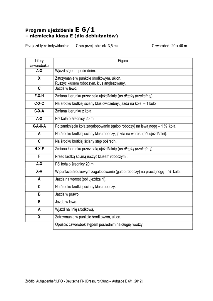 Program ujeżdżenia E 6/1 – niemiecka klasa E (dla debiutantów) Przejazd tylko indywidualnie. Litery czworoboku A-X X C Czas przejazdu: ok. 3,5 min. Czworobok: 20 x 40 m Figura Wjazd stępem pośrednim. Zatrzymanie w punkcie środkowym, ukłon. Ruszyć kłusem roboczym, kłus anglezowany. Jazda w lewo. F-X-H Zmiana kierunku przez całą ujeżdżalnię (po długiej przekątnej). C-X-C Na środku krótkiej ściany kłus ćwiczebny, jazda na kole – 1 koło C-X-A Zmiana kierunku z koła. A-X Pół koła o średnicy 20 m. X-A-X-A Po zamknięciu koła zagalopowanie (galop roboczy) na lewą nogę – 1 ½ koła. A Na środku krótkiej ściany kłus roboczy, jazda na wprost (pół ujeżdżalni). C Na środku krótkiej ściany stęp pośredni. H-X-F F Zmiana kierunku przez całą ujeżdżalnię (po długiej przekątnej). Przed krótką ścianą ruszyć kłusem roboczym.. A-X Pół koła o średnicy 20 m. X-A W punkcie środkowym zagalopowanie (galop roboczy) na prawą nogę – ½ koła. A Jazda na wprost (pół ujeżdżalni). C Na środku krótkiej ściany kłus roboczy. B Jazda w prawo. E Jazda w lewo. A Wjazd na linię środkową. X Zatrzymanie w punkcie środkowym, ukłon. Opuścić czworobok stępem pośrednim na długiej wodzy. Źródło: Aufgabenheft LPO - Deutsche FN [Dressurprüfung – Aufgabe E 6/1, 2012]