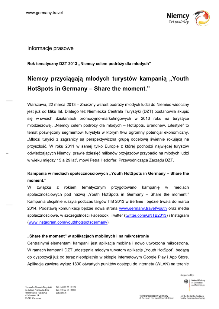 www.germany.travel Informacje prasowe Rok tematyczny DZT 2013 „Niemcy celem podróży dla młodych” Niemcy przyciągają młodych turystów kampanią „Youth HotSpots in Germany – Share the moment.” Warszawa, 22 marca 2013 – Znaczny wzrost podróży młodych ludzi do Niemiec widoczny jest już od kliku lat. Dlatego też Niemiecka Centrala Turystyki (DZT) postanowiła skupić się w swoich działaniach promocyjno-marketingowych w 2013 roku na turystyce młodzieżowej. „Niemcy celem podróży dla młodych – HotSpots, Brandnew, Lifestyle” to temat poświęcony segmentowi turystyki w którym tkwi ogromny potencjał ekonomiczny. „Młodzi turyści z zagranicy są perspektywiczną grupą docelową świetnie rokującą na przyszłość. W roku 2011 w samej tylko Europie z której pochodzi najwięcej turystów odwiedzających Niemcy, prawie dziesięć milionów przyjazdów przypadło na młodych ludzi w wieku między 15 a 29 lat”, mówi Petra Hedorfer, Przewodnicząca Zarządu DZT. Kampania w mediach społecznościowych „Youth HotSpots in Germany – Share the moment.” W związku z rokiem tematycznym przygotowano kampanię w mediach społecznościowych pod nazwą „Youth HotSpots in Germany – Share the moment.” Kampania oficjalnie ruszyła podczas targów ITB 2013 w Berlinie i będzie trwała do marca 2014. Podstawą komunikacji będzie nowa strona www.germany.travel/youth oraz media społecznościowe, w szczególności Facebook, Twitter (twitter.com/GNTB2013) i Instagram (www.instagram.com/youthhotspotsgermany). „Share the moment” w aplikacjach mobilnych i na mikrostronie Centralnymi elementami kampanii jest aplikacja mobilna i nowo utworzona mikrostrona. W ramach kampanii DZT udostępnia młodym turystom aplikację „Youth HotSpot”, będącą do dyspozycji już od teraz nieodpłatnie w sklepie internetowym Google Play i App Store. Aplikacja zawiera wykaz 1300 otwartych punktów dostępu do internetu (WLAN) na terenie Niemiecka Centrala Turystyki c/o Polsko-Niemiecka Izba Przemysłowo-Handlowa ul. Miodowa 14 00-246 Warszawa Tel. +48 22 53 10 528 Fax +48 22 53 10 688 [email protected] www.germany.travel całych Niemiec. W ten sposób młodzi turyści z zagranicy zyskują możliwość darmowego korzystania z sieci społecznościowych. Drugim głównym elementem kampanii jest mikrostrona www.germany.travel/youth. DZT dedykuje ją młodym ludziom stwarzając im w ten sposób możliwość uzyskania informacji na temat Niemiec jeszcze przed rozpoczęciem podróży. Interaktywna mapa pokazuje gdzie w Niemczech znajduje się najwięcej ofert w pięciu kategoriach „Must Sees” („To trzeba zobaczyć”), „Nightlife” („Nocne życie”), „Shopping” („Zakupy”), „Bars & Cafés” („Bary i kafejki”) oraz „Festivals & Events” („Festiwale i wydarzenia”). Klikając na kolorowe i pulsujące okręgi znajdujące się na interaktywnej mapie użytkownik dowiaduje się jakie hotspoty dostępne są w danych miastach. Ulubione miejsca czyli tzw. „hotspoty” zostały wyznaczone na podstawie ankiet przeprowadzonych wśród niemieckiej młodzieży. Wraz z uruchomieniem kampanii na targach ITB Berlin 2013 użytkownicy będą mogli na bieżąco uzupełniać mapę o nowe, własne hotspoty i dzielić się nimi ze znajomymi m. in. na Facebooku. W ten sposób będą dostarczać na stronę własne treści, które staną się tym samym częścią kampanii. To pozwoli DZT wykorzystać będący obecnie w trendzie „marketing rekomendacji” w celu zwrócenia uwagi młodych turystów na hotspoty w Niemczech. Bowiem to właśnie młodzi ludzie poszukują informacji poprzez polecenia znajomych w sieciach społecznościowych. Kategorie widoczne na mapie zostały wybrane w oparciu o badania przeprowadzone przez IPK International i World Travel Monitor (WTM) w 2011 roku. Według wyników tych badań największym zainteresowaniem wśród młodych turystów z Europy cieszą się turystyka miejska (33 procent) i wycieczki objazdowe (27 procent). Do najpopularniejszych czynności młodych gości w czasie wakacyjnych podróży po miastach należy według IPK International i WTM zwiedzanie zabytków i „chłonięcie atmosfery” miast. Dlatego na cele podróży wybierają najchętniej metropolie i wydarzenia. Popularne są także „zakupy” i „doznania kulinarne” na równi ze zwiedzaniem wystaw i muzeów. Około 6 tysięcy niemieckich muzeów prezentuje szeroki wachlarz tematyczny, od sztuki przez historię po architekturę i przyrodę. Niemiecka Centrala Turystyki c/o Polsko-Niemiecka Izba Przemysłowo-Handlowa ul. Miodowa 14 00-246 Warszawa Tel. +48 22 53 10 528 Fax +48 22 53 10 688 [email protected] www.germany.travel O DZT Niemiecka Centrala Turystyki (DZT) to narodowa „izba turystyki” Niemiec z siedzibą główną we Frankfurcie nad Menem. Centrala zajmuje się promowaniem Niemiec jako kraju turystycznego na zlecenie Federalnego Ministerstwa Gospodarki i Technologii (BMWi), które wspiera ją na mocy uchwały niemieckiego Bundestagu. DZT zajmuje się tworzeniem strategii i produktów oraz działaniami marketingowymi w celu dalszego umocnienia pozytywnego wizerunku Niemiec za granicą jako celu podróży oraz wspierania turystyki niemieckiej. DZT posiada 30 przedstawicielstw zagranicznych na całym świecie. Bliższe informacje można znaleźć w naszym internetowym centrum prasowym na stronie www.germany.travel/presse. Niemiecka Centrala Turystyki c/o Polsko-Niemiecka Izba Przemysłowo-Handlowa ul. Miodowa 14 00-246 Warszawa Tel. +48 22 53 10 528 Fax +48 22 53 10 688 [email protected]