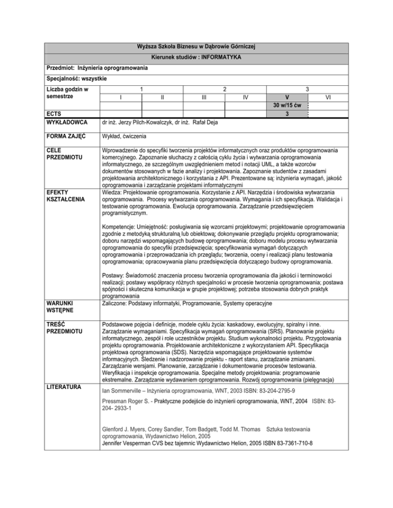 WyŜsza Szkoła Biznesu w Dąbrowie Górniczej Kierunek studiów : INFORMATYKA Przedmiot: InŜynieria oprogramowania Specjalność: wszystkie Liczba godzin w semestrze 1 I 2 II III 3 IV V 30 w/15 ćw 3 VI ECTS WYKŁADOWCA dr inŜ. Jerzy Pilch-Kowalczyk, dr inŜ. Rafał Deja FORMA ZAJĘĆ Wykład, ćwiczenia CELE PRZEDMIOTU Wprowadzenie do specyfiki tworzenia projektów informatycznych oraz produktów oprogramowania komercyjnego. Zapoznanie słuchaczy z całością cyklu Ŝycia i wytwarzania oprogramowania informatycznego, ze szczególnym uwzględnieniem metod i notacji UML, a takŜe wzorców dokumentów stosowanych w fazie analizy i projektowania. Zapoznanie studentów z zasadami projektowania architektonicznego i korzystania z API. Prezentowane są: inŜynieria wymagań, jakość oprogramowania i zarządzanie projektami informatycznymi Wiedza: Projektowanie oprogramowania. Korzystanie z API. Narzędzia i środowiska wytwarzania oprogramowania. Procesy wytwarzania oprogramowania. Wymagania i ich specyfikacja. Walidacja i testowanie oprogramowania. Ewolucja oprogramowania. Zarządzanie przedsięwzięciem programistycznym. EFEKTY KSZTAŁCENIA Kompetencje: Umiejętność: posługiwania się wzorcami projektowymi; projektowanie oprogramowania zgodnie z metodyką strukturalną lub obiektową; dokonywanie przeglądu projektu oprogramowania; doboru narzędzi wspomagających budowę oprogramowania; doboru modelu procesu wytwarzania oprogramowania do specyfiki przedsięwzięcia; specyfikowania wymagań dotyczących oprogramowania i przeprowadzania ich przeglądu; tworzenia, oceny i realizacji planu testowania oprogramowania; opracowywania planu przedsięwzięcia dotyczącego budowy oprogramowania. WARUNKI WSTĘPNE TREŚĆ PRZEDMIOTU LITERATURA Postawy: Świadomość znaczenia procesu tworzenia oprogramowania dla jakości i terminowości realizacji; postawy współpracy róŜnych specjalności w procesie tworzenia oprogramowania; postawa spójności i skuteczna komunikacja w grupie projektowej; potrzeba stosowania dobrych praktyk programowania Zaliczone: Podstawy informatyki, Programowanie, Systemy operacyjne Podstawowe pojęcia i definicje, modele cyklu Ŝycia: kaskadowy, ewolucyjny, spiralny i inne. Zarządzanie wymaganiami. Specyfikacja wymagań oprogramowania (SRS). Planowanie projektu informatycznego, zespół i role uczestników projektu. Studium wykonalności projektu. Przygotowania projektu oprogramowania. Projektowanie architektoniczne z wykorzystaniem API. Specyfikacja projektowa oprogramowania (SDS). Narzędzia wspomagające projektowanie systemów informacyjnych. Śledzenie i nadzorowanie projektu - raport stanu, zarządzanie zmianami. Zarządzanie wersjami. Planowanie, zarządzanie i dokumentowanie procesów testowania. Weryfikacja i inspekcje oprogramowania. Specjalne metody projektowania: programowanie ekstremalne. Zarządzanie wydawaniem oprogramowania. Rozwój oprogramowania (pielęgnacja) Ian Sommerville – InŜynieria oprogramowania, WNT, 2003 ISBN: 83-204-2795-9 Pressman Roger S. - Praktyczne podejście do inŜynierii oprogramowania, WNT, 2004 ISBN: 83204- 2933-1 Glenford J. Myers, Corey Sandler, Tom Badgett, Todd M. Thomas Sztuka testowania oprogramowania, Wydawnictwo Helion, 2005 Jennifer Vesperman CVS bez tajemnic Wydawnictwo Helion, 2005 ISBN 83-7361-710-8 METODY NAUCZANIA Wykład ilustrowany prezentacją w PowerPoint oraz eksploracją wybranych miejsc na Internecie. Wykonanie projektu do końca semestru POMOCE NAUKOWE PRZYKŁADOWE TEMATY PROJEKTÓW SPOSÓB I WARUNKI ZALICZENIA PRZEDMIOTU PRZYKŁADOWE ZAGADNIENIA (ew. pytania) EGZAMINU/ ZALICZENIA Rzutnik do laptopa, połączenie z Internetem Dokumentacja projektowana wybranych projektów informatycznych (w grupach) Zaliczenie Czynności procesu tworzenia oprogramowania. Model kaskadowy. Model spiralny. Proces inŜynierii wymagań. Modele strukturalne oprogramowania. Fazy procesu testowania. Obowiązki architekta projektu. UŜycie języka naturalnego do wymagań. Miary produktywności programistów. Spojrzenia na architekturę oprogramowania. Specyfikacja funkcjonalna oprogramowania. * Proszę zacieniować odpowiedni rok i semestr