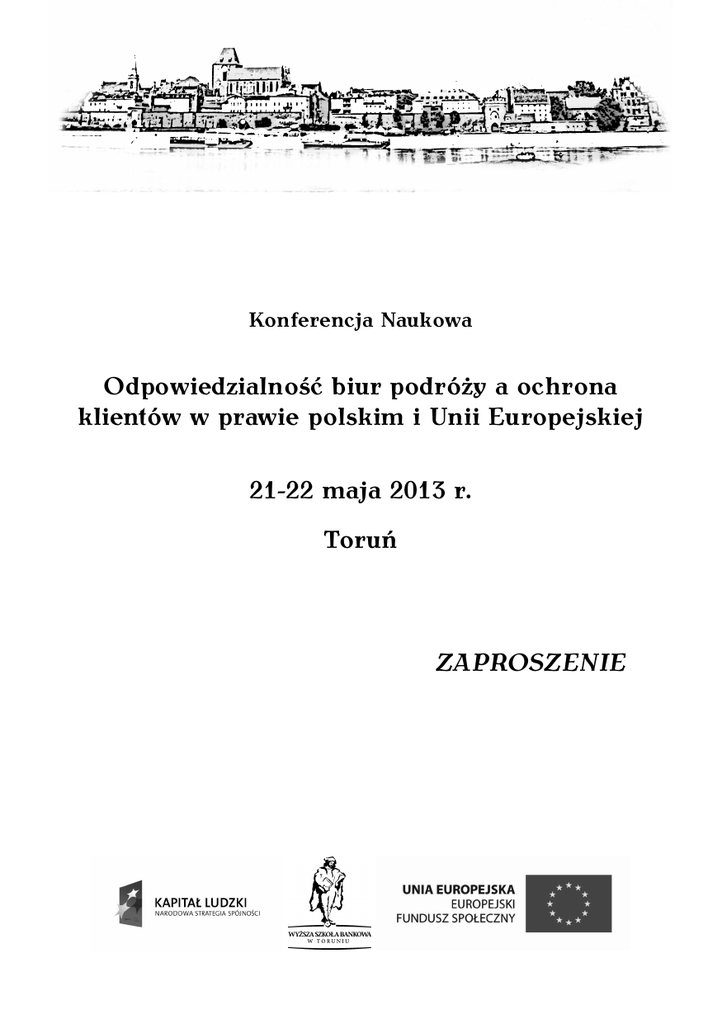 Konferencja Naukowa Odpowiedzialność biur podróży a ochrona klientów w prawie polskim i Unii Europejskiej 21-22 maja 2013 r. Toruń ZAPROSZENIE Organizator: Wyższa Szkoła Bankowa w Toruniu Katedra Turystyki Komitet Naukowy Konferencji: prof. dr hab. Mirosław Nesterowicz – przewodniczący (UMK Toruń/WSB Toruń) prof. dr hab. Eugeniusz Kowalewski (UMK Toruń) prof. dr hab. Ewa Bagińska (UG Gdańsk/UMK Toruń) dr Zuzanna Pepłowska-Dąbrowska (UMK Toruń/WSB Toruń) Komitet Organizacyjny Konferencji: dr Marcin Błażejowski (WSB Toruń) – przewodniczący dr Paweł Kufel (WSB Toruń) Miejsce konferencji: Wyższa Szkoła Bankowa w Toruniu ul. Młodzieżowa 31a, 87-100 Toruń Referaty wygłaszane podczas Konferencji: - Podstawy odpowiedzialności cywilnej biur podróży prof. dr hab. M. Nesterowicz, Uniwersytet Mikołaja Kopernika, Wyższa Szkoła Bankowa w Toruniu - Dyrektywa 90/314/EWG z 13.07.1990 o podróżach turystycznych prof. dr hab. Ewa Bagińska, Uniwersytet Mikołaja Kopernika, Uniwersytet Gdański, mgr Alicja Osowska-Kowalska, Uniwersytet Mikołaja Kopernika - Niedozwolone klauzule umowne w umowie o podróż dr Zuzanna Pepłowska-Dąbrowska, Uniwersytet Mikołaja Kopernika, Wyższa Szkoła Bankowa w Toruniu - Odszkodowanie za niewykonanie lub nienależyte wykonanie umowy o podróż i zadośćuczynienie za „zmarnowany urlop” dr Monika Wałachowska, Uniwersytet Mikołaja Kopernika - Wycieczki morskie dr Iwona Zużewicz-Wiewiórowska, Uniwersytet Gdański - Wycieczki lotnicze dr Anna Konert, Wyższa Szkoła Handlu i Prawa im. R. Łazarskiego w Warszawie - Tabela Frankfurcka jako wzorzec rozstrzygania sporów pomiędzy biurami podróży a klientami mgr Agnieszka Chambellan, LL.M., Uniwersytet w Regensburgu - Zabezpieczenie finansowe uczestników wycieczek w razie niewypłacalności i upadłości biur podróży w prawie polskim i państw członkowskich UE dr hab. Hanna Zawistowska, Szkoła Główna Handlowa - Ubezpieczenia turystyczne uczestników wycieczek prof. dr hab. Eugeniusz Kowalewski, Uniwersytet Mikołaja Kopernika Program konferencji - 10.00-10.30 10.30-10.45 10.45-12.45 12.45-13.45 13.45-15.15 13.45-15.15 13.45-15.15 Rejestracja uczestników Otwarcie konferencji Sesja plenarna I Lunch Sesja plenarna II Dyskusja Podsumowanie i zamknięcie konferencji Serdecznie zapraszamy: - pracowników i studentów wyższych uczelni (uniwersytetów, szkół ekonomicznych i bankowych, AWF) - pracowników biur podróży, przedsiębiorstw transportowych, zakładów ubezpieczeń - przedstawicieli Polskiej Izby Turystyki i innych organizacji turystycznych - przedstawicieli Ministerstwa Sportu i Turystyki - adwokatów i radców prawnych - wszystkie osoby zainteresowane tematyka konferencji Zgłoszenie Osoby zainteresowane wzięciem udziału w konferencji prosimy o przesłanie zgłoszenia na adres mailowy [email protected] oraz wniesienie opłaty konferencyjnej do dnia 30 kwietnia 2013 r. Opłata konferencyjna: Opłata konferencyjna wynosi 200,00 zł i zawiera koszt uczestnictwa w konferencji oraz materiały konferencyjne. Pracownicy wyższych uczelni oraz studenci są zwolnieni z opłaty konferencyjnej. Wpłaty należy dokonywać na rachunek bankowy: Wyższa Szkoła Bankowa w Toruniu, ul. Młodzieżowa 31a Bank Pekao SA 35 1240 6478 1111 0000 4948 7925 z dopiskiem: Konferencja Turystyka – Imię i Nazwisko Uczestnika. Kontakt: Wyższa Szkoła Bankowa w Toruniu, ul. Młodzieżowa 31a, 87-100 Toruń fax: 56 66 09 207 [email protected] [email protected] [email protected]