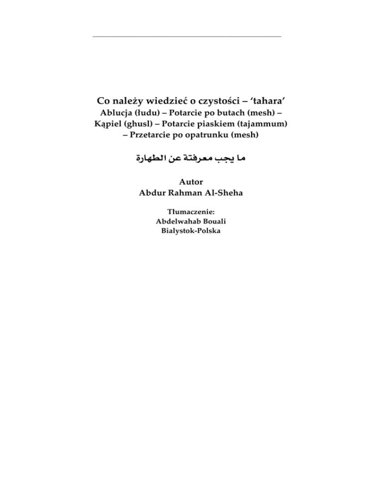 _________________________________________________ Co należy wiedzieć o czystości – ‘tahara’ Ablucja (łudu) – Potarcie po butach (mesh) – Kąpiel (ghusl) – Potarcie piaskiem (tajammum) – Przetarcie po opatrunku (mesh) א Autor Abdur Rahman Al‐Sheha Tłumaczenie: Abdelwahab Bouali Bialystok‐Polska Co należy wiedzieć o czystości – ‘tahara’ ___________________________________________________________________ Treść Wstęp 5 10 14 16 21 Unieważnienia ablucji 24 Nieprawidłowości w ablucji 30 Opinie prawne (Fatały) dotyczące ablucji 34 Cechy czystości Czystość fizyczna Znaczenie ablucji (łudu) Sunny w ablucji Potarcie po butach 36 41 Kilka Opinie prawne (Fatały) dotyczące przetarcia po opatrunku 42 Przetarcie po opatrunku Kąpiel (Ghusl) 43 Nieprawidłowości dotyczące kąpieli 50 55 Potarcie piaskiem (tajammum) Niektóre opinie prawne (fatały)dotyczące tajammum 60 Sposób oczyszczania się przez chorego 62 ___________________________________________________ 2 Co należy wiedzieć o czystości – ‘tahara’ ___________________________________________________________________ Muzułmanie kiedy wspominają Allaha () oraz Wysłannika Muhammada () i wszystkich Wysłanników (), a także Aniołów () i towarzyszy Wysłannika Muhammada () wypowiadają specjalne słowa okazując im w ten sposób wielki szacunek. Książka ta w swojej treści zawiera arabskie zwroty, których znaczenia są następujące: ALLAH: Subhaanahu wa ta´ala‐ Chwała Jemu i Wyniosłość. Wysłannik Muhammad: salla‐llahu ´alaihi wa salam‐ Pokój i błogosławieństwo Allaha niech będą z nim. Aniołowie i Wysłannicy: ´alaihim salaam‐ Pokój z nimi. Towarzysz Wysłannika Muhammada: radia‐llahu ´anhu‐ Niech Allah będzie zadowolony z niego. Towarzysze Wysłannika Muhammada: radia‐llahu ´anhum‐ Niech Allah będzie zadowolony z nich. (Rabb) Zamiast tego słowa , ktore oznacza Bóg, niektórzy wolą używać słowa Pan, ponieważ pierwsze słowo(Bóg) pochodzi z Ewangelii i określa sie nim rownież Mesjasza, a drugie słowo Pan czyli przywódca, sędzia, król nie oddają jednak pełnego znaczenia słowa Bóg. Natomiast słowo ʹRabbʹ oznacza: Stwórca, Jedyny Żywiciel, Jedynie On utrzymuje stworzenia przy życiu i On sam decyduje o ich poczęciu i śmierci. ___________________________________________________ 3 Co należy wiedzieć o czystości – ‘tahara’ ___________________________________________________________________ (Diin) Słowo to tłumaczone jest jako wiara, jednak w języku arabskim oznacza ono ukierunkowanie stylu życia prywatnego i społecznego i określa wszystkie formy czczenia Boga oraz życie polityczne, a także szczegołowe prawa i ogólne zasady postępowania tak jak czystość, moralność i inne sprawy dotyczące ogólnego życia. ___________________________________________________ 4 Co należy wiedzieć o czystości – ‘tahara’ ___________________________________________________________________ l „W imię Allaha Miłosiernego Litościwego“ Chwała Allahowi ‐Panu światów oraz pokój i błogosławieństwo niechaj będą z naszym wysłannikiem, z jego rodziną i towarzyszami. Wstęp: Czystość (tahara) to słowo, które brzmi przyjemnie i każdy normalny człowiek powinien dążyć do utrzymania jej. Znaczenie czystości w terminologii islamskiej jest szerokie (nie ogranicza się tylko do jednej sfery) i oznacza ona zarówno czystość fizyczną( oczyszczenie ciała z wszelkiej nieczystości) jak i czystość duchową(oczyszczenie duszy ze złych czynów i oddalenie się od grzechów, od zakazów oraz czynienie dobra zarówno mową jak i uczynkami). Dowodem na ogólnie pojętą czystość jest przekazany przez Abu Hurajra () hadis, w którym Prorok () powiedział: „ Jak sądzicie, gdyby obok drzwi któregoś z was płynęła rzeka, w której wykąpałby się pięć razy dziennie – czy pozostałoby coś z brudu na jego ciele? Nie, Wysłanniku Allaha–odpowiedzieli. Wysłannik () rzekł: Podobnie jest z pięcioma modlitwami, przez które Allah zmazuje grzechy.”1 Sahih al‐Buchari 1 ___________________________________________________ 5 Co należy wiedzieć o czystości – ‘tahara’ ___________________________________________________________________ Modlitwa nie jest przyjęta jak tylko po oczyszczeniu się wodą‐ ablucją‐ z mniejszej nieczystości i kąpielą ‐z większej nieczystości, bowiem Wysłannik Allaha () powiedział: „Żadna modlitwa nie jest przyjęta bez oczyszczenia się.”2 Z tego wynika, iż modlitwa osoby oczyszczającej się w sposób, jaki nakazał Allah i w jaki wyjaśnił Wysłannik Allaha () jest oczyszczeniem z grzechów i złych uczynków. Islam jest religią czystości zewnętrznej i wewnętrznej i ostrzega muzułmanina przed konsekwencjami zaniedbywania czystości fizycznej, która jest warunkiem prawidłowości i przyjęcia niektórych form czczenia takich jak: modlitwa, okrążanie Ka’by, dotykanie Mushaf (Kur’anu) itp. Ibn Abbas () powiedział: Wysłannik Allaha () przechodził obok dwóch grobów mówiąc: „Ci dwaj zmarli są karani, lecz nie z powodu dużego grzechu. Jeden z nich niewystarczająco oczyścił się z jego moczu, a drugi roznosił oszczerstwa...”.Po tym Wysłannik () poprosił swych towarzyszy o gałąź, którą następnie przełamał na pół. Każdą część wsadził do grobów. Zapytali: O Wysłanniku Allaha, dlaczego tak zrobiłeś? Odparł: Być może ich kara będzie zmniejszona zanim wyschną te gałązki.”3 Dużo hadisów zawierających prośby pokazuje umiłowanie Wysłannika () do czystości, m.in. prośba: „O Allahu! Tobie należą się podziękowania tak wielkie jak niebiosa i ziemia…O Allahu! Oczyść mnie śniegiem, gradem i zimną wodą. O Allahu! Oczyść mnie z grzechów tak jak oczyszcza się białe ubranie z nieczystości.”4 Zasady religii islamu zachęcają do dbania o czystość. Dżabir () powiedział: Sahih Muslim Sahih 