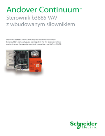 Andover Continuum Sterownik b3885 VAV z wbudowanym siłownikiem Sterownik b3885 Continuum należy do rodziny sterowników BACnet, które komunikują się po magistrali RS-485 ze sterownikiem nadrzędnym wykorzystując protokół komunikacyjny BACnet MS/TP. TM 02 Andover Continuum Sterownik b3885 VAV z wbudowanym siłownikiem Opis produktu Sterownik b3885 posiada wbudowany siłownik do sterowania przepustnicą powietrza, co zdecydowanie upraszcza montaż i obniża koszty instalacji. Posiadając 2 wejścia uniwersalne, 2 wyjścia cyfrowe (triaki załączne), czujnik przepływu powietrza oraz wbudowany siłownik przepustnicy, sterownik b3885 stanowi doskonałe rozwiązanie dla prostego sterowania VAV. Podobnie jak wszystkie sterowniki z serii b3 sterownik b3885 posiada pamięć Flash, zwiększoną pojemność pamięci użytkowej i szybki 32-bitowy procesor. CHARAKTERYSTYKA PRODUKTU • Komunikacja BACnet MS/TP umożliwia integrację z urządzeniami innych producentów • Wspiera 18 obiektów BACnet, m.in. Trendy, Harmonogramy, Kalendarze i Pętle • Kompaktowy sterownik dla urządzeń VAV • Wbudowany siłownik przepustnicy upraszcza montaż • Wejścia uniwersalne, wyjścia przekaźnikowe i analogowe zapewniają elastyczność zastosowań • Pamięć Flash zapewnia najwyższą niezawodność – zawiera system operacyjny, programy użytkowe i dane robocze • Wbudowany czujnik przepływu powietrza • Wbudowany port serwisowy • Typowe zastosowania VAV: - Chłodzenie - Chłodzenie i 1 lub 2-stopniowe grzanie elektryczne - Chłodzenie z dogrzewaniem, ste rowanie PWM - Wentylowanie z 1-stopniowym dogrze waniem • Profil urządzenia B-AAC z obsługą lokalnych trendów Jako sterownik w pełni BACnet-owy, b3885 może komunikować się z innymi urządzeniami BACnet poprzez sieć MS/TP, stosując się dokładnie do wymagań standardu ANSI/ASHRAE 135-2004. Sterownik b3885 posiada oficjalny certyfikat zgodności wydany przez BTL (BACnet Testing Laboratory) i posiada profil B-AAC (BACnet Advanced Application Controller). Współpracując ze sterownikami nadrzędnymi Andover Continuum typu b4920 lub bCX1 stanowi element sieci obiektowej urządzeń wykonawczych MS/TP. Sterownikami nadrzędnymi w warstwie Ethernet mogą być sterowniki Andover Continuum (BACnet lub Infinet) lub sterowniki typu BACnet IP innych producentów. Wszystkie sterowniki Andover Continuum (BACnet oraz Infinet) są w pełni kompatybilne ze stacją roboczą Andover Continuum CyberStation, w pełni zgodną z profilem stacji roboczej BACnet (B-OWS). Zwiększona niezawodność dzięki pamięci Flash Sterownik b3885 posiadają nieulotną pamięć RAM typu Flash dla systemu operacyjnego, programów użytkowych oraz danych roboczych. Po zaniku napięcia zasilania sieciowego, wbudowany na płycie głównej akumulator umożliwia bezpieczny transfer nastaw, trendów oraz innych danych roboczych do pamięci Flash. Po powrocie napięcia zasilającego programy użytkowe oraz dane robocze mogą być odtworzone. Backup pamięci RAM i ustawienia odtwarzania są konfigurowalne. System operacyjny zawarty w pamięci Flash pozwala na łatwą aktualizację wersji bez demontażu układów pamięci. Schneider Electric Buildings Polska Sp. z o.o. , ul. Rzymowskiego 53, 02-697 Warszawa, tel.: +48 22 313 24 10, fax: +48 22 313 24 11 www.schneider-electric.com/buildings SDS-B3885-A4.BU.N.EN.10.2005.0.00.CC 03 Andover Continuum Sterownik b3885 VAV z wbudowanym siłownikiem Opis produktu (ciąg dalszy) Wejścia Wymiary (szkic) Sterownik b3885 posiada 2 10-bitowe wejścia uniwersalne, konfigurowalne jako napięciowe o zakresie napięć wejściowych 0-5VDC, cyfrowe, licznikowe do 4 Hz lub temperaturowe, oraz dodatkowo wbudowany czujnik przepływu powietrza. Zwykle wejścia uniwersalne wykorzystywane są do pomiaru temperatury w strefie, oraz do pomiaru temperatury dostarczanego powietrza lub temperatury zadanej. Wyjścia Sterownik b3885 posiada 2 wyjścia cyfrowe (triaki załączne, uziemione). Te wyjścia mogą być używane do załączania/wyłączania lub sterowania PWM urządzeń oświetleniowych, grzewczych czy wentylatorów lub do dwukierunkowego sterowania przepustnicami lub zaworami, oba wyjścia cyfrowe mogą zostać skonfigurowane jako jedno wyjście trójstanowe. Dopuszczalne jest tylko obciążenie zmiennoprądowe. Zwykle wyjścia te wykorzystywane są do 1- lub 2-stopniowego grzania elektrycznego lub sterowania PWM zaworem dogrzewającym. Siłownik przepustnicy Wbudowany siłownik przepustnicy Belimo® pozwala na bardzo prosty montaż sterowników bezpośrednio na osi przepustnicy. Sterowniki posiadają wbudowane programowe zabezpieczenie siłownika przed uszkodzeniem po dojściu do położeń krańcowych. Siłownik posiada również przycisk rozprzęgający, który umożliwia ręczne ustawienie położenia siłownika w trakcie montażu i uruchomienia. Mechaniczne ograniczniki krańcowe pozwalają na dowolny wybór zakresu ruchu kątowego. Programowanie Pamięć sterownika b3885 może zawierać programy użytkowe, harmonogramy, alarmy, dane oraz obiekty BACnet (m.in. Harmonogramy, Alarmy i Trendy). Obiektowy język programowania Plain English® umożliwia łatwe zastosowanie dowolnie skomplikowanych algorytmów. Z poziomu Plain English® istnieje bezpośredni, lokalny lub globalny dostęp do obiektów BACnet-owych. Programowanie sterowników b3885 odbywa się za pośrednictwem stacji roboczej Continuum w wersji 1.7 lub wyższej. Programy, baza danych personelu, logi i alarmy przechowywane i wykonywane są bezpośrednio w sterowniku. Złącza Czujnik przepływu powietrza Schneider Electric Buildings Polska Sp. z o.o. , ul. Rzymowskiego 53, 02-697 Warszawa, tel.: +48 22 313 24 10, fax: +48 22 313 24 11 www.schneider-electric.com/buildings SDS-B3885-A4.BU.N.EN.10.2005.0.00.CC 04 Andover Continuum Sterownik b3885 VAV z wbudowanym siłownikiem Specyfikacja Sterownik b3885 VAV Elektryczna Kabel magistrali RS-485 Zasilanie niskopojemnościowa, ek