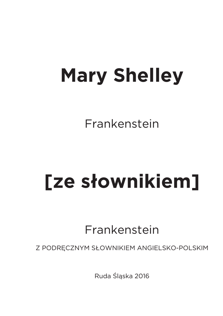 Mary Shelley Frankenstein [ze słownikiem] Frankenstein Z PODRĘCZNYM SŁOWNIKIEM ANGIELSKO-POLSKIM Ruda Śląska 2016 Letter 1 St. Petersburgh, Dec. 11th, 17— TO Mrs. Saville, England You will rejoice to hear that no disaster has accompanied the commencement of an enterprise which you have regarded with such evil forebodings. I arrived here yesterday, and my first task is to assure my dear sister of my welfare and increasing confidence in the success of my undertaking. I am already far north of London, and as I walk in the streets of Petersburgh, I feel a cold northern breeze play upon my cheeks, which braces my nerves and fills me with delight. Do you understand this feeling? This breeze, which has travelled from the regions towards which I am advancing, gives me a foretaste of those icy climes. Inspirited by this wind of promise, my daydreams become more fervent and vivid. I try in vain to be persuaded that the pole is the seat of frost and desolation; it ever presents itself to my imagination as the region of beauty and delight. There, Margaret, the sun is forever visible, its broad disk just skirting the horizon and diffusing a perpetual splendour. There—for with your leave, my sister, I will put some trust in preceding navigators— there snow and frost are banished; and, sailing over a calm sea, we may be wafted to a land surpassing in wonders and in beauty assure - ]DSHZQLDýJZDUDQWRZDý banished - EDQLVK]HVâDý Z\U]XFLý braces - EUDFHQDSLĊýVLę SRGHSU]Hý szelki breeze - bryza calm - spokojny cheeks - (cheek) policzek climes - (clime) strefa, klima commencement - UR]SRF]ęFLH daydreams - (daydream) UR]PDU]\ýVLęPDU]HQLD Dec – (December) JUXG]LHľ delight - rozkosz desolation - spustoszenie, pustka diffusing - (diffuse) rozproszony, rozmyty England - Anglia evil - ]âR fervent - ůDUOLZ\ forebodings - (foreboding) ]âH przeczucia foretaste - przedsmak frost - mróz, szron horizon - horyzont icy - lodowaty inspirited - LQVSLULQJRů\ZLRQ\ London - Londyn mrs - SDQLSURV]ęSDQL navigators - (navigator) nawigator nerves - (nerve) nerw perpetual - nieustanny, wieczny Petersburgh - Petersburg pole - ELHJXQNLMHNVâXS preceding - (precede) poprzedza, LœýSU]HGSRSU]HGQL rejoice - UDGRZDýVLę sailing - VDLOůHJORZDý skirting - VNLUWRNUĊůDýRPLMDý splendour - ZVSDQLDâRœý œZLHWQRœý surpassing - (surpass) SU]HZ\ůV]\ýSU]HNURF]\ý undertaking - (undertake) SRGMĊýVLęSU]HGVLęZ]LĊý vain - daremny vivid - MDVNUDZ\ů\Z\EDUZQ\ wafted - ZDIWQLHœýSowiew, tchnienie agitation - agitacja, podniecenie ardent - ůDUOLZ\JRUOLZ\ ascertaining - (ascertain) GRZLDG\ZDýVLęXVWDODý cannot - QLHPRůH celestial - QLHELDľVNL commence - UR]SRF]Ċý confer - QDGDýSU]\]QDý conjectures - przypuszczenia conquer - SRGELý contest - zakZHVWLRQRZDý curiosity - RVREOLZRœý FLHNDZRVWNDFLHNDZRœý dispelled - GLVSHOUR]ZLDý eccentricities - (eccentricity) HNVFHQWU\F]QRœý embarks - (embark) ZFKRG]LýQD SRNâDG enticements - (enticement) pokusa, wabienie eternal - wieczny, nieustanny expedition - wyprawa globe - glob, klosz habitable - QDGDMĊF\VLęGR zamieszkania heavenly - QLHELDľVNLUDjski hitherto - dotychczas imprinted - (imprint) odcisk induce - VNâDQLDý VSRZRGRZDý inestimable - nieoceniony, nieobliczalny laborious - ůPXGQ\FLęůNL magnet - magnes mankind - OXG]NRœý mates - (mate) kumpel, kolega native - ojczysty, rodzimy needle - GUDůQLýLJâD, szpilka phenomena - zjawisko, fenomen regulate - UHJXORZDý render - VSUDZLDýF]\QLý requisite - warunek; wymagany satiate - ]DVSRNRLý solitudes - VROLWXGHVDPRWQRœý tread - LœýNURNELHůQLN undiscovered - nieujawniony, niewykryty, nieodkryty voyage - UHMVSRGUyů wondrous - FXGRZQ\QLH]Z\Nâ\ )UDQNHQVWHLQ every region hitherto discovered on the habitable globe. Its productions and features may be without example, as the phenomena of the heavenly bodies undoubtedly are in those undiscovered solitudes. What may not be expected in a country of eternal light? I may there discover the wondrous power which attracts the needle and may regulate a thousand celestial observations that require only this voyage to render their seeming eccentricities consistent forever. I shall satiate my ardent curiosity with the sight of a part of the world never before visited, and may tread a land never before imprinted by the foot of man. These are my enticements, and they are sufficient to conquer all fear of danger or death and to induce me to commence this laborious voyage with the joy a child feels when he embarks in a little boat, with his holiday mates, on an expedition of discovery up his native river. But supposing all these conjectures to be false, you cannot contest the inestimable benefit which I shall confer on all mankind, to the last generation, by discovering a passage near the pole to those countries, to reach which at present so many months are requisite; or by ascertaining the secret of the magnet, which, if at all possible, can only be effected by an undertaking such as mine. These reflections have dispelled the agitation with which I began my letter, and I feel my /HWWHU heart glow with an enthusiasm which elevates me to heaven, for nothing contributes so much to tranquillize the mind as a steady purpose—a point on which the soul may fix its intellectual eye. This expedition has been the favourite dream of my early years. I have read with ardour the accounts of the various voyages which have been made in the prospect of arriving at the North Pacific Ocean through the seas which surround the pole. You may remember that a history of all the voyages made for purposes of discovery composed the whole of our good Uncle Thomas' library. My education was neglected, yet I was passionately fond of reading. These volumes were my study day and night, and my familiarity with them increased that regret which I had felt, as a child, on learning that my father's dying injunction had forbidden my uncle to allow me to embark in a seafaring life. These v