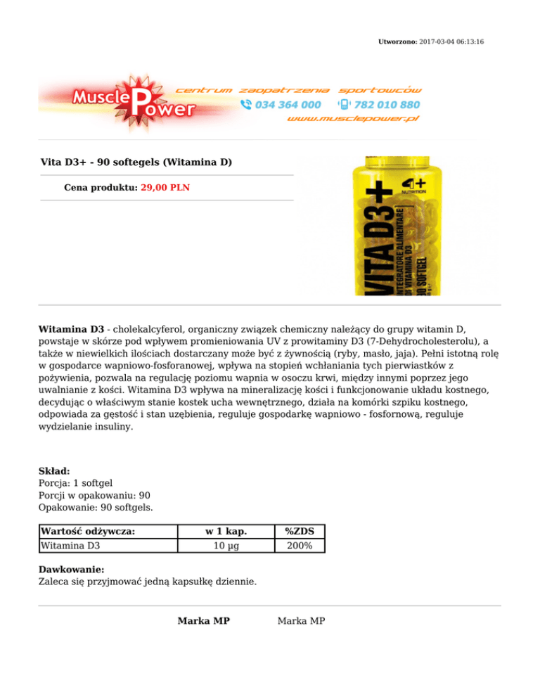 Utworzono: 2017-03-04 06:13:16 Vita D3+ - 90 softegels (Witamina D) Cena produktu: 29,00 PLN Witamina D3 - cholekalcyferol, organiczny związek chemiczny należący do grupy witamin D, powstaje w skórze pod wpływem promieniowania UV z prowitaminy D3 (7-Dehydrocholesterolu), a także w niewielkich ilościach dostarczany może być z żywnością (ryby, masło, jaja). Pełni istotną rolę w gospodarce wapniowo-fosforanowej, wpływa na stopień wchłaniania tych pierwiastków z pożywienia, pozwala na regulację poziomu wapnia w osoczu krwi, między innymi poprzez jego uwalnianie z kości. Witamina D3 wpływa na mineralizację kości i funkcjonowanie układu kostnego, decydując o właściwym stanie kostek ucha wewnętrznego, działa na komórki szpiku kostnego, odpowiada za gęstość i stan uzębienia, reguluje gospodarkę wapniowo - fosfornową, reguluje wydzielanie insuliny. Skład: Porcja: 1 softgel Porcji w opakowaniu: 90 Opakowanie: 90 softgels. Wartość odżywcza: Witamina D3 w 1 kap. %ZDS 10 µg 200% Dawkowanie: Zaleca się przyjmować jedną kapsułkę dziennie. Marka MP Marka MP Adres: http://www.muscle.trustnet.pl/ Telefon: 34 36 43 000, 782 010 880 Email: [email protected]