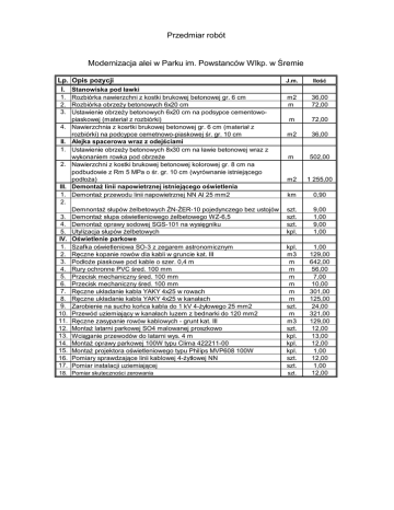 Przedmiar robót Modernizacja alei w Parku im. Powstanców Wlkp. w Śremie Lp. Opis pozycji I. Stanowiska pod ławki J.m. Ilość 1. Rozbiórka nawierzchni z kostki brukowej betonowej gr. 6 cm 2. Rozbiórka obrzeży betonowych 6x20 cm 3. Ustawienie obrzeży betonowych 6x20 cm na podsypce cementowopiaskowej (materiał z rozbiórki) 4. Nawierzchnia z kosrtki brukowej betonowej gr. 6 cm (materiał z rozbiórki) na podcypce cemetnowo-piaskowej śr. gr. 10 cm II. Alejka spacerowa wraz z odejściami 1. Ustawienie obrzeży betonowych 8x30 cm na ławie betonowej wraz z wykonaniem rowka pod obrzeże 2. Nawierzchni z kostki brukowej betonowej kolorowej gr. 8 cm na podbudowie z Rm 5 MPa o śr. gr. 10 cm (wyrównanie istniejącego podłoża) III. Demontaż linii napowietrznej istniejącego oświetlenia 1. Demontaż przewodu linii napowietrznej NN Al 25 mm2 2. Demnontaż słupów żelbetowych ŻN-ŻER-10 pojedynczego bez ustojów 3. Demontaż słupa oświetleniowego żelbetowego WZ-6,5 4. Demontaż oprawy sodowej SGS-101 na wysięgniku 5. Utylizacja słupów żelbetowych IV. Oświetlenie parkowe 1. Szafka oświetleniowa SO-3 z zegarem astronomicznym 2. Ręczne kopanie rowów dla kabli w gruncie kat. III 3. Podłoże piaskowe pod kable o szer. 0,4 m 4. Rury ochronne PVC śred. 100 mm 5. Przecisk mechaniczny śred. 100 mm 6. Przecisk mechaniczny śred. 100 mm 7. Ręczne układanie kabla YAKY 4x25 w rowach 8. Ręczne układanie kabla YAKY 4x25 w kanałach 9. Zarobienie na sucho końca kabla do 1 kV 4-żyłowego 25 mm2 10. Przewód uziemiający w kanałach luzem z bednarki do 120 mm2 11. Ręczne zasypanie rowów kablowych - grunt kat. III 12. Montaż latarni parkowej SO4 malowanej proszkowo 13. Wciąganie przewodów do latarni wys. 4 m 14. Montaż oprawy parkowej 100W typu Clima 422211-00 15. Montaż projektora oświetleniowego typu Philips MVP608 100W 16. Pomiary sprawdzające linii kablowej 4-żytłowej NN 17. Pomiar instalacji uziemiającej m2 m 36,00 72,00 m 72,00 m2 36,00 m 502,00 m2 1 255,00 km 0,90 szt. szt. szt. kpl. 9,00 1,00 9,00 1,00 kpl. m3 m m m m m m szt. m m3 szt. kpl. kpl. kpl. szt. szt. 1,00 129,00 642,00 56,00 7,00 10,00 301,00 125,00 24,00 321,00 129,00 12,00 13,00 12,00 1,00 12,00 1,00 12,00 18. Pomiar skuteczności zerowania szt.