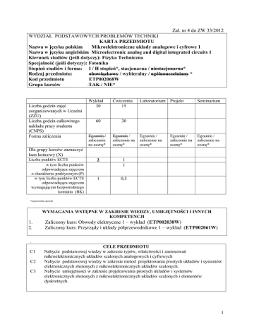 Zał. nr 4 do ZW 33/2012 WYDZIAŁ PODSTAWOWYCH PROBLEMÓW TECHNIKI KARTA PRZEDMIOTU Nazwa w języku polskim Mikroelektroniczne układy analogowe i cyfrowe 1 Nazwa w języku angielskim Microelectronic analog and digital integrated circuits 1 Kierunek studiów (jeśli dotyczy): Fizyka Techniczna Specjalność (jeśli dotyczy): Fotonika Stopień studiów i forma: I / II stopień*, stacjonarna / niestacjonarna* Rodzaj przedmiotu: obowiązkowy / wybieralny / ogólnouczelniany * Kod przedmiotu ETP002068W Grupa kursów TAK / NIE* Liczba godzin zajęć zorganizowanych w Uczelni (ZZU) Liczba godzin całkowitego nakładu pracy studenta (CNPS) Forma zaliczenia Wykład 30 Ćwiczenia 15 60 30 Egzamin / zaliczenie na ocenę* Egzamin / zaliczenie na ocenę* 2 1 1 1 0,5 Laboratorium Projekt Seminarium Egzamin / zaliczenie na ocenę* Egzamin / zaliczenie na ocenę* Egzamin / zaliczenie na ocenę* Dla grupy kursów zaznaczyć kurs końcowy (X) Liczba punktów ECTS w tym liczba punktów odpowiadająca zajęciom o charakterze praktycznym (P) w tym liczba punktów ECTS odpowiadająca zajęciom wymagającym bezpośredniego kontaktu (BK) *niepotrzebne skreślić WYMAGANIA WSTĘPNE W ZAKRESIE WIEDZY, UMIEJĘTNOŚCI I INNYCH KOMPETENCJI 1. 2. Zaliczony kurs: Obwody elektryczne 1 – wykład (ETP002038W) Zaliczony kurs: Przyrządy i układy półprzewodnikowe 1 – wykład (ETP002061W) \ C1 C2 C3 CELE PRZEDMIOTU Nabycie podstawowej wiedzy w zakresie typów, właściwości i zastosowań mikroelektronicznych układów scalonych analogowych i cyfrowych Nabycie podstawowej wiedzy w zakresie metod projektowania prostych układów i systemów elektronicznych złożonych z mikroelektronicznych układów scalonych. Nabycie umiejętności w zakresie projektowania prostych układów i systemów elektronicznych złożonych z mikroelektronicznych układów scalonych i elementów dyskretnych. 1 PRZEDMIOTOWE EFEKTY KSZTAŁCENIA Z zakresu wiedzy: PEK_W01 Ma podstawową wiedzę w zakresie typów, właściwości i parametrów projektowych analogowych i cyfrowych układów mikroelektronicznych PEK_W02 Ma podstawową wiedzę w zakresie metod obliczania prostych układów oraz systemów elektronicznych i optoelektronicznych z elementami dyskretnym i układami scalonymi Z zakresu umiejętności: PEK_U01 Potrafi zastosować poznane metody do obliczania prostych układów elektronicznych i optoelektronicznych z układami scalonymi i elementami dyskretnymi Z zakresu kompetencji społecznych: PEK_K01 Rozumie potrzebę samodzielnego dokształcania, wykorzystuje współczesne środki przekazu do pozyskiwania potrzebnych informacji TREŚCI PROGRAMOWE Wy1 Wy2 Wy3 Wy4 Wy5 Wy6 Wy7 Forma zajęć - wykład Program wykładu, warunki zaliczenia. Sposoby opisu układów elektronicznych. Podstawowe elementy półprzewodnikowe – diody prostownicze, Zenera, pojemnościowe, LED, lasery diodowe. Tranzystory bipolarne, proste układy, metody rachunkowe. Wzmacniacze tranzystorowe, uproszczona metodyka analizy tych układów. Tranzystor jako klucz elektroniczny. Tranzystory polowe JFET, MOSFET jako podstawa technologii układów scalonych. Inwerter CMOS. Tranzystorowy wzmacniacz różnicowy – podstawowy element wzmacniaczy operacyjnych, uproszczona analiza, właściwości struktur różnicowych. Wzmacniacz operacyjny, modele wzmacniacza idealnego i rzeczywistego. Równania Kirchhoffa wzmacniacza ze sprzężeniem zwrotnym, układ wzmacniający odwracający i nieodwracający. Sprzężenie zwrotne, zasada sprzężenia zwrotnego, czwórnikowy schemat blokowy, równania. Podstawowe typy ujemnego sprzężenia zwrotnego ujemnego (USZ). Właściwości układów z USZ. Właściwości częstotliwościowe wzmacniaczy operacyjnych – charakterystyki częstotliwościowe. Odpowiedź na skok jednostkowy, współczynnik Slew Rate. Wymiana wzmocnienia i pasma. Przykłady prostych filtrów aktywnych RC I i II rzędu i ich charakterystyki częstotliwościowe. Wykresy Bodego. Dodatnie sprzężenie zwrotne w układach ze wzmacniaczami Wy9 operacyjnymi, generatory sygnałów sinusoidalnych RC i LC. Układy wzmacniaczy operacyjnych z elementami nieliniowymi. Wy10 Struktury złożone ze wzmacniaczy operacyjnych. Wzmacniacze Wy8 Liczba godzin 2 2 2 2 2 2 2 2 2 2 2 Wy11 Wy12 Wy13 Wy14 Wy15 instrumentalne. Wzmacniacze rail - to – rail, w pełni różnicowe, o małym poborze energii, z pojedynczym zasilaniem. Komparator napięcia, komparator napięcia z histerezą, charakterystyki. Przetwornik cyfrowo – analogowy, układ ze źródłami prądowymi. Przetwornik cyfrowo – analogowy z siecią rezystorów. Przetwornik analogowo-cyfrowy z podwójnym całkowaniem. Przetworniki analogowo-cyfrowe typu flash oraz z kompensacją wagową. Przetworniki analogowo-cyfrowe. Schematy blokowe, zasady działania, właściwości. Sygnały i układy logiczne. Standard sygnałów TTL. Układy scalone SSI. Funkcje logiczne, podstawowe funktory. Tablice prawdy. Kody binarne. Zaliczenie. Suma godzin Forma zajęć - ćwiczenia Ćw1 Ćw2 Ćw3 Ćw4 Ćw5 Ćw6 Ćw7 Ćw8 Ćw9 Ćw10 Ćw11 Ćw12 Ćw13 Ćw14 Ćw15 2 2 2 2 2 30 Liczba godzin Obliczanie układów z diodami prostowniczymi i przełączającymi oraz diodami LED. Stabilizatory napięcia. Układy, obliczanie. Obliczanie układów tranzystorowych 1 – wzmacniacz w układzie WE. Podstawowe zasady. Obliczanie układów tranzystorowych 2 – wzmacniacz w układzie WE. Wzmacniacz różnicowy. Wtórnik napięcia, źródło prądowe, klucz tranzystorowy, układ Darlingtona. Wzmacniacz operacyjny, układy ze sprzężeniem zwrotnym 1 – metody obliczeniowe. Wzmacniacz operacyjny, układy ze sprzężeniem zwrotnym 2 – przykłady projektowo – obliczeniowe. Wyznaczanie charakterystyk częstotliwościowych układów ze sprzężeniem zwrotnym. Przetworniki sygnałów I/U. Współpraca z czujnikami o wyjściu prądowym Źródła prądowe, VCCS. Uklad NIC. Generator napięcia sinusoidalnego – z mostkiem Wiena, oscylatory z obwodami rezonansowymi. Generat