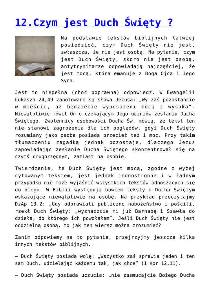 12.Czym jest Duch Święty ? Na podstawie tekstów biblijnych łatwiej powiedzieć, czym Duch Święty nie jest, zwłaszcza, że nie jest osobą. Na pytanie, czym jest Duch Święty, skoro nie jest osobą, antytrynitarze odpowiadają najczęściej, że jest mocą, która emanuje z Boga Ojca i Jego Syna. Jest to niepełna (choć poprawna) odpowiedź. W Ewangelii Łukasza 24,49 zanotowane są słowa Jezusa: „Wy zaś pozostańcie w mieście, aż będziecie wyposażeni mocą z wysoka”. Niewątpliwie mówił On o czekającym Jego uczniów zesłaniu Ducha Świętego. Zwolennicy osobowości Ducha Św. mówią, że tekst ten nie stanowi zagrożenia dla ich poglądów, gdyż Duch Święty rozumiany jako osoba posiada przecież też i moc. Przy takim tłumaczeniu zagadką jednak pozostaje, dlaczego Jezus zapowiadając zesłanie Ducha Świętego skoncentrował się na czymś drugorzędnym, zamiast na osobie. Twierdzenie, że Duch Święty jest mocą, zgodne z wyżej cytowanym tekstem, jest jednak jednostronne i w żadnym przypadku nie może wyjaśnić wszystkich tekstów odnoszących się do niego. W Biblii występują bowiem teksty o Duchu Świętym wskazujące niewątpliwie na osobę. Na przykład przeczytajmy DzAp 13.2: „Gdy odprawiali publiczne nabożeństwo i pościli, rzekł Duch Święty: „wyznaczcie mi już Barnabę i Szawła do dzieła, do którego ich powołałem”. Jeśli Duch Święty nie jest oddzielną osobą, to jak ten wiersz można zrozumieć? Zanim odpowiemy na to pytanie, przejrzyjmy jeszcze kilka innych tekstów biblijnych. – Duch Święty posiada wolę: „Wszystko zaś sprawia jeden i ten sam Duch, udzielając każdemu tak, jak chce” (1 Kor 12,11). – Duch Święty posiada uczucia: „nie zasmucajcie Bożego Ducha Świętego, którym zostaliście odkupienia” (Ef 4,30). zapieczętowani na dzień Są to chyba najsilniejsze teksty zwolenników osobowości Ducha Świętego (obok wspominanego już fragmentu o ParakleciePocieszycielu). Inne, a przytaczane czasami przez trynitarian, tego typu teksty są wielokrotnie słabsze – odnoszą się albo do ducha ludzkiego (np. Ef 1,17; 2 Tym 1,7), albo nie wynika z nich to, co ma wynikać (na przykład jak z tego, że Duch Święty ma moc, wynika, że jest osobą? (patrz DzAp 1,8), albo też konkluzja wyprowadzana niezgodna jest z innymi podstawowymi prawdami biblijnymi (jeśli z przyczyniania się za świętymi, patrz Rz 8,26-27, wynika, że Duch Święty jest osobą, to stoi to w sprzeczności z twierdzeniem, że Jezus jest jedynym pośrednikiem między Bogiem a ludźmi, patrz 1 Tym 2,5). Nie można jednak zaprzeczyć, że przynajmniej trzy wyżej zacytowane teksty mówiąc o Duchu Świętym bez wątpienia odnoszą się do osoby (DzAp 13,2; 1 Kor 12,11; Ef 4,30). Można się też zgodzić, że listę tę można rozszerzyć. Czy odnoszą się one tylko do mocy Bożej? Ale jak na przykład można zasmucić moc? Czy jednak takie wiersze stanowią rozstrzygający dowód osobowości Ducha Świętego? Mogą one (choć nie muszą, jak niżej zobaczymy) być przykładami pewnej figury mowy znanej jako personifikacja. Personifikacja polega na przypisywaniu ludzkich własności przedmiotem nieożywionym, aby ubarwić opis lub dodać mu życia. Biblia od czasu do czasu używa takiego narzędzia literackiego, ale niekoniecznie musimy uciekać się do takiego tłumaczenia. O Duchu Świętym czasami mówi się jakby o osobie, ponieważ jest w pewnym sensie przedłużeniem osoby – osoby Boga Ojca lub Jego Syna. Kiedy Biblia wspomina, że Duch Święty powiedział, postąpił, przypomniał czy w jakiś inny sposób zadziałał jak osoba, to mówi nam ona, że Ojciec lub Syn uczynili coś (przy pomocy Ich duchowej mocy – Ducha Bożego). A więc zasmucić Ducha Świętego, to zasmucić Ducha Bożego i Ducha Chrystusowego czyli po prostu Ojca i Chrystusa. Zwróćmy zresztą uwagę, że o zasmucaniu Ducha Świętego czytamy także i w Starym Testamencie: „Lecz oni się zbuntowali i zasmucili Jego świętego Ducha” (Iz 63,10). A przecież cytowaliśmy opinie biblistów katolickich, zwolenników osobowości Ducha Świętego, że „żaden tekst Starego Testamentu nie mówi o Duchu Bożym jako o osobie”11). Jeśli tekst o zasmucaniu Ducha Świętego w Starym Testamencie nie stanowi dowodu, że jest on osobą, to dlaczego ma być inaczej w Nowym Testamencie? Istnieją więc teksty biblijne mówiące o Duchu Świętym i wskazujące przy tym osobę. Ale wskazują one na osobę Boga Ojca bądź Jezusa Chrystusa, a nie na jakąś trzecią osobę. Upewnijmy się o tym czytając 1 Kor 2,11: „Kto zaś z ludzi zna to, co ludzkie, jeżeli nie duch, który jest w człowieku? Podobnie i tego, co Boskie, nie zna nikt, tylko Duch Boży”. Gdyby mowa tu była rzeczywiście o trzeciej osobie Trójcy Świętej, to wynikałoby, że tylko ona, a nie pierwsza (Bóg Ojciec), ani druga (Jezus Chrystus), zna to, co Boskie – a to jest absurd. Zwróćmy też uwagę na słowo „podobnie”. Świadczy ono, że relacja między człowiekiem i jego duchem jest podobna do relacji między Bogiem i Jego Duchem. Jak w przypadku człowieka nie można mówić, że jego duch stanowi odrębną osobę, tak nie można tego twierdzić w przypadku Boga. 11) Encyklopedia Katolicka, t.4 szp.280-281, patrz też wyżej ods. 7 i 8 TRÓJCA ŚWIĘTA – MIT CZY RZECZYWISTOŚĆ ?