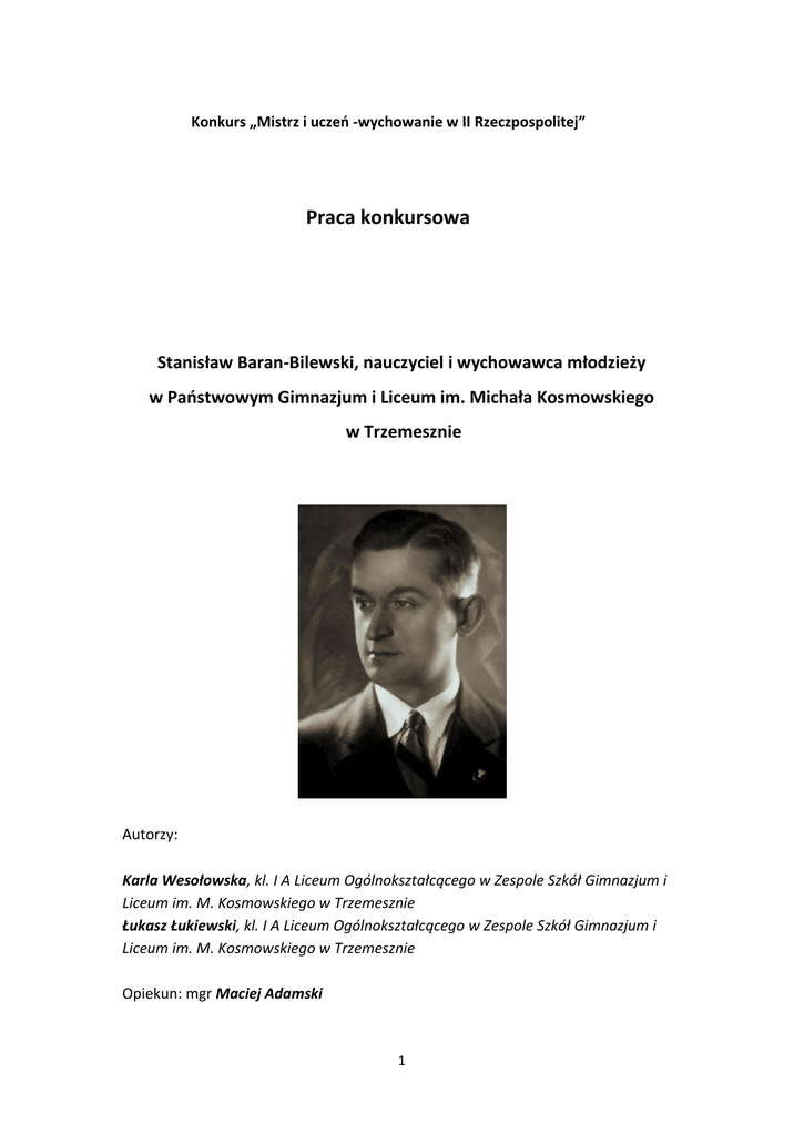 Konkurs „Mistrz i uczeń -wychowanie w II Rzeczpospolitej” Praca konkursowa Stanisław Baran-Bilewski, nauczyciel i wychowawca młodzieży w Państwowym Gimnazjum i Liceum im. Michała Kosmowskiego w Trzemesznie Autorzy: Karla Wesołowska, kl. I A Liceum Ogólnokształcącego w Zespole Szkół Gimnazjum i Liceum im. M. Kosmowskiego w Trzemesznie Łukasz Łukiewski, kl. I A Liceum Ogólnokształcącego w Zespole Szkół Gimnazjum i Liceum im. M. Kosmowskiego w Trzemesznie Opiekun: mgr Maciej Adamski 1 Powstanie niepodległej Rzeczpospolitej w 1918 roku było spełnieniem marzeń wielu pokoleń Polaków. Choć przetrwała nieco ponad 20 lat to i tak był to okres znaczący w dziejach państwa i narodu. W dwudziestoleciu międzywojennym Polska mogła poszczycić się wieloma osiągnięciami jak na przykład: budowa portu w Gdyni, budowa Centralnego Okręgu Przemysłowego i magistrali węglowej. Udało się scalić trzy różne systemy administracyjne odziedziczone po zaborcach, przeprowadzono reformę walutową, rozwijano oświatę oraz przemysł. Wiele osób twierdzi, że najwspanialszym osiągnięciem II Rzeczpospolitej było wychowanie młodego pokolenia, które celująco zdało egzamin podczas II wojny światowej. Stało się tak, dzięki szkołom i pracujących w nich nauczycielom, których często można określić mianem Mistrzów. Jedną z takich szkół było Państwowe Gimnazjum i Liceum im. Michała Kosmowskiego w Trzemesznie. We wspomnieniach uczniów z tamtego okresu przewija się wielu wspaniałych profesorów, by wspomnieć tylko Jana Weissa, ks. Edmunda Gierczyńskiego, Józefa Jakubowskiego oraz Stanisława Barana-Bilewskiego. Szczególnie ta ostania postać wydaje nam się warta przypomnienia. W swoich badaniach dotarliśmy do rodziny profesora Bilewskiego- jego syna Jerzego Bilewskiego i wnuka Artura Bilewskiego. W Izbie Tradycji Szkoły oraz w szkolnej bibliotece szukaliśmy dokumentów związanych z naszym bohaterem. Pomocne było również IV Sprawozdanie Dyrekcji Państwowego Gimnazjum Klasycznego w Trzemesznie za lata 1929-32. Ciekawym dokumentem jest ocalała Kronika klasowa od roku szkolnego 1929/30 do roku 1934/35, dzięki której możemy śledzić losy szkoły z perspektywy ówczesnego ucznia. Pewne informacje o naszym bohaterze znajdujemy również w wydanych w 1999 roku wspomnieniach Lecha Weissa oraz artykule Artura Bilewskiego pt. Moja rodzina, moja ziemia, moja Szkoła- o Stanisławie Baranie Bilewskim wspomnienia rodzinne. Niestety, jak zauważa Jan Majewski, jeśli chodzi o działalność wychowawczą szkoły to szczegółową „charakterystykę działalności uniemożliwia brak dokumentacji źródłowej z lat 1934/35 – 1938/39.1” Niemniej na podstawie zachowanych dokumentów oraz 1 Jan Majewski, Trzemeszeńskie gimnazjum w okresie międzywojennym 1918-1939 [w] Alma Mater Tremesnensis praca zbiorowa pod redakcją Jana Leśnego i Czesława Łuczaka, Poznań 1996, s. 148. 2 opowieści rodzinnych udało się nam zbudować niniejszą pracę i odtworzyć losy Stanisława Barana-Bilewskiego. Stanisław Baran-Bilewski (1904-1958). Zdjęcie z archiwum p. A. Bilewskiego. Stanisław Baran-Bilewski urodził się 1 maja 1904 roku w Racławówce w powiecie rzeszowskim. Jego ojciec był pracownikiem kolei państwowych, Stanisław miał sześcioro rodzeństwa. Wszyscy bardzo uzdolnieni sportowo. Stanisław mimo wielu przeciwieństw ukończył szkołę średnią w Rzeszowie, gdzie stawiał również pierwsze kroki sportowe na staroniwskim stadionie Resovii. Jagiellońskim. Niestety Po maturze rozpoczyna studia na Uniwersytecie śmierć ojca zmusza go do przerwania nauki w Krakowie. Przeprowadza się do Poznania, gdzie zaczął pracować na własne utrzymanie. Podziękowania współpracę otrzymane do klubu Warta. Dokument z archiwum p. A. Bilewskiego. 3 za Nie przerywa jednak studiów i rozpoczyna naukę na Wydziale MatematycznoPrzyrodniczym Uniwersytetu Poznańskiego. Aktywnie działa również w klubie sportowym „Warta”, za co dostaje wiele podziękowań, znajdujących się do dzisiaj w rodzinnych archiwach. 16 czerwca 1930 roku broni pracę magisterską pod tytułem „Pająki okolicy Rzeszowa”, uzyskując za nią ocenę bardzo dobrą, w związku z czym na wniosek Komisji Egzaminacyjnej otrzymuje stopień magistra filozofii jako dowód zakończenia studiów wyższych w zakresie zoologii. Dyplom magisterski Stanisława Barana-Bilewskiego, ze zbiorów p. Artura Bilewskiego. 4 Pracę zawodową jako nauczyciel rozpoczyna w 1930 roku w Gimnazjum im. Karola Marcinkowskiego w Poznaniu, a następnie zostaje przeniesiony do gimnazjum w Wolsztynie. Nie pracuje tam jednak zbyt długo. 3 marca 1932 roku Stanisław Baran zaczyna pracę w Państwowym Gimnazjum Klasycznym w Trzemesznie, w szkole, z którą związał się do czasu swojej śmierci w 1958 roku. IV Sprawozdanie Dyrekcji Państwowego Gimnazjum Klasycznego w Trzemesznie za lata 1929-32, s. 45 Trzemeszeńska szkoła należy do grona najstarszych szkół średnich w Polsce. Została otwarta w 1776 roku jako Collegium Tremesnense, i była podporządkowana Komisji Edukacji Narodowej. Mimo czasów zaborów miała polski charakter. Aż do 1863 r. większość nauczycieli stanowili Polacy. W XIX w. uczniowie działali w wielu tajnych stowarzyszeniach takich jak: Sarmatia, Towarzystwo Promienistych czy Towarzystwo Narodowe. Nie było powstania narodowego, w którym uczniowie i nauczyciele nie braliby udziału. W 1848 roku gmach szkolny stał się szpitalem powstańczym. Natomiast, gdy wybuchło powstanie styczniowe ponad 60 uczniów 28 lutego 1863 roku wyruszyło z Trzemeszna by wspomóc walczących w Królestwie Polskim. Zdarzenie to zyskało miano Wyprawy Trzemeszeńskiej. W odwecie władze pruskie zamknęły szkołę na 3 lata, a następnie zdegradowały do kategorii 5 progimnazjum. Wśród absolwentów i wychowanków były tak znane postacie jak: ojciec polskiej chemii Jędrzej Śniadecki, Hipolit Cegielski, mat