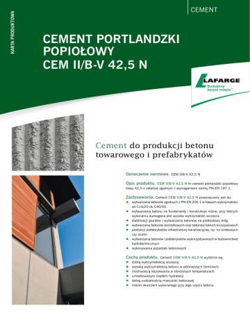 KARTA PRODUKTOWA CEMENT CEMENT PORTLANDZKI POPIOŁOWY CEM II/B-V 42,5 N Cement do produkcji betonu towarowego i prefabrykatów Oznaczenie normowe. CEM II/B-V 42,5 N Opis produktu. CEM II/B-V 42,5 N to cement portlandzki popiołowy klasy 42,5 o składzie zgodnym z wymaganiami normy PN-EN 197-1. Zastosowania. Cement CEM II/B-V 42,5 N przeznaczony jest do: wytwarzania betonów zgodnych z PN-EN 206-1 w klasach wytrzymałości od C16/20 do C40/50 wytwarzania betonu na fundamenty i konstrukcje nośne, przy których wykonaniu wymagana jest wysoka wytrzymałość wczesna stabilizacji gruntów i wytwarzania betonów na podbudowy dróg wytwarzania betonów komórkowych oraz betonów lekkich kruszywowych produkcji prefabrykatów infrastruktury kanalizacyjnej, np. rur ściekowych czy studni wytwarzania betonów i prefabrykatów wykorzystywanych w budownictwie hydrotechnicznym wykonywania posadzek betonowych Cechy produktu. Cement CEM II/B-V 42,5 N wyróżnia się: dobrą wytrzymałością wczesną wysoką wytrzymałością betonu w późniejszych terminach możliwością dojrzewania w obniżonych temperaturach umiarkowanym ciepłem hydratacji dobrą urabialnością mieszanki betonowej niskim skurczem wykonanego przy jego użyciu betonu Korzyści z zastosowania produktu. Użycie cementu CEM II/B-V 42,5 N: skraca czas budowy oraz proces produkcji prefabrykatów dzięki szybszemu rozformowaniu elementów konstrukcji i prefabrykatów poprawia urabialność i pompowalność świeżej mieszanki betonowej, ogranicza zużycie energii potrzebnej do dobrego zagęszczenia mieszanki wydłuża okres, w którym możliwe jest prowadzenie prac betoniarskich ogranicza koszty związane z nagrzewaniem świeżej i dojrzewającej mieszanki betonowej Warunki stosowania. Cement CEM II/B-V 42,5 N przy dozowaniu zgodnym z europejską normą PN-EN 206-1 oraz polską PN-B-06265 może być stosowany we wszystkich klasach ekspozycji - oddziaływania środowiska na beton z wyjątkiem klas XA2 oraz XA3 tj. agresji chemicznej wywołanej siarczanami (z wyjątkiem ich pochodzenia morskiego) oraz z wyjątkiem klas ekspozycji XF2, XF3 oraz XF4, tj. nie powinien być stosowany w warunkach umiarkowanego i silnego nasycenia elementu betonowego wodą (również z solami odladzającymi) i poddawania go intensywnemu cyklicznemu zamrażaniu i rozmrażaniu. Zdrowie i bezpieczeństwo. Cement jest sklasyfikowany jako substancja drażniąca. Częste wdychanie dużych ilości pyłu cementowego może powodować ryzyko wystąpienia chorób. Kontakt cementu (suchego lub mokrego) z oczami może powodować poważne i nieodwracalne obrażenia. Dodatkowe informacje, w tym dotyczące kontroli rozpuszczalnego chromu sześciowartościowego, zawarte są w Karcie Charakterystyki dla Cementu zamieszczonej na stronie www.lafarge.pl. Gwarancja. Cement CEM II/B-V 42,5 N objęty jest 60-dniową gwarancją obejmującą utrzymanie normowych parametrów jakościowych i redukcji Cr(VI). Warunki przechowywania. Okres przechowywania w zbiornikach lub silosach nie powinien być dłuższy od okresu gwarantowanego utrzymania parametrów jakościowych. Rekomendacja Techniczna IBDiM RT/2011-02-0079 dla cementu CEM II/B-V 42,5 N dostępna jest na stronie www.lafarge.pl. Właściwości fizyko-chemiczne produktu (wartości średnie)* Powierzchnia właściwa wytwarzanego w cementowni Kujawy wytwarzanego w cementowni Małogoszcz 4 820 cm2/g 4 467 cm2/g Początek czasu wiązania 178 min 230 min Koniec czasu wiązania 234 min 306 min Wytrzymałość na ściskanie po 2 dniach, badana zgodnie z PN-EN 196-1 26,0 MPa 26,1 MPa Wytrzymałość na ściskanie po 28 dniach, badana zgodnie z PN-EN 196-1 49,0 MPa 53,8 MPa Gęstość właściwa 2,74 g/cm3 2,86 g/cm3 29,6% 31,9% Zawartość siarczanów SO3 2,82% 2,76% Zawartość chlorków Cl 0,060% 0,065% Zawartość alkaliów (eq Na2O) 1,25% 1,23% Wodożądność - * Podane wartości są wartościami średnimi za okres od VI do XI 2013 r. Wartości te nie są gwarantowane przez producenta, nie stanowią oferty w rozumieniu przepisów kodeksu cywilnego i nie mogą stanowić podstaw do jakichkolwiek roszczeń. LAFARGE CEMENT SA ul. Warszawska 110 28-366 Małogoszcz 01.2014 www.lafarge.pl Telefony Doradztwo techniczne tel. +48 41 248 75 33