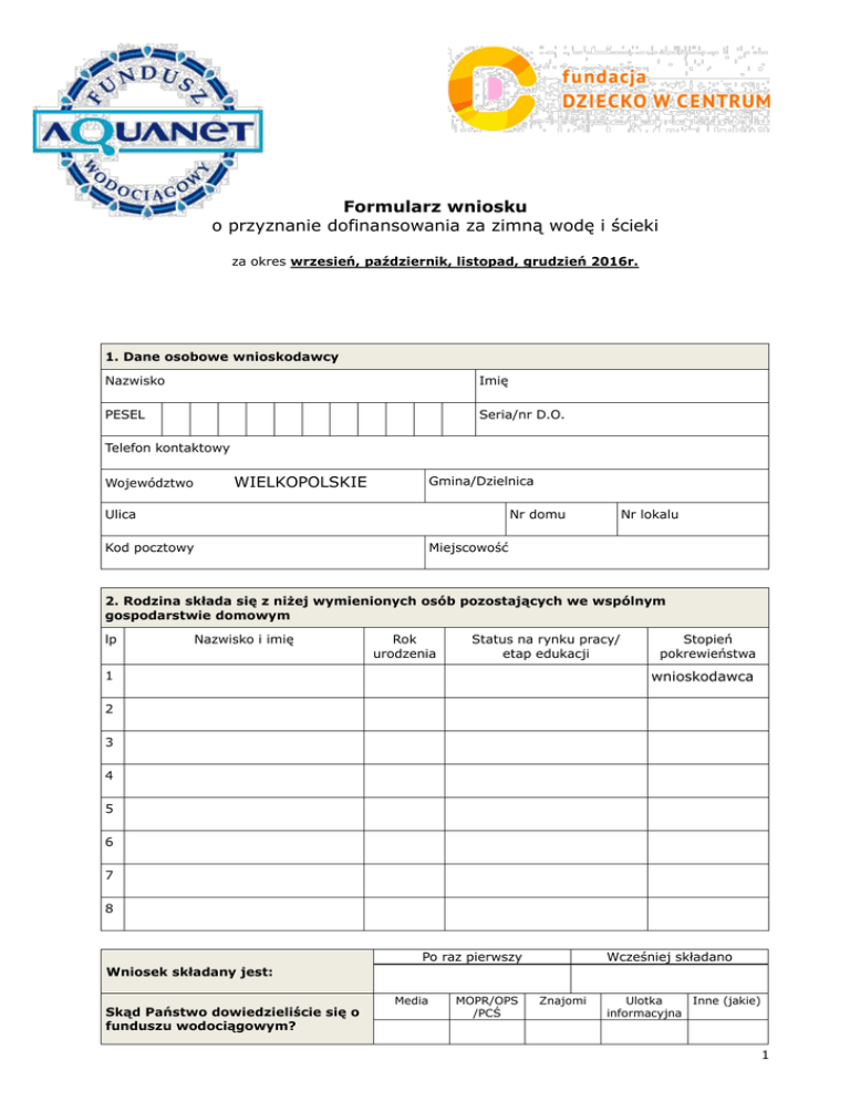 Formularz wniosku o przyznanie dofinansowania za zimną wodę i ścieki za okres wrzesień, październik, listopad, grudzień 2016r. 1. Dane osobowe wnioskodawcy Nazwisko Imię PESEL Seria/nr D.O. Telefon kontaktowy Województwo WIELKOPOLSKIE Gmina/Dzielnica Ulica Nr domu Kod pocztowy Nr lokalu Miejscowość 2. Rodzina składa się z niżej wymienionych osób pozostających we wspólnym gospodarstwie domowym lp Nazwisko i imię Rok urodzenia Status na rynku pracy/ etap edukacji Stopień pokrewieństwa wnioskodawca 1 2 3 4 5 6 7 8 Po raz pierwszy Wcześniej składano Wniosek składany jest: Skąd Państwo dowiedzieliście się o funduszu wodociągowym? Media MOPR/OPS /PCŚ Znajomi Ulotka Inne (jakie) informacyjna 1 3. Średni dochód netto członków rodziny pozostających we wspólnym gospodarstwie domowym (WPISUJEMY ŚREDNIĄ Z TRZECH OSTATNICH MIESIĘCY) Kto Wymagane 3.1 Dochody opodatkowane uzyskuje? dokumenty Ze stosunku pracy …………..…………………zł Zaświadczenie o zatrudnieniu i zarobkach z zakładu pracy ………………………………zł Z umowy zlecenia lub o dzieło Z tytułu renty ………………………………zł ………………………………zł Umowa lub rachunek Odcinek świadczenia lub decyzja ………………………………zł Z tytułu emerytury ……………………………..zł Odcinek świadczenia lub decyzja ……………………………….zł Świadczeń przedemerytalnych Zasiłek dla bezrobotnych ………………………………zł ………………………………zł Odcinek świadczenia lub decyzja Zaświadczenie z PUP 3.2 Dochody nieopodatkowane Wymagane dokumenty Zasiłek okresowy/stały Decyzja lub zaświadczenie z MOPR Dodatek mieszkaniowy ………………………………zł ………………………………zł Decyzja przyznająca dodatek mieszkaniowy z PCŚ ………………………………zł 3.3 Inne dochody / świadczenia socjalne Stypendium socjalne Wymagane dokumenty …………………………………zł …………………………………zł 4. Łączny dochód netto: 5. Na osobę: …………………………………zł …………………………………zł 6. Inne ważne informacje mające wpływ na sytuację wnioskodawcy. Poinformowano mnie o odpowiedzialności karnej za oświadczenie nieprawdy, na podstawie art. 233 § 1 i 2 ustawy z dnia 6 czerwca 1997r.Kodeks Karny (Dz. U. z 1997r. Nr 88, poz. 533). Wyrażam zgodę na przetwarzanie moich danych osobowych w ramach projektu „Fundusz Wodociągowy Aquanet”. ……………………………… Data i podpis wnioskodawcy 2 DECYZJA WYPEŁNIA PRACOWNIK FUNDACJI 1. Dane osobowe wnioskodawcy Nr wniosku Nazwisko Imię Łączny dochód netto gospodarstwa domowego ………………………………zł Liczba osób w gospodarstwie domowym Miesięczna wysokość dochodu netto na jedną osobę ………………………………zł Maksymalna procentowa wartość pomocy Decyzja Częściowe pokrycie zobowiązania (decyzja pozytywna) Odrzucenie wniosku (decyzja negatywna) Uzasadnienie (sposób wyliczenia przyznanej pomocy/powód odmowy): Kwota przyznana: Właściciel rachunku: Adres właściciela rachunku: Nr rachunku: Podpis Pracownika Data decyzji: 3