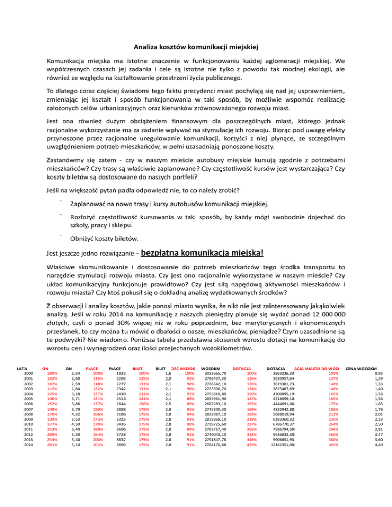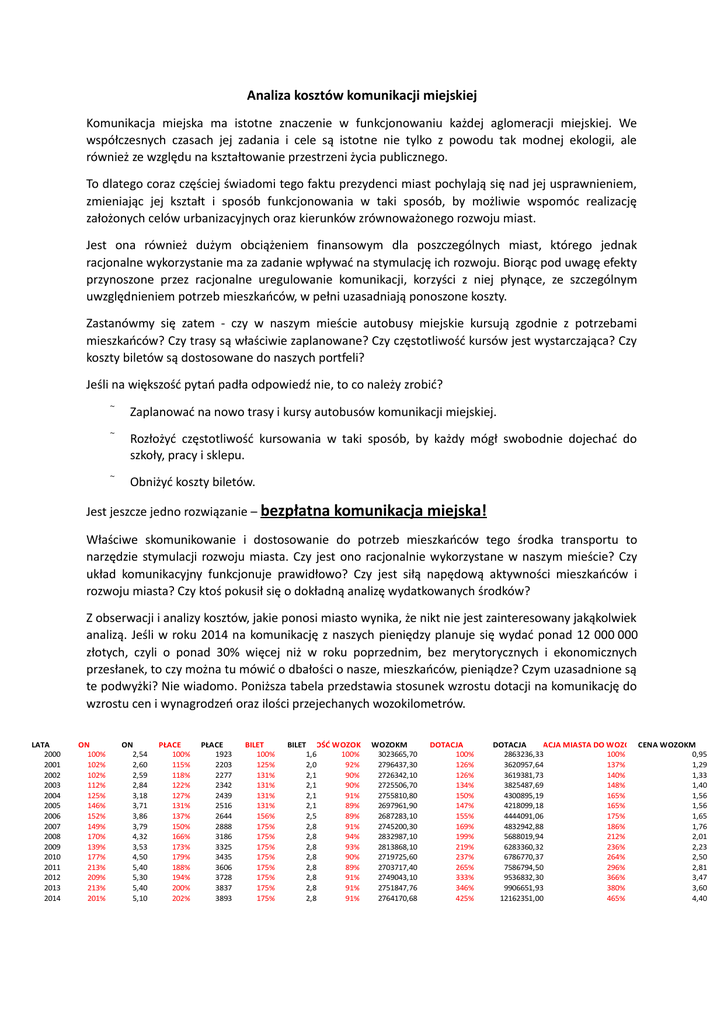 Analiza kosztów komunikacji miejskiej Komunikacja miejska ma istotne znaczenie w funkcjonowaniu każdej aglomeracji miejskiej. We współczesnych czasach jej zadania i cele są istotne nie tylko z powodu tak modnej ekologii, ale również ze względu na kształtowanie przestrzeni życia publicznego. To dlatego coraz częściej świadomi tego faktu prezydenci miast pochylają się nad jej usprawnieniem, zmieniając jej kształt i sposób funkcjonowania w taki sposób, by możliwie wspomóc realizację założonych celów urbanizacyjnych oraz kierunków zrównoważonego rozwoju miast. Jest ona również dużym obciążeniem finansowym dla poszczególnych miast, którego jednak racjonalne wykorzystanie ma za zadanie wpływać na stymulację ich rozwoju. Biorąc pod uwagę efekty przynoszone przez racjonalne uregulowanie komunikacji, korzyści z niej płynące, ze szczególnym uwzględnieniem potrzeb mieszkańców, w pełni uzasadniają ponoszone koszty. Zastanówmy się zatem - czy w naszym mieście autobusy miejskie kursują zgodnie z potrzebami mieszkańców? Czy trasy są właściwie zaplanowane? Czy częstotliwość kursów jest wystarczająca? Czy koszty biletów są dostosowane do naszych portfeli? Jeśli na większość pytań padła odpowiedź nie, to co należy zrobić? Zaplanować na nowo trasy i kursy autobusów komunikacji miejskiej. Rozłożyć częstotliwość kursowania w taki sposób, by każdy mógł swobodnie dojechać do szkoły, pracy i sklepu. Obniżyć koszty biletów. Jest jeszcze jedno rozwiązanie – bezpłatna komunikacja miejska! Właściwe skomunikowanie i dostosowanie do potrzeb mieszkańców tego środka transportu to narzędzie stymulacji rozwoju miasta. Czy jest ono racjonalnie wykorzystane w naszym mieście? Czy układ komunikacyjny funkcjonuje prawidłowo? Czy jest siłą napędową aktywności mieszkańców i rozwoju miasta? Czy ktoś pokusił się o dokładną analizę wydatkowanych środków? Z obserwacji i analizy kosztów, jakie ponosi miasto wynika, że nikt nie jest zainteresowany jakąkolwiek analizą. Jeśli w roku 2014 na komunikację z naszych pieniędzy planuje się wydać ponad 12 000 000 złotych, czyli o ponad 30% więcej niż w roku poprzednim, bez merytorycznych i ekonomicznych przesłanek, to czy można tu mówić o dbałości o nasze, mieszkańców, pieniądze? Czym uzasadnione są te podwyżki? Nie wiadomo. Poniższa tabela przedstawia stosunek wzrostu dotacji na komunikację do wzrostu cen i wynagrodzeń oraz ilości przejechanych wozokilometrów. LATA 2000 2001 2002 2003 2004 2005 2006 2007 2008 2009 2010 2011 2012 2013 2014 ON 100% 102% 102% 112% 125% 146% 152% 149% 170% 139% 177% 213% 209% 213% 201% ON 2,54 2,60 2,59 2,84 3,18 3,71 3,86 3,79 4,32 3,53 4,50 5,40 5,30 5,40 5,10 PŁACE 100% 115% 118% 122% 127% 131% 137% 150% 166% 173% 179% 188% 194% 200% 202% PŁACE 1923 2203 2277 2342 2439 2516 2644 2888 3186 3325 3435 3606 3728 3837 3893 BILET 100% 125% 131% 131% 131% 131% 156% 175% 175% 175% 175% 175% 175% 175% 175% BILET ILOŚĆ WOZOKM WOZOKM 1,6 100% 3023665,70 2,0 92% 2796437,30 2,1 90% 2726342,10 2,1 90% 2725506,70 2,1 91% 2755810,80 2,1 89% 2697961,90 2,5 89% 2687283,10 2,8 91% 2745200,30 2,8 94% 2832987,10 2,8 93% 2813868,10 2,8 90% 2719725,60 2,8 89% 2703717,40 2,8 91% 2749043,10 2,8 91% 2751847,76 2,8 91% 2764170,68 DOTACJA 100% 126% 126% 134% 150% 147% 155% 169% 199% 219% 237% 265% 333% 346% 425% DOTACJA DOTACJA MIASTA DO WOZOKM CENA WOZOKM 2863236,33 100% 0,95 3620957,64 137% 1,29 3619381,73 140% 1,33 3825487,69 148% 1,40 4300895,19 165% 1,56 4218099,18 165% 1,56 4444091,06 175% 1,65 4832942,88 186% 1,76 5688019,94 212% 2,01 6283360,32 236% 2,23 6786770,37 264% 2,50 7586794,50 296% 2,81 9536832,30 366% 3,47 9906651,93 380% 3,60 12162351,00 465% 4,40 Jako początek analiz przyjęto rok 2000, w którym miasto (czytaj – prezydent w imieniu mieszkańców) wydało na ten cel nieco ponad 2,8 mln złotych. Jak wynika z wykresu, istotnie do roku 2006-2007 istniała współzależność pomiędzy wzrostem cen paliw i wynagrodzeń a nakładami miasta na utrzymanie komunikacji. Jednak po tym roku nakłady miasta z niejasnych powodów zaczynają zasadniczo odbiegać od sytuacji rynkowej. Co jest o tyle dziwne, że w tym czasie ilość świadczonych usług czyli przejechanych kilometrów spada o 9%. Tak więc gdy ceny paliw wzrastają o 101%, wysokość wynagrodzeń o 102%, to dotacja miasta do wozokilometra o ponad 360%. Może tu należy poszukiwać odpowiedzi dlaczego już tyle miast postanowiło zrezygnować z tego sposobu realizacji zadania? Na taką drogę postanowiły wejść Rybnik, Wodzisław Śląski, Świerklany, Pawłowice Śląskie czy ostatnio Żory. Jakie przyniosło to skutki dla mieszkańców ich miast? Dziś miasto Wodzisław Śląski za każdy kilometr usług komunikacyjnych płaci 3,78 złotego a mieszkaniec bez względu na długość trasy dopłaca 1,40 złotego. Zaznaczyć należy, iż same zmiany dotyczyły sposobu zarządzania nie zaś racjonalizacji transportu. Efekt jednak jest. Taka cena pozwoliła by naszemu miastu zaoszczędzić ponad 1,7 mln złotych przy zachowaniu istniejącej ilości świadczonych usług komunikacyjnych. Miasto Żory, poszło o krok dalej. Nie zrezygnowało zupełnie z obecnego sposobu zarządzania w postaci istniejącego MZK, a jedynie narzuciło mu inne formy działania, oparte o zracjonalizowane zasady transportu publicznego. Dokładnie przygotowane koncepcje realizacji komunikacji i jej wpływu na rozwój miasta oraz jego postrzeganie społeczne i ponadregionalne, pozwoliły uzyskać cenę za świadczone usługi komunikacyjne na poziomie 3,28 złotego i zwolnienie mieszkańców z opłat za przejazd. Znacząco obniżyło to koszty komunikacji, skrócił się czas oczekiwania na przewóz, przy równoczesnym zachowaniu poprzez przynależność do MZK zmodyfikowanej komunikacji międzymiastowej. Taka reorganizacja przygotowana i przeprowadzona w naszym mieście dałaby oszczędności n
