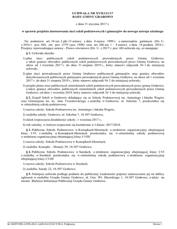 UCHWAŁA NR XVII/111/17 RADY GMINY GRABOWO z dnia 31 stycznia 2017 r. w sprawie projektu dostosowania sieci szkół podstawowych i gimnazjów do nowego ustroju szkolnego Na podstawie art. 18 ust. 2 pkt 15 ustawy z dnia 8 marca 1990 r. o samorządzie gminnym (Dz. U. z 2016 r. poz. 446, zm. poz. 1579 i poz. 1948) oraz art. 206 ust. 1 - 4 ustawy z dnia 14 grudnia 2016 r. Przepisy wprowadzające ustawę - Prawo oświatowe (Dz. U. z 2017 r. poz. 60) uchwala się, co następuje: § 1. Uchwała określa: 1) plan sieci publicznych szkół podstawowych prowadzonych przez Gminę Grabowo, a także granice obwodów publicznych szkół podstawowych prowadzonych przez Gminę Grabowo, na okres od 1 września 2017 r. do dnia 31 sierpnia 2019 r., który stanowi załącznik Nr 1 do niniejszej uchwały; 2) plan sieci prowadzonych przez Gminę Grabowo publicznych gimnazjów oraz granice obwodów dotychczasowych publicznych gimnazjów prowadzonych przez Gminę Grabowo, na okres od 1 września 2017 r. do dnia 31 sierpnia 2019 r., który stanowi załącznik Nr 2 do niniejszej uchwały; 3) projekt planu sieci publicznych ośmioletnich szkół podstawowych prowadzonych przez gminę Grabowo, a także granice obwodów publicznych ośmioletnich szkół podstawowych prowadzonych przez Gminę Grabowo, od dnia 1 września 2019, który stanowi załącznik Nr 3 do niniejszej uchwały. § 2. Zespół Szkół w Grabowie składający się ze Szkoły Podstawowej im. Antoniego i Jakuba Wagów oraz Gimnazjum im. ks. Jana Twardowskiego z siedzibą w Grabowie, ul. Szkolna 7, przekształca się w ośmioletnią szkołę podstawową: 1) nazwa szkoły: Szkoła Podstawowa im. Antoniego i Jakuba Wagów, 2) siedziba szkoły: Grabowo, ul. Szkolna 7, 18-507 Grabowo, 3) dzień rozpoczęcia działalności szkoły: 1 września 2017 r., 4) rok szkolny, w którym rozpocznie się kształcenie w I klasie: 2017/2018. § 3. Publiczna Szkoła Podstawowa w Konopkach-Monetach, o strukturze organizacyjnej obejmującej klasy I-VI z siedzibą w Konopkach-Monetach przekształca się w ośmioletnią szkołę podstawową o strukturze organizacyjnej obejmującej klasy I-VIII: 1) nazwa szkoły: Szkoła Podstawowa w Konopkach-Monetach, 2) siedziba: Konopki – Monety 39, 18-507 Grabowo. § 4. Publiczna Szkoła Podstawowa w Surałach, o strukturze organizacyjnej obejmującej klasy I-VI z siedzibą w Surałach przekształca się w ośmioletnią szkołę podstawową o strukturze organizacyjnej obejmującej klasy I-VIII: 1) nazwa szkoły: Szkoła Podstawowa w Surałach, 2) siedziba: Surały 22, 18-507 Grabowo. § 5. Niniejsza uchwała podlega podaniu do publicznej wiadomości poprzez umieszczenie jej na tablicy ogłoszeń w siedzibie Urzędu Gminy Grabowo, ul. Gen. Wł. Sikorskiego 1, 18-507 Grabowo, a także na stronie Biuletyn Informacji Publicznej Urzędu Gminy Grabowo. Id: 86D9749D-A5FB-4E41-A44E-0A1E2417CB14. Podpisany Strona 1 § 6. Uchwała wchodzi w życie z dniem podjęcia. Przewodnicząca Rady Gminy Mirosława Pogorzelska Id: 86D9749D-A5FB-4E41-A44E-0A1E2417CB14. Podpisany Strona 2 Załącznik Nr 1 do Uchwały Nr XVII/111/17 Rady Gminy Grabowo z dnia 31 stycznia 2017 r. Plan sieci publicznych szkół podstawowych prowadzonych przez Gminę Grabowo, a także granice obwodów publicznych szkół podstawowych prowadzonych przez Gminę Grabowo, na okres od dnia 1 września 2017 r. do dnia 31 sierpnia 2019 r. Lp. 1. 2. 3. Nazwa szkoły Szkoła Podstawowa im. Antoniego i Jakuba Wagów w Grabowie Szkoła Podstawowa w Konopkach -Monetach Szkoła Podstawowa w Surałach Adres siedziby szkoły, adresy ewentualnych innych lokalizacji prowadzenia zajęć dydaktycznych, wychowawczych i opiekuńczych ul. Szkolna 7 18-507 Grabowo Konopki- Monety 39 rok szkolny 2017/2018 rok szkolny 2018/2019 Andrychy, Bagińskie, Chełchy, Ciemianka, Gnatowo, Golanki, Grabowo, Grabowskie, Guty Podleśne, Kurkowo, Łebki Duże, Łebki Małe, Milewo-Gałązki, Przyborowo, Rosochate, Siwki, Skroda Wielka, Stare Guty, Świdry Dobrzyce, Świdry Podleśne, Wiszowate Konopki-Białystok, Konopki- Monety Andrychy, Bagińskie, Chełchy, Ciemianka, Gnatowo, Golanki, Grabowo, Grabowskie, Guty Podleśne, Kurkowo, Łebki Duże, Łebki Małe, Milewo-Gałązki, Przyborowo, Rosochate, Siwki, Skroda Wielka, Stare Guty, Świdry Dobrzyce, Świdry Podleśne, Wiszowate Konopki-Białystok, Konopki- Monety Grądy- Michały, Grądy- Możdżenie, Kamińskie, Kownacin, Łubiane, Marki, Pasichy, Stawiane, Surały, Wojsławy, Żebrki Grądy- Michały, Grądy- Możdżenie, Kamińskie, Kownacin, Łubiane, Marki, Pasichy, Stawiane, Surały, Wojsławy, Żebrki 18-507 Grabowo Surały 22 18-507 Grabowo Id: 86D9749D-A5FB-4E41-A44E-0A1E2417CB14. Podpisany Granice obwodu szkoły na: Strona 1 Załącznik Nr 2 do Uchwały Nr XVII/111/17 Rady Gminy Grabowo z dnia 31 stycznia 2017 r. Plan sieci prowadzonych przez Gminę Grabowo publicznych gimnazjów oraz granice obwodów dotychczasowych publicznych gimnazjów prowadzonych przez Gminę Grabowo, na okres od 1 września 2017 r. do dnia 31 sierpnia 2019 r. Lp. 1. Nazwa szkoły Gimnazjum im. ks. Jana Twardowskiego w Grabowie Id: 86D9749D-A5FB-4E41-A44E-0A1E2417CB14. Podpisany Adres siedziby szkoły, adresy ewentualnych innych lokalizacji prowadzenia zajęć dydaktycznych, wychowawczych i opiekuńczych Ul. Szkolna 7 18-507 Grabowo Granice obwodu szkoły na rok szkolny 2017/2018 rok szkolny 2018/2019 Andrychy, Bagińskie, Chełchy, Ciemianka, Gnatowo, Golanki, Grabowo, Grabowskie, Grądy-Michały, Grądy-Możdżenie, Guty Podleśne, Kamińskie, Konopki-Białystok, Konopki-Monety, Kownacin, Kurkowo, Łebki Duże, Łebki Małe, Łubiane, Marki, MilewoGałązki, Pasichy, Przyborowo, Siwki, Skroda Wielka, Stare Guty, Stawiane, Surały, ŚwidryDobrzyce, Świdry Podleśne, Rosochate, Wiszowate, Wojsławy, Żebrki. Gimnazjum zakończyło działalność w dniu 31 sierpnia 2019 r. – zostało przekształcone w Szkołę Podstawową im. Jakuba i Antoniego Wagów w Grabowie Strona 1 Załączn