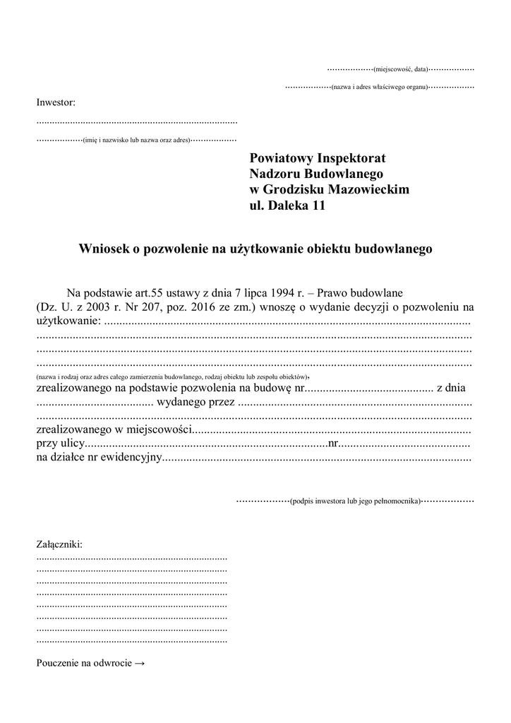 ..................(miejscowość, data).................. ..................(nazwa i adres właściwego organu).................. Inwestor: .............................................................................. ..................(imię i nazwisko lub nazwa oraz adres).................. Powiatowy Inspektorat Nadzoru Budowlanego w Grodzisku Mazowieckim ul. Daleka 11 Wniosek o pozwolenie na użytkowanie obiektu budowlanego Na podstawie art.55 ustawy z dnia 7 lipca 1994 r. – Prawo budowlane (Dz. U. z 2003 r. Nr 207, poz. 2016 ze zm.) wnoszę o wydanie decyzji o pozwoleniu na użytkowanie: .......................................................................................................................... ................................................................................................................................................. ................................................................................................................................................. ................................................................................................................................................. (nazwa i rodzaj oraz adres całego zamierzenia budowlanego, rodzaj obiektu lub zespołu obiektów), zrealizowanego na podstawie pozwolenia na budowę nr........................................... z dnia ....................................... wydanego przez .............................................................................. ................................................................................................................................................. zrealizowanego w miejscowości............................................................................................. przy ulicy.................................................................................nr............................................ na działce nr ewidencyjny....................................................................................................... ..................(podpis inwestora lub jego pełnomocnika).................. Załączniki: .......................................................................... .......................................................................... .......................................................................... .......................................................................... .......................................................................... .......................................................................... .......................................................................... .......................................................................... Pouczenie na odwrocie → Art. 56. 1. Inwestor, w stosunku do którego nałożono obowiązek uzyskania pozwolenia na użytkowanie obiektu budowlanego, jest obowiązany zawiadomić, zgodnie z właściwością wynikającą z przepisów szczególnych, organy: 1) Państwowej Inspekcji Sanitarnej, 2) Państwowej Inspekcji Pracy, 3) Państwowej Straży Pożarnej - o zakończeniu budowy obiektu budowlanego i zamiarze przystąpienia do jego użytkowania. Organy zajmują stanowisko w sprawie zgodności wykonania obiektu budowlanego z projektem budowlanym. 2. Niezajęcie stanowiska przez organy, wymienione w ust. 1, w terminie 14 dni od dnia otrzymania zawiadomienia, traktuje się jak niezgłoszenie sprzeciwu lub uwag. Art. 57 Pb : (Wyciąg) 1. Do (...) wniosku o udzielenie pozwolenia na użytkowanie inwestor jest obowiązany dołączyć: 1) oryginał dziennika budowy (z wpisem geodety uprawnionego o wytyczeniu obiektu na gruncie); 2) oświadczenie kierownika budowy: a) o zgodności wykonania obiektu budowlanego z projektem budowlanym i warunkami pozwolenia na budowę oraz przepisami, b) o doprowadzeniu do należytego stanu i porządku terenu budowy, a także - w razie korzystania - ulicy, sąsiedniej nieruchomości, budynku lub lokalu; 3) oświadczenie o właściwym zagospodarowaniu terenów przyległych, jeżeli eksploatacja wybudowanego obiektu jest uzależniona od ich odpowiedniego zagospodarowania; 4) protokoły badań i sprawdzeń; * 5) inwentaryzację geodezyjną powykonawczą; 6) potwierdzenie, zgodnie z odrębnymi przepisami, odbioru wykonanych przyłączy; 3. Inwestor jest obowiązany dołączyć do wniosku, o którym mowa w ust. 1, oświadczenia o braku sprzeciwu lub uwag ze strony organów wymienionych w art. 56. 6. Wniosek o udzielenie pozwolenia na użytkowanie stanowi wezwanie właściwego organu do przeprowadzenia obowiązkowej kontroli, o której mowa w art. 59a. 7. W przypadku stwierdzenia przystąpienia do użytkowania obiektu budowlanego lub jego części z naruszeniem przepisów art. 54 i 55, właściwy organ wymierza karę z tytułu nielegalnego użytkowania obiektu budowlanego. Do kary tej stosuje się odpowiednio przepisy dotyczące kar, o których mowa w art. 59f ust. 1, z tym że stawka opłaty podlega dziesięciokrotnemu podwyższeniu." * kominy, instalacja elektryczna, instalacja gazowa, wodociąg, szczelność szamba ponadto: 1. kopię decyzji o pozwoleniu na budowę. 2. kopię świadectwa charakterystyki energetycznej budynku