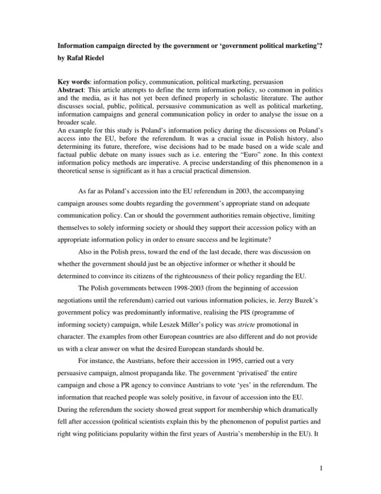 Information campaign directed by the government or ‘government political marketing’? by Rafał Riedel Key words: information policy, communication, political marketing, persuasion Abstract: This article attempts to define the term information policy, so common in politics and the media, as it has not yet been defined properly in scholastic literature. The author discusses social, public, political, persuasive communication as well as political marketing, information campaigns and general communication policy in order to analyse the issue on a broader scale. An example for this study is Poland’s information policy during the discussions on Poland’s access into the EU, before the referendum. It was a crucial issue in Polish history, also determining its future, therefore, wise decisions had to be made based on a wide scale and factual public debate on many issues such as i.e. entering the “Euro” zone. In this context information policy methods are imperative. A precise understanding of this phenomenon in a theoretical sense is significant as it has a crucial practical dimension. As far as Poland’s accession into the EU referendum in 2003, the accompanying campaign arouses some doubts regarding the government’s appropriate stand on adequate communication policy. Can or should the government authorities remain objective, limiting themselves to solely informing society or should they support their accession policy with an appropriate information policy in order to ensure success and be legitimate? Also in the Polish press, toward the end of the last decade, there was discussion on whether the government should just be an objective informer or whether it should be determined to convince its citizens of the righteousness of their policy regarding the EU. The Polish governments between 1998-2003 (from the beginning of accession negotiations until the referendum) carried out various information policies, ie. Jerzy Buzek’s government policy was predominantly informative, realising the PIS (programme of informing society) campaign, while Leszek Miller’s policy was stricte promotional in character. The examples from other European countries are also different and do not provide us with a clear answer on what the desired European standards should be. For instance, the Austrians, before their accession in 1995, carried out a very persuasive campaign, almost propaganda like. The government ‘privatised’ the entire campaign and chose a PR agency to convince Austrians to vote ‘yes’ in the referendum. The information that reached people was solely positive, in favour of accession into the EU. During the referendum the society showed great support for membership which dramatically fell after accession (political scientists explain this by the phenomenon of populist parties and right wing politicians popularity within the first years of Austria’s membership in the EU). It 1 seems that the political campaign had a great influence on the party as well as the entire political system in the country. An entirely opposite situation was one that took place, at the same time, in Finland. Since the Finnish government decided on an information campaign, educative in character, the Finnish people entered the EU very well informed. Their decisions were based on facts which were well supported. During the campaign presented were both, the advantages and the disadvantages of entering the EU, as well as the forecasted positive and negative results and consequences. Different information channels were used in the campaign, radio, TV, the Internet, phone-in information, press publications (free and paid) available in libraries, at the post office, etc., and many others. The above examples prove that the phrase information campaign is not enough to characterise the type of campaign that it may be. The activities, although carried out by the same subjects, with the same goal and using the same means, can take very different shape. Depending on the initiator’s intentions, we are dealing with communication activity which is strongly political in character, due to which we should deliberate on the adequacy of the phrase information policy. Although this phrase is present in many various texts, its use has not been developed precisely enough to be satisfactory. In the meantime, since in Poland there keep springing up new ideas for carrying out referendums1, we should take some time to analyse what kind of phenomenon we are dealing with and what type of activity would be adequate in this type of situation. Should it be persuasive communication, making use of socio-technical means available part of political marketing or should it be an information campaign, educative in character and similar to social campaigns from other spheres of life (less political, ie. on violence in homes or work for handicapped). Or perhaps we should even mention political propaganda, defined as, “influencing society by government authorities and institutions, political parties, administration, political elites or other pressure groups”2. Its basic goal is to modify people’s behaviour according to the sender’s interests.3 Generally, among the various ways of categorising social communication, researchers have difficulties with determining the scope of proper terminology to be used such as: 1 For example, regarding Poland’s entry into the Euro zone or the anti-missile sphere. From J. Klebaniuk, Psychologiczne mechanizmy propagandy neoliberalnej. in: P. Żuk (ed.), Media i władza. Wydawnictwo Naukowe Scholar, Warszawa 2006, p. 79 3 Recipients will be able to systematically process the communication content only on two conditions, 1) if they are motivated, 2) if they are capable to process it, ie. are not too tired, the surroundings allow it and they can critically asses it. (Klebaniuk, 2006; 87) The goal of propaganda is to provide information and to disrupt people’s cognitive processing of information on an intell