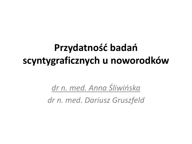 Przydatność badań scyntygraficznych u noworodków dr n. med. Anna Śliwińska dr n. med. Dariusz Gruszfeld Plan wykładu • Medycyna nuklearna • • • • Definicja Dostępność Bezpieczeństwo Zastosowanie • Interpretacja badań • Przypadki kliniczne • Podsumowanie Medycyna nuklearna • MEDYCYNA NUKLEARNA • Dział medycyny zajmujący się wykorzystaniem w diagnostyce i leczeniu otwartych źródeł promieniowania jonizującego • Źródłem promieniowania są przemiany zachodzące w jądrach atomów substancji promieniotwórczych Definicja WHO 1898 1945 lata 50-te Obrazowanie w medycynie - komplementarność funkcja struktura USG RTG TK • R. Virchow – zaburzenia w budowie komórki podstawą rozpoznania schorzeń • podstawy rozwoju radiologii MRI SPECT PET • C. Barnard – zaburzenia czynności komórki podstawą rozpoznania schorzeń • podstawy rozwoju medycyny nuklearnej Diagnostyka radioizotopowa - definicja • Podanie choremu radiofarmaceutyku i określenie rozkładu radioaktywności w wybranym narządzie • Radiofarmaceutyk = radioizotop + ligand – Radioizotop - promieniotwórczy izotop pierwiastka – Ligand - cząsteczka lub komórka wykazująca swoiste gromadzenie w danym narządzie • swoiste gromadzenie radiofarmaceutyku w danym narządzie zależy od określonej funkcji tego narządu Izotopy • 99mTc -T = 6 godz., energia gamma 140 keV 1/2 • • 123I- • 67Gal • 111In (T =68 godzin, energia kwantu gamma 173 keV i 247 1/2 keV) – obecnie rzadko T1/2=13 godz., energia gamma 159 keV 131I - T =8 dni, energia gamma 364 keV, dodatkowo 1/2 promieniowanie beta (obecnie tylko do terapii) – T1/2=3 dni, energia gamma 159 keV, dodatkowo 185 i 300 keV Badanie planarne – 2D Badanie SPECT -3D SPECT/CT SPECT/MRI Badanie PET/CT (PET/MRI) rejestruje się promieniowanie powstające podczas anihilacji pozytonów Pozytony zderzają się z elektronami zawartymi w tkankach ciała ulegając anihilacji W wyniku anihilacji pary elektron - pozyton powstają dwa kwanty promieniowania (fotony) poruszające się w przeciwnych kierunkach Dostępność badań izotopowych Czy badania izotopowe są dostępne? 1. W twoim szpitalu? 2. W twoim województwie? 3. W regionalnym ośrodku referencyjnym? 4. W ponadregionalnym/krajowym ośrodku referencyjnym? Czy badanie izotopowe jest bezpieczne? National Council on Radiation Protection, Norman E. Bolus J. Nucl. Med. Technol. 2013;41:255-260 • Istotna jest dawka radiofarmaceutyku – Dawka zależy od rodzaju badania – Dawkę pochłoniętą można zmniejszyć przez odpowiednie przygotowanie pacjenta (np. nawodnienie) – Dodatkowe CT istotnie podwyższa dawkę Ryzyko wyższe u niektórych pacjentów • Dzieci • Kobiety w okresie prokreacji • Płód http://www.imagegently.org/ Jaka dawka jest bezpieczna? • Dokładnie nie wiadomo • Nawet najmniejsza dawka może nieść niewielkie ryzyko zdrowotne • Badania izotopowe są bezpieczne, jeżeli używa się ich w sposób gwarantujący osiągnięcie wymaganego rezultatu przy możliwie najmniejszej dawce promieniowania (ALARA) As Low As Reasonably Achievable W jakich schorzeniach rozważył(a)byś wykonanie badania scyntygraficznego u noworodka ? 1. 2. 3. 4. W wadach przewodu pokarmowego W wadach układu moczowego W zapaleniu kości i stawów W chorobach układu limfatycznego Przypadki kliniczne INTERPRETACJA BADAŃ Scyntygrafia NEREK Wodonercze - poszerzenie UKM z towarzyszącym zanikiem miąższu nerkowego Przeszkoda w odpływie – każde ograniczenie odpływu moczu, które nie leczone będzie powodowało postępujące pogorszenie czynności nerek Wrodzone wodonercze – pacjent J.L. -wodonercze prenatalnie, potwierdzone po urodzeniu - cystografia – b.z. - scyntygrafia: NP-13% udziału w oczyszczaniu, poszerzony UKM, cechy utrudnionego wydalania - zakwalifikowana do plastyki miedniczkowo-moczowodowej prawostronnej Wodonercze wrodzone – pacjent P.A. noworodek płci męskiej, C1 P1, 39 Hbd, m. ur. 3660 g, 10 pkt Apgar - prenatalnie obustronne wodonercze od 13 tyg. c. - shunt miedniczkowo-owodniowy do nerki prawej w 27 Hbd - skuteczny - po urodzeniu cewnik Foley’a do p. moczowego - w 8 d.ż. wsunięcie się obwodowej końcówki shuntu w głąb tkanek • „shunt” miedniczkowo-owodniowy prenatalnie • powikłanie - odpływ moczu do prawej jamy opłucnowej • torakoskopowe usunięcie shuntu i drenaż opłucnej • zabieg przecięcia zastawek cewki w 3 tyg. ż. Wodonercze wrodzone – pacjent P.O. -Wodonercze prawostronne prenatalnie 34 Hbd, potwierdzone po urodzeniu, narastanie poszerzenia - Scyntygrafia: afunkcyjna NP, poszerzenie UKM i moczowodu NL + ureterocele - zakwalifikowano do prawostronnej nefrektomii i ewakuacji ureterocele w 10 d.ż. Agenezja nerki ? -pacjent D.G. - Zespół wad wrodzonych (VACTER): zarośnięcie odbytu, podejrzenie, agenezji NL, wodonercze NP; VSD - Laparotomia 2 d.ż. – colostomia - USG+cystografia: przetrwała kloaka - przetoka cewkowo odbytnicza - scyntygrafia: brak czynnego miąższu NL - Nieprawidłowe połączenie dróg moczowych z jelitem Scyntygrafia dynamiczna wątroby Cholestaza – pacjent J.J. -Cholestaza od urodzenia; wykluczono TORCH i przyczyny metaboliczne - scyntygrafia: torbiel d. żółciowych, brak przechodzenia znacznika - laparotomia: torbiel dróg żółciowych, cholangiografia – wąskie przewody żółciowe, hipoplastyczne drogi żółciowe wewnątrzwątrobowe Cholestaza – pacjent B.A. - 35 Hbd, m.ur. 1940 g. - hipoglikemia, cholestaza, hipertransaminazemia, zaburzenia krzepnięcia - USG b.z.; CT – b.z.; - scyntygrafia: obecny pasaż żółci do jelit - uzyskano nieprawidłowy wynik alfa 1 antytrypsyny - zastosowano leczenie zachowawcze i objawowe: UDCA + Wit. ADEK Torbiel dróg żółciowych USG ERCP HIDA Nowotwory (NBL) – pacjent Z.B. - 40 Hbd, m. ur. 3400 g. - USG: zmiany ogniskowe/guzy w rzucie obu nadnerczy - MRI – guzy obu nadnerczy, z podejrzeniem zajęcia węzłów chłonnych i ogniskami w ob
