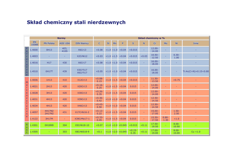 Skład chemiczny stali nierdzewnych Normy EN 10088 F e r r y t y c z n e M a r t e n z y t y c z n e A u s t Skład chemiczny w % PN Polska AISI USA DIN Niemcy C 1.4000 0H13 403, 410S X6Cr13 <0.08 1.4003 - - X2CrNi12 1.4016 H17 430 1.4510 0H17T 1.4006 Si Mn P S N Cr Mo Ni Inne <1.0 <1.0 <0.04 <0.015 - 12.0014.00 - - - <0.03 <1.0 <1.5 <0.04 <0.015 <0.03 10.5012.50 - 0.301.00 - X6Cr17 <0.08 <1.0 <1.0 <0.04 <0.015 - 16.0018.00 - - - 439 X3CrTi17 X6CrTi17 <0.05 <1.0 <1.0 <0.04 <0.015 - 16.0018.00 - - Ti:4x(C+N)+0.15<0.80 1H13 410 X12Cr13 <0.080.15 <1.0 <1.5 <0.04 <0.015 - 11.5013.50 - <0.75 - 1.4021 2H13 420 X20Cr13 <0.160.25 <1.0 <1.5 <0.04 0.015 - 12.0014.00 - - - 1.4028 3H13 420 X30Cr13 <0.260.35 <1.0 <1.5 <0.04 0.015 - 12.0014.00 - - - 1.4031 4H13 420 X39Cr13 <0.360.42 <1.0 <1.0 <0.04 0.015 - 12.5014.50 - - - 1.4034 4H13 420 X46Cr13 <0.430.50 <1.0 <1.0 <0.04 0.015 - 12.5014.50 - - - 1.4057 4H17N2 2H17N2 431 X17CrNi16-2 <0.120.22 <1.0 <1.5 <0.04 0.015 - 15.0017.00 - 1.502.50 - 1.4122 3H17M - X39CrMo17-1 <0.330.45 <1.0 <1.5 <0.04 0.015 - 15.5017.50 0.801.30 <1.0 - 1.4301 0H18N9 304 X5CrNi18-10 <0.07 <1.0 <2.0 <0.045 <0.015 <0.11 17.5019.50 - 8.0010.50 - 1.4305 - 303 X8CrNiS18-9 <0.1 <1.0 <2.0 <0.045 <0.150.35 <0.11 17.0019.00 - 8.0010.00 Cu <1.0 Normy e n i t y c z n e D u Skład chemiczny w % EN 10088 PN Polska AISI USA DIN Niemcy C 1.4306 00H18N10 304L X2CrNi19-11 <0.03 1.4307 - (304L) X2CrNi18-9 1.4310 1H18N9 301 1.4401 0H17N12M2 1.4404 S N Cr Mo Ni Inne <1.0 <2.0 <0.045 <0.015 <0.11 18.0020.00 - 10.0012.00 - <0.03 <1.0 <2.0 <0.045 <0.015 <0.11 17.5019.50 - 8.0010.50 - X10CrNi18-8 0.050.15 <2.0 <2.0 <0.045 <0.015 <0.11 16.0019.00 <0.80 6.009.50 - 316 X5CrNiMo17-12-2 <0.07 <1.0 <2.0 <0.045 <0.015 <0.11 16.518.50 2.0-2.5 10.0013.00 - 00H17N14M2 316L X2CrNiMo17-12-2 <0.03 <1.0 <2.0 <0.045 <0.015 <0.11 16.5018.50 2.0-2.5 10.0013.00 - 1.4435 - 316L X2CrNiMo18-14-3 <0.03 <1.0 <2.0 <0.045 <0.015 <0.11 17.0019.00 2.5-3.0 12.5015.00 - 1.4436 - 316 X3CrNiMo17-13-3 <0.05 <1.0 <2.0 <0.045 <0.015 <0.11 16.5018.50 2.5-3.0 10.5013.00 - 1.4438 - 317L X2CrNiMo18-15-4 <0.03 <1.0 <2.0 <0.045 <0.015 <0.11 17.5019.50 3.0-4.0 13.0016.00 - 1.4439 - <0.03 <1.0 <2.0 <0.045 <0.015 0.120.22 16.5018.50 4.0-5.0 12.5014.50 - 1.4529 - - X1NiCrMoCuN2520-7 <0.02 <0.5 <1.0 <0.03 <0.01 0.150.25 19.0021.00 6.0-7.0 24.0026.00 Cu 0.5-1.5 1.4539 0H22N24M4TCu 904L X1NiCrMoCu25-205 <0.02 <0.7 <2.0 <0.03 <0.01 <0.15 19.0021.00 4.0-5.0 24.0026.00 Cu 1.2-2.0 1.4541 0H18N10T 1H18N9T 1H18N10T 321 X6CrNiTi18-10 <0.08 <1.0 <2.0 <0.045 <0.015 - 17.0019.00 - 9.0012.00 Ti:5xC <0.7 1.4547 - - X1CrNiMoCuN2018-7 <0.02 <0.7 <1.0 <0.03 <0.01 0.180.25 19.5020.50 6.0-7.0 17.5018.50 Cu 0.5-1.0 1.4550 0H18N12Nb 347 X6CrNiNb18-10 <0.08 <1.0 <2.0 <0.045 <0.015 - 17.0019.00 - 9.0012.00 Nb:10xC <1.0 1.4571 H17N13M2T H18N10MT 316Ti X6CrNiMoTi17-12-2 <0.08 <1.0 <2.0 <0.045 <0.015 - 16.518.50 2.0-2.5 10.5013.50 Ti:5xC <0.7 1.4362 - 2304 X2CrNiN23-4 <0.03 <1.0 <2.0 <0.035 <0.015 0.050.20 22.0024.00 0.1-0.6 3.5-5.5 Cu:0.1-0.6 (317LMN) X2CrNiMoN17-13-5 Si Mn P Normy EN 10088 p l e x Skład chemiczny w % PN Polska AISI USA DIN Niemcy C 1.4410 - 2507 X2CrNiMoN25-7-4 <0.03 1.4460 - 329 X3CrNiMoN27-5-2 1.4462 - 2205 X2CrNiMoN22-5-3 Si Mn P S N Cr Mo Ni Inne <1.0 <2.0 <0.035 <0.015 0.240.35 24.0026.00 3.0-4.5 6.0-8.0 - <0.05 <1.0 <2.0 <0.035 <0.015 0.050.20 25.0028.00 1.3-2.0 4.5-6.5 Cu 0.1-0.6 <0.03 <1.0 <2.0 <0.035 <0.015 0.100.22 21.0023.00 2.5-3.5 4.5-6.5 -