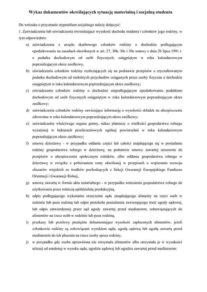 Wykaz dokumentów określających sytuację materialną i socjalną studenta Do wniosku o przyznanie stypendium socjalnego należy dołączyć: 1. Zaświadczenia lub oświadczenia stwierdzające wysokość dochodu studenta i członków jego rodziny, w tym odpowiednio: a) zaświadczenia z urzędu skarbowego członków rodziny o dochodzie podlegającym opodatkowaniu na zasadach określonych w art. 27, 30b, 30c i 30e ustawy z dnia 26 lipca 1991 r. o podatku dochodowym od osób fizycznych, osiągniętym w roku kalendarzowym poprzedzającym okres zasiłkowy, b) oświadczenia członków rodziny rozliczających się na podstawie przepisów o zryczałtowanym podatku dochodowym od niektórych przychodów osiąganych przez osoby fizyczne o dochodzie osiągniętym w roku kalendarzowym poprzedzającym okres zasiłkowy; c) oświadczenia członków rodziny o dochodzie niepodlegającym opodatkowaniu podatkiem dochodowym od osób fizycznych osiągniętym w roku kalendarzowym poprzedzającym okres zasiłkowy; d) zaświadczenia członków rodziny zawierające informację o wysokości składek na ubezpieczenie zdrowotne w roku kalendarzowym poprzedzającym okres zasiłkowy; e) zaświadczenie właściwego organu gminy, nakaz płatniczy o wielkości gospodarstwa rolnego wyrażonej w hektarach przeliczeniowych ogólnej powierzchni w roku kalendarzowym poprzedzającym okres zasiłkowy; f) umowę dzierżawy - w przypadku oddania części lub całości znajdującego się w posiadaniu rodziny gospodarstwa rolnego w dzierżawę, na podstawie umowy zawartej stosownie do przepisów o ubezpieczeniu społecznym rolników, albo oddania gospodarstwa rolnego w dzierżawę w związku z pobieraniem renty określonej w przepisach o wspieraniu rozwoju obszarów wiejskich ze środków pochodzących z Sekcji Gwarancji Europejskiego Funduszu Orientacji i Gwarancji Rolnej, g) umowę zawartą w formie aktu notarialnego - w przypadku wniesienia gospodarstwa rolnego do użytkowania przez rolniczą spółdzielnię produkcyjną, h) odpis podlegającego wykonaniu orzeczenia sądu zasądzającego alimenty na rzecz osób w rodzinie lub poza rodziną lub odpis protokołu posiedzenia zawierającego treść ugody sądowej, lub odpis zatwierdzonej przez sąd ugody zawartej przed mediatorem, zobowiązujących do alimentów na rzecz osób w rodzinie lub poza rodziną, i) przekazy lub przelewy pieniężne dokumentujące wysokość zapłaconych alimentów, jeżeli członkowie rodziny są zobowiązani wyrokiem sądu, ugodą sądową lub ugodą zawartą przed mediatorem do ich płacenia na rzecz osoby spoza rodziny, j) w przypadku gdy osoba uprawniona nie otrzymała alimentów albo otrzymała je w wysokości niższej od ustalonej w wyroku sądu, ugodzie sądowej lub ugodzie zawartej przed mediatorem: – zaświadczenie organu prowadzącego postępowanie egzekucyjne o całkowitej lub częściowej bezskuteczności egzekucji alimentów, a także o wysokości wyegzekwowanych alimentów, lub – informację właściwego sądu lub właściwej instytucji o podjęciu przez osobę uprawnioną czynności związanych z wykonaniem tytułu wykonawczego za granicą albo o niepodjęciu tych czynności, w szczególności w związku z brakiem podstawy prawnej do ich podjęcia lub brakiem możliwości wskazania przez osobę uprawnioną miejsca zamieszkania dłużnika alimentacyjnego za granicą, jeżeli dłużnik zamieszkuje za granicą, k) dokument określający datę utraty dochodu oraz miesięczną wysokość utraconego dochodu, w szczególności – świadectwo pracy, zaświadczenia od pracodawcy o wysokości utraconego dochodu. l) dokument określający wysokość dochodu uzyskanego przez członka rodziny oraz liczbę miesięcy, w których dochód był osiągany - w przypadku uzyskania dochodu w roku kalendarzowym poprzedzającym okres zasiłkowy, w szczególności zaświadczenia od pracodawcy o terminie i wysokości uzyskanego dochodu w roku kalendarzowym poprzedzającym okres zasiłkowy; m) dokument określający wysokość dochodu uzyskanego przez członka rodziny z miesiąca następującego po miesiącu, w którym dochód został osiągnięty - w przypadku uzyskania dochodu po roku kalendarzowym poprzedzającym okres zasiłkowy, w szczególności zaświadczenia od pracodawcy o wysokości uzyskanego dochodu w miesiącu następującym po miesiącu, w którym dochód został osiągnięty. 2. Inne zaświadczenia lub oświadczenia oraz dowody niezbędne do ustalenia prawa do stypendium socjalnego: a) dokumenty stwierdzające wiek rodzeństwa lub dzieci studenta, b) zaświadczenia o uczęszczaniu rodzeństwa lub dzieci studenta do szkoły lub szkoły wyższej, c) prawomocny wyrok sądu zasądzający rozwód lub separację; d) zaświadczenie z urzędu pracy o braku propozycji zatrudnienia lub innej pracy zarobkowej w przypadku bezrobotnych rodziców. e) akty zgonu nieżyjących członków rodziny; f) odpis podlegającego wykonaniu wyroku zasądzającego alimenty lub odpis protokołu posiedzenia zawierającego treść ugody sądowej, lub odpis zatwierdzonej przez sąd ugody zawartej przed mediatorem, zobowiązujących do alimentów; g) kartę pobytu - w przypadku cudzoziemca przebywającego na terytorium Rzeczypospolitej Polskiej na podstawie zezwolenia na osiedlenie się, zezwolenia na pobyt rezydenta długoterminowego Wspólnot Europejskich, zezwolenia na zamieszkanie na czas oznaczony udzielonego w związku z okolicznością, o której mowa w art. 53 ust. 1 pkt 13 ustawy z dnia 13 czerwca 2003 r. o cudzoziemcach (Dz. U. z 2011 r. Nr 264, poz. 1573), lub w związku z uzyskaniem w Rzeczypospolitej Polskiej statusu uchodźcy lub ochrony uzupełniającej; h) odpis zupełny aktu urodzenia dziecka - w przypadku gdy ojciec jest nieznany; i) odpis prawomocnego wyroku oddalającego powództwo o ustalenie alimentów; j) orzeczenie sądu zobowiązujące jednego z rodziców do ponoszenia całkowitych kosztów utrzymania dziecka; k) odpis prawomocnego wyroku sądu rodzinne