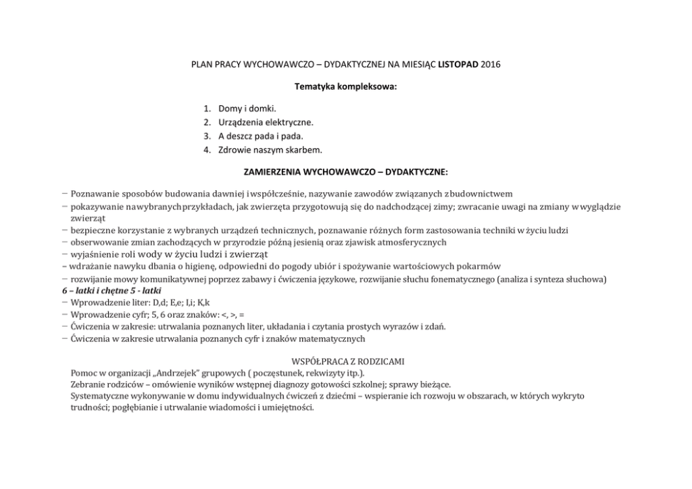 PLAN PRACY WYCHOWAWCZO – DYDAKTYCZNEJ NA MIESIĄC LISTOPAD 2016 Tematyka kompleksowa: 1. 2. 3. 4. Domy i domki. Urządzenia elektryczne. A deszcz pada i pada. Zdrowie naszym skarbem. ZAMIERZENIA WYCHOWAWCZO – DYDAKTYCZNE: − Poznawanie sposobów budowania dawniej i współcześnie, nazywanie zawodów związanych z budownictwem − pokazywanie na wybranych przykładach, jak zwierzęta przygotowują się do nadchodzącej zimy; zwracanie uwagi na zmiany w wyglądzie zwierząt − bezpieczne korzystanie z wybranych urządzeń technicznych, poznawanie różnych form zastosowania techniki w życiu ludzi − obserwowanie zmian zachodzących w przyrodzie późną jesienią oraz zjawisk atmosferycznych − wyjaśnienie roli wody w życiu ludzi i zwierząt − wdrażanie nawyku dbania o higienę, odpowiedni do pogody ubiór i spożywanie wartościowych pokarmów − rozwijanie mowy komunikatywnej poprzez zabawy i ćwiczenia językowe, rozwijanie słuchu fonematycznego (analiza i synteza słuchowa) 6 – latki i chętne 5 - latki − Wprowadzenie liter: D,d; E,e; I,i; K,k − Wprowadzenie cyfr; 5, 6 oraz znaków: <, >, = − Ćwiczenia w zakresie: utrwalania poznanych liter, układania i czytania prostych wyrazów i zdań. − Ćwiczenia w zakresie utrwalania poznanych cyfr i znaków matematycznych WSPÓŁPRACA Z RODZICAMI Pomoc w organizacji „Andrzejek” grupowych ( poczęstunek, rekwizyty itp.). Zebranie rodziców – omówienie wyników wstępnej diagnozy gotowości szkolnej; sprawy bieżące. Systematyczne wykonywanie w domu indywidualnych ćwiczeń z dziećmi – wspieranie ich rozwoju w obszarach, w których wykryto trudności; pogłębianie i utrwalanie wiadomości i umiejętności.