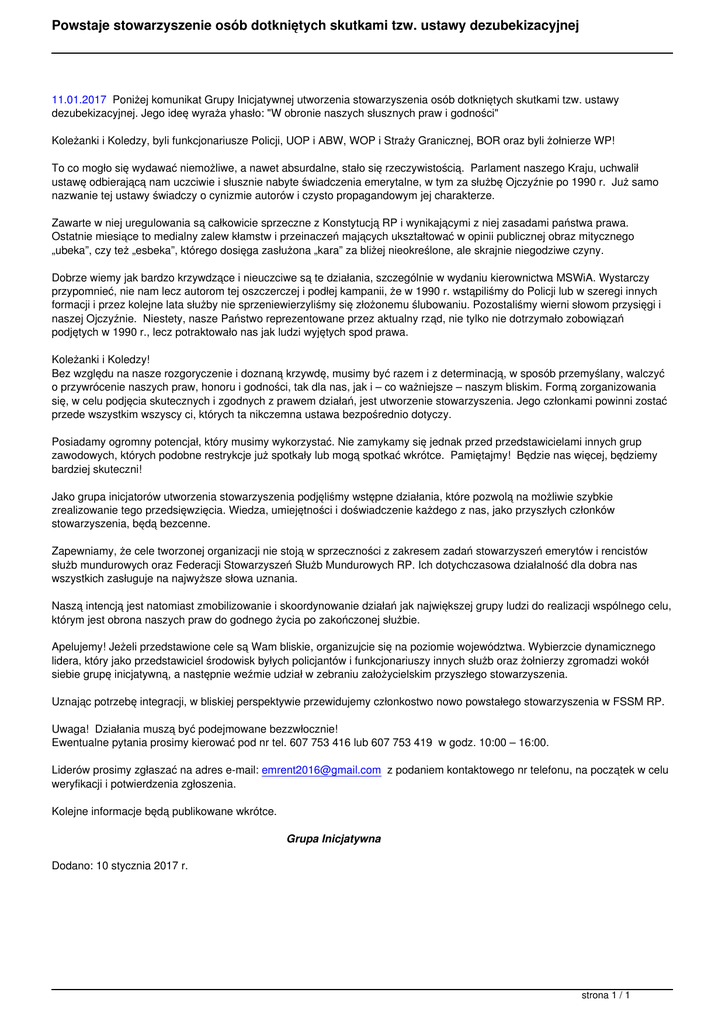 Powstaje stowarzyszenie osób dotkniętych skutkami tzw. ustawy dezubekizacyjnej 11.01.2017 Poniżej komunikat Grupy Inicjatywnej utworzenia stowarzyszenia osób dotkniętych skutkami tzw. ustawy dezubekizacyjnej. Jego ideę wyraża yhasło: "W obronie naszych słusznych praw i godności" Koleżanki i Koledzy, byli funkcjonariusze Policji, UOP i ABW, WOP i Straży Granicznej, BOR oraz byli żołnierze WP! To co mogło się wydawać niemożliwe, a nawet absurdalne, stało się rzeczywistością. Parlament naszego Kraju, uchwalił ustawę odbierającą nam uczciwie i słusznie nabyte świadczenia emerytalne, w tym za służbę Ojczyźnie po 1990 r. Już samo nazwanie tej ustawy świadczy o cynizmie autorów i czysto propagandowym jej charakterze. Zawarte w niej uregulowania są całkowicie sprzeczne z Konstytucją RP i wynikającymi z niej zasadami państwa prawa. Ostatnie miesiące to medialny zalew kłamstw i przeinaczeń mających ukształtować w opinii publicznej obraz mitycznego „ubeka”, czy też „esbeka”, którego dosięga zasłużona „kara” za bliżej nieokreślone, ale skrajnie niegodziwe czyny. Dobrze wiemy jak bardzo krzywdzące i nieuczciwe są te działania, szczególnie w wydaniu kierownictwa MSWiA. Wystarczy przypomnieć, nie nam lecz autorom tej oszczerczej i podłej kampanii, że w 1990 r. wstąpiliśmy do Policji lub w szeregi innych formacji i przez kolejne lata służby nie sprzeniewierzyliśmy się złożonemu ślubowaniu. Pozostaliśmy wierni słowom przysięgi i naszej Ojczyźnie. Niestety, nasze Państwo reprezentowane przez aktualny rząd, nie tylko nie dotrzymało zobowiązań podjętych w 1990 r., lecz potraktowało nas jak ludzi wyjętych spod prawa. Koleżanki i Koledzy! Bez względu na nasze rozgoryczenie i doznaną krzywdę, musimy być razem i z determinacją, w sposób przemyślany, walczyć o przywrócenie naszych praw, honoru i godności, tak dla nas, jak i – co ważniejsze – naszym bliskim. Formą zorganizowania się, w celu podjęcia skutecznych i zgodnych z prawem działań, jest utworzenie stowarzyszenia. Jego członkami powinni zostać przede wszystkim wszyscy ci, których ta nikczemna ustawa bezpośrednio dotyczy. Posiadamy ogromny potencjał, który musimy wykorzystać. Nie zamykamy się jednak przed przedstawicielami innych grup zawodowych, których podobne restrykcje już spotkały lub mogą spotkać wkrótce. Pamiętajmy! Będzie nas więcej, będziemy bardziej skuteczni! Jako grupa inicjatorów utworzenia stowarzyszenia podjęliśmy wstępne działania, które pozwolą na możliwie szybkie zrealizowanie tego przedsięwzięcia. Wiedza, umiejętności i doświadczenie każdego z nas, jako przyszłych członków stowarzyszenia, będą bezcenne. Zapewniamy, że cele tworzonej organizacji nie stoją w sprzeczności z zakresem zadań stowarzyszeń emerytów i rencistów służb mundurowych oraz Federacji Stowarzyszeń Służb Mundurowych RP. Ich dotychczasowa działalność dla dobra nas wszystkich zasługuje na najwyższe słowa uznania. Naszą intencją jest natomiast zmobilizowanie i skoordynowanie działań jak największej grupy ludzi do realizacji wspólnego celu, którym jest obrona naszych praw do godnego życia po zakończonej służbie. Apelujemy! Jeżeli przedstawione cele są Wam bliskie, organizujcie się na poziomie województwa. Wybierzcie dynamicznego lidera, który jako przedstawiciel środowisk byłych policjantów i funkcjonariuszy innych służb oraz żołnierzy zgromadzi wokół siebie grupę inicjatywną, a następnie weźmie udział w zebraniu założycielskim przyszłego stowarzyszenia. Uznając potrzebę integracji, w bliskiej perspektywie przewidujemy członkostwo nowo powstałego stowarzyszenia w FSSM RP. Uwaga! Działania muszą być podejmowane bezzwłocznie! Ewentualne pytania prosimy kierować pod nr tel. 607 753 416 lub 607 753 419 w godz. 10:00 – 16:00. Liderów prosimy zgłaszać na adres e-mail: [email protected] z podaniem kontaktowego nr telefonu, na początek w celu weryfikacji i potwierdzenia zgłoszenia. Kolejne informacje będą publikowane wkrótce. Grupa Inicjatywna Dodano: 10 stycznia 2017 r. strona 1 / 1