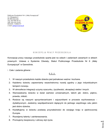 Publiczne Przedszkole Nr 6 „Ma y Europejczyk” Ul. Olimpijska 6 08-400 Garwolin Tel.: 025 684-36-12 NIP: 826-103-24-05 REGON: 710006757 e-mail: [email protected] KONCEPCJA PRACY PRZEDSZKOLA Koncepcja pracy naszego przedszkola oparta jest na celach i zadaniach zawartych w aktach prawnych: Ustawa o Systemie O wiaty, Statut Publicznego Przedszkola Nr 6 „Ma y Europejczyk” w Garwolinie. I. Cele i zadania g ówne : MISJA 1. W naszym przedszkolu ka de dziecko jest jednakowo wa ne i kochane. 2. Ka demu dziecku zapewniamy wszechstronny rozwój zgodny z jego indywidualnym tempem rozwoju. 3. W atmosferze integracji uczymy szacunku, yczliwo ci, akceptacji siebie i innych. 4. Wprowadzamy dziecko w prawda, mi 5. Rodzice s wiat warto ci uniwersalnych, takich jak: dobro, pi kno, . naszymi sprzymierze cami i sojusznikami w procesie wychowawczo - dydaktycznym. Jeste my wspó partnerami d cymi do jednego wspólnego celu jakim jest dobro dziecka. 6. Kszta tujemy w dziecku postaw przynale no ci do swojego kraju w zjednoczonej Europie. Strona 8. Promujemy bezpieczny i zdrowy styl ycia. 1 7. Rozwijamy talenty i zainteresowania. WIZJA 1. Rodzice s wspó autorami ycia przedszkola. 2. Dzieci korzystaj z nowoczesnych pomocy dydaktycznych, rozwijaj swoje zainteresowania i zdolno ci, pracuj metodami aktywnymi. 3. Programy przedszkola ukierunkowane s na dziecko, jego potrzeby, umo liwiaj c mu wszechstronny rozwój osobowo ci. 4. Przedszkole rozwija u wychowanków pozytywne cechy charakteru (dobro , empatia, otwarto , zaradno emocjonaln , samodzielno umiej tno ci, umiej tno , kreatywno , wiar we w asne wspó dzia ania). 5. Przedszkole umo liwia wyrównywanie szans edukacyjnych wszystkim dzieciom oraz uwzgl dnia w swoich dzia aniach potrzeby rodowiska. 6. Nad rozwojem dzieci czuwa wykwalifikowana, kompetentna i zaanga owana kadra, stosuj ca nowoczesne metody i narz dzia pracy. MODEL ABSOLWENTA: 1. Zna swoje mocne strony, umie je wykorzysta , pokonuje s abo ci. 2. Jest przygotowany do roli ucznia. 3. Szanuje rodowisko przyrodnicze, dostrzega pi kno otaczaj cej przyrody. 4. Jest otwarty na wiat i ludzi. 5. Odró nia dobro od z a. 6. Dostrzega potrzeby w asne i innych. 7. Jest aktywny, dociekliwy, kreatywny i ambitny. 8. Ma pozytywny obraz samego siebie. 9. Ma wiadomo w asnej to samo ci. 10. Jest komunikatywny. 11. Nie boi si wyra 12. D w asnych opinii. y do rozwi zywania problemów. 13. Przestrzega podstawowych warto ci. 14. Czuje si Polakiem i Europejczykiem. 15. Okazuje szacunek innym ludziom. 16. Jest tolerancyjny i otwarty wobec innych. 19. Pomaga innym. Strona 18. Dba o swoje zdrowie i bezpiecze stwo. 2 17. Aktywnie uczestniczy w yciu rodzinnym, yciu przedszkola i grupy. II. Zaj cia w poszczególnych grupach prowadzone s w oparciu o programy wychowania przedszkolnego dopuszczone przez dyrektora przedszkola na dany rok szkolny zgodnie z art. 22a ust. 2 Ustawy o systemie o wiaty. Dodatkowo realizujemy innowacje pedagogiczne, takie jak: „Optymistyczne Przedszkole”, „Kraina dzieci w Europie” . Do realizacji tre ci zawartych w podstawie programowej wychowania przedszkolnego wykorzystujemy ró ne metody pracy, s to: - zaj cia i zabawy z obszaru edukacji matematycznej wg. prof. E.Gruszczyk –Kolczy skiej, - pedagogika zabawy „Klanza”, - Klucz do uczenia si - program edukacyjny na podstawie teorii i bada Lwa Wygotskiego, - Akademia Zdrowego Przedszkolaka, - odimienna metoda nauki czytania wed ug Ireny Majchrzak, - muzykoterapia , - aktywne s uchanie muzyki wed ug Batii Strauss, - metoda projektu wg. A. Kome skiego, - program profilaktyczny „Czyste powietrze wokó nas”, - udzia w akcji „Ca a Polska czyta Dzieciom”, - technika mandali g ównie w zaj ciach i zabawach plastycznych, - edukacja przez ruch. Priorytetem naszej dzia alno ci jest bezpiecze stwo, akceptacja i poszanowanie praw naszych wychowanków. Pragniemy rozpoznawanie potrzeb doskonali rodowiska jako oraz pracy naszego poszukiwanie przedszkola nowatorskich metod poprzez pracy z dzie mi. Stwarzamy warunki do autoprezentacji dzieci cych talentów, zainteresowa na forum w asnej grupy oraz ca ej spo eczno ci przedszkolnej. III. Opis systemu badania osi gni dzieci stosowany w Publicznym Przedszkolu Nr 6 „Ma y Europejczyk” w Garwolinie. Ewaluacja obejmuje diagnoz , analiz i prac pedagogiczn opart na wnioskach „na wej ciu” – rozpoznanie aktualnej sytuacji dziecka, jego potrzeb, zainteresowa , Strona Dotyczy sytuacji: 3 wynikaj cych z diagnozy i analizy aktualnego stanu rozwoju dziecka. kszta tuj cej – szczegó owe rozpoznanie stanu rozwoju i wspomaganie, diagnostycznej – monitorowanie osi gni dzieci na bie co, „na wyj ciu” – ocena post pów po okre lonym cyklu kszta cenia. Badanie osi gni dzieci w przedszkolu odbywa si na podstawie: prezentacji dokona dzieci (wyst py, wystawy), teczek prac i innych dokumentów, z których wynika czego dzieci nauczy y si , arkuszy obserwacji rozwoju dziecka, materia ów reporta owych (zdj cia, nagrania, filmy, itp.), rozmów. Badanie osi gni dzieci przebiega nast puj co: przeprowadzenie diagnozy wst pnej, szczegó owe rozpoznanie sytuacji dziecka, bie ce monitorowanie, dokumentowanie wyników, wspomaganie rozwoju, informowanie rodziców o stanie rozwoju dziecka po diagnozie wst pnej, pó roczna ocena realizacji za bie onych celów i zada , analiza, wnioski do dalszej pracy, ce wspieranie rozwoju dzieci, praca wed ug indywidualnego programu (w razie konieczno ci) dokumentowanie wyników obserwacji, przeprowadzenie diagnozy ko cowej, wnioski do dalszej pracy. IV. Opis systemu badania osi gni nauczycieli w Publicznym Przedszkolu Nr 6 „Ma y Europejczyk” w Garwolinie. Nauczyciele stosuj ewaluacj w asnej pracy (samoocena), jak równie zostaj poddani ocenie przez dyrektora i rodziców. (wspieraj ), informacyjn (diagnostyczn ), instrukta owo – korekcyjn (doradcz ). 4 motywuj nauczycieli spe nia trzy podstawowe funkcje; Strona System badania osi gni Badania osi gni nauczycieli dokonuje si na po