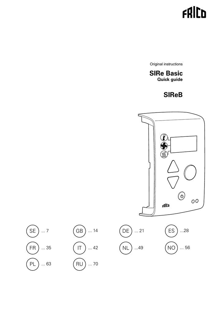 Original instructions SIRe Basic Quick guide SIReB C SE .... 7 GB .... 14 DE .... 21 ES ....28 FR .... 35 IT NL ....49 NO .... 56 PL .... 63 RU .... 70 .... 42 SIRe Basic Wiring diagram - Basic SIReB SD230 SIReB1/B2/B1EC C2 Pot. X5 Unit ID C1 X4 230V~ ROOM X3 SIReRTX (optional) SIReUB1 ACTUATOR SUPPLY N L L PE N L ~ SIReCC6XX (max 50 m) L=2m L=1,5m SIReCC6XX (max 10 m) SD230 SIReB1/B2/B1EC C2 Pot. X5 Unit ID C1 X4 230V~ ROOM X3 ACTUATOR SUPPLY N L L PE N L ~ SIReCC6XX (max 50 m) SD230 SIReB1/B2/B1EC C2 Pot. X5 Unit ID C1 X4 230V~ ROOM X3 ACTUATOR SUPPLY N L L PE N L ~ 2 SIReB1/B2/B1EC SIRe Basic Wiring diagram SIReB SIReB1/B2/B1EC C2 Pot. X5 Unit ID C1 X4 230V~ ROOM X3 SIReRTX (optional) SIReUB1 ACTUATOR SUPPLY N L L PE N L ~ SIReCC6XX (max 50 m) L=2m SIReCC6XX (max 10 m) SIReB1/B2/B1EC Pot. Unit ID C2 X5 C1 X4 230V~ ROOM X3 ACTUATOR SUPPLY N L L PE N L ~ SIReCC6XX (max 50 m) SIReB1/B2/B1EC C2 Pot. X5 Unit ID C1 X4 230V~ ROOM X3 SIReB1/B2/B1EC ACTUATOR SUPPLY N L L PE N L ~ 3 1 SE GB Wiring diagram - Advanced SIRe B1/B2/B1EC 2 4 3a Wiring diagram - Advanced 3b OK = ! 3 OK OK = = 4 5 6 2 7 1 8 9 0 ! 4 1 0 5 5 ? 6 www.frico.se SIRe Basic Quick guide/Start up Praca bez sterownika 1.Sprawdź, czy zostały dostarczone wszystkie części składowe (patrz część Części składowe). 2.Zamontuj i podłącz wszystkie urządzenia i komponenty, a także wyposażenie dodatkowe, jeśli występuje (np. siłownik) – patrz schemat połączeń. W razie podłączenia kilku urządzeń, ustaw dla każdego z nich niepowtarzalne ID (1-9) za pomocą wybieraka ID karty SIReB1/B2/B1EC. 3.Włącz zasilanie wszystkich urządzeń. 3 4 ACTUATOR 230V X3 ROOM X4 C1 X5 C2 5 PL 3 4 5 6 2 7 1 8 0 9 Służy do tymczasowego uruchamiania urządzenia bez wybrania trybu 0 przez sterowanie zewnętrzne. PE N L V SUPPLY 230 6 2 7 1 8 0 9 Każde urządzenie powinno mieć niepowtarzalny identyfikator na swojej karcie SIReB1/B2/B1EC. 4.W razie potrzeby odłącz i podłącz sterownik SIReUB1, aby uruchomić sterowanie systemu. 63 SIRe Basic PL Rozruch 30 - 60 s 2 0. 8 Aktualna temperatura pomieszczenia C Wybierz żądaną temperaturę pomieszczenia 5 - + 30°C Ustaw obroty wentylatora 1 - 5 Włącz ogrzewanie 0 = Brak ogrzewania 1 = Możliwy 1 poziom ogrzewania 2 = Możliwy 2 poziom ogrzewania (3 = Możliwy 3 poziom ogrzewania) Poziomy ogrzewania ustawiane przez termostat. 64 20 + + - 3 + + _ 1 + + SIRe Basic PL Części składowe SIReB C Pokrywa naścienna SIReUB1 Typ SIReCC605 Opis HxWxD [mm] Sterownik z czujnikiem temperatury pomieszczenia Kabel modułowy RJ12 (6/6) SIReUB1 SIReCC605 L [m] 120x70x35 5 Opcja SIReRTX Type SIReRTX SIReCJ4 SIReCJ6 SIReCC603 SIReCC605 SIReCC610 SIReCC615 SIReCC403 SIReCC405 SIReCC410 SIReCC415 SIReCJ4 SIReCJ6 Opis Zewnętrzny czujnik temperatury pomieszczenia Połączenie. RJ11 (4/4) Połączenie. RJ12 (6/6) Kabel modułowy RJ12 (6/6) Kabel modułowy RJ12 (6/6) Kabel modułowy RJ12 (6/6) Kabel modułowy RJ12 (6/6) Kabel modułowy RJ11 (4/4) Kabel modułowy RJ11 (4/4) Kabel modułowy RJ11 (4/4) Kabel modułowy RJ11 (4/4) SIReCC HxWxD L [m] 70x33x23 10 3 5 10 15 3 5 10 15 65 SIRe Basic PL Regulacja przepływu wody – zestaw zaworów VOS TBVC SD230 SD230 Regulacja przepływu wody – opcja TBVC BPV10 AV BPV10 AV VOSP TBVCMP VAT, narzędzie do regulacji zestawu zaworów VOS, VOSP. SD230 SD230 TBVCMP BPV10 AV BPV10 AV VOT TRVS SD230 SD230 TRVS Type RSK-no. Opis Złącze VOS15LF VOS15NF VOS20 VOS25 VOSP15LF VOSP15NF VOSP20 VOSP25 VOT15 VOT20 VOT25 VAT 673 09 35 673 09 36 673 09 37 673 09 38 673 09 43 673 09 44 673 09 45 673 09 46 Wł./Wył. Wł./Wył. Wł./Wył. Wł./Wył. Niezależny od ciśnienia Niezależny od ciśnienia Niezależny od ciśnienia Niezależny od ciśnienia Zawór 3-drogowy i siłownik dwupołożeniowy Zawór 3-drogowy i siłownik dwupołożeniowy Zawór 3-drogowy i siłownik dwupołożeniowy Narzędzie do regulacji zestawu zaworów VOS,VOSP DN15 DN15 DN20 DN25 DN15 DN15 DN20 DN25 DN15 DN20 DN25 66 482 98 30 SIRe Basic PL Tryby pracy Tryby pracy Kurtyny powietrzne Ustawienia fabryczne umożliwiają ręczne sterowanie wentylatorem oraz sterowanie ogrzewaniem poprzez włączanie/ wyłączanie termostatu. Ustaw wartość P04 parametru na 1 (patrz menu parametrów na następnej stronie), aby termostat sterował wentylatorem i włączaniem/wyłączaniem ogrzewania. Tryby pracy nagrzewnic z wymiennikiem wodnym Ustaw maksymalne obroty wentylatora, poziom ogrzewania i żądaną temperaturę pomieszczenia. Termostat steruje temperaturą pomieszczenia, zwiększając/zmniejszając obroty wentylatora. Po osiągnięciu żądanej temperatury pomieszczenia, siłownik/ zawór zamknie się, a wentylator zatrzyma się. Maksymalna prędkość wentylatora jest ograniczona do poziomu 4. Jeśli wartość P04 parametru zostanie zmieniona z 1 na 0 (patrz lista parametrów na następnej stronie), wentylator będzie pracował bez przerwy z zadaną prędkością, a termostat będzie włączał/wyłączał ogrzewanie. Informacje ogólne Tryb ręczny Regulacja ogrzewania Zmniejsz ustawienie temperatury poniżej 5°C – w oknie stanu pojawią się następujące symbole = tryb ręczny. W trybie ręcznym zarówno poziom wentylatora, jak i poziom ogrzewania są regulowane ręcznie. Kiedy temperatura pomieszczenia spadnie poniżej wartości zadanej, zostaje uruchomiony pierwszy poziom ogrzewania. Jeśli temperatura nadal spada, zostaje uruchomiony kolejny poziom ogrzewania (patrz opis pod parametrami P.00). Regulacja ogrzewania Kiedy temperatura pomieszczenia spadnie poniżej wartości zadanej, zawór otwiera się, umożliwiając ogrzewanie. Praca dod. went. System wł./wył. Po włączeniu ogrzewania wentylator kontynuuje pracę, aby schłodzić urządzenie. Czas pracy dodatkowej wynosi 180 sekund lub mniej, jeśli temperatura wewnętrzna spadnie poniżej +30°C. Naciskaj przycisk WŁ./WYŁ. przez 2 sekundy, aby wyłączyć system. Po wyłączeniu systemu, zabezpieczenia urządzenia pozostają aktywne, w związku z 