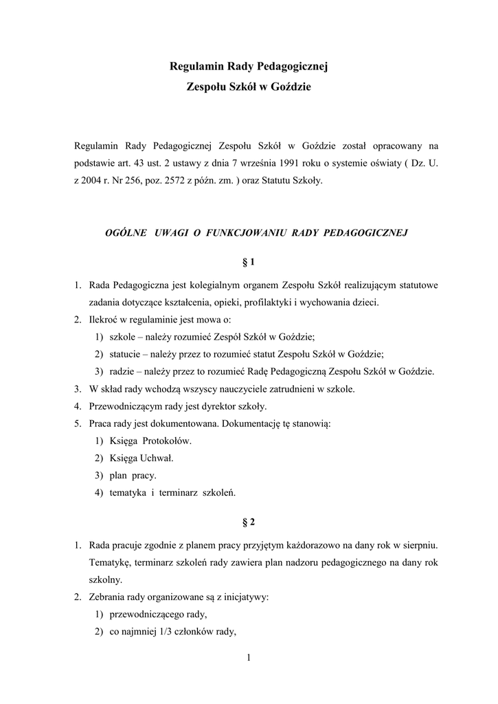 Regulamin Rady Pedagogicznej Zespołu Szkół w Goździe