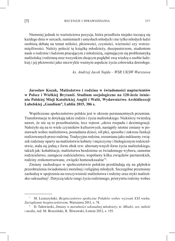 [5] RECENZJE I SPRAWOZDANIA 337 Niemniej jednak to wartościowa pozycja, która przedłuża niejako toczącą się każdego dnia w sercach, sumieniach i umysłach młodych i nie tylko młodych ludzi osobistą debatę na temat miłości, płciowości, czystości, wierności czy wstrzemięźliwości. Należy polecić tę książkę młodzieży, duszpasterzom, studentom nauk o rodzinie i ludziom pracującym z młodzieżą, zajmującym się problematyką małżeńską i rodzinną oraz wszystkim chcącym pogłębić swą wiedzę o osobie ludzkiej i jej płciowości jako niezwykle ważnym aspekcie życia człowieka dorosłego. ks. Andrzej Jacek Najda – WSR UKSW Warszawa Jarosław Kozak, Małżeństwo i rodzina w świadomości nupturientów w Polsce i Wielkiej Brytanii. Studium socjologiczne na 120-lecie istnienia Polskiej Misji Katolickiej Anglii i Walii, Wydawnictwo Archidiecezji Lubelskiej „Gaudium”, Lublin 2015, 386 s. Współczesne społeczeństwo polskie jest w okresie permanentnych przemian. Transformacje te dotykają także rodzin i życia małżeńskiego. Niektórzy twierdzą nawet, że nie są to przeobrażenia, lecz wprost „okres rozpadu i dezintegracji. Nałożyło się na to wiele czynników kulturowych, nastąpiły istotne zmiany w postawach wobec małżeństwa, posiadania dzieci, ról płci, sposobu i zakresu funkcji realizowanych przez rodzinę. Tradycyjna rodzina, rozumiana jako nuklearny związek rodzinny oparty na małżeństwie kobiety i mężczyzny i biologicznym rodzicielstwie, stała się jedną z form obok tzw. alternatywnych form życia małżeńskiego, takich jak: kohabitacje, małżeństwa bezdzietne ze świadomego wyboru, samotne rodzicielstwo, zastępcze rodzicielstwo, wspólnoty kilku związków partnerskich, rodziny zrekonstruowane, związki homoseksualne”1. Zmiany zachodzące w społeczeństwie polskim przekładają się na głębokie przeobrażenia świadomości moralnej i religijnej młodych. Szczególne przemiany zachodzą w spojrzeniu na rzeczywistość małżeństwa i rodziny oraz etyki małżeńsko-seksualnej2. Dotyczą także rangi życia rodzinnego, priorytetu rodziny wobec 1 M. Leszczyński, Bezpieczeństwo społeczne Polaków wobec wyzwań XXI wieku. Zarządzanie bezpieczeństwem, Warszawa 2011, s. 74. 2 D. Tułowiecki, Zmiany w moralności seksualnej młodzieży, w: Młodzi, sex, miłość i media, red. M. Brzeziński, R. Śliwowski, Łomża 2012, s. 155. 338 RECENZJE I SPRAWOZDANIA [6] innych celów życiowych oraz pokładania nadziei rodziny w sytuacjach trudnych3. Rodzina traci bowiem swe pierwsze miejsce w hierarchii aksjologicznej, zyskują zaś wartości związane z pracą i wykształceniem. Tracą dobre miejsce także wartości prospołeczne i religijne, sama zaś religia w coraz mniejszym stopniu oddziałuje na życie Polaków4. Przemiany te zyskują dodatkowe uwarunkowanie: migracje młodych do innych krajów i spotkanie z innymi uwarunkowaniami kulturowymi. W tym kontekście przemian na szczególną uwagę zasługuje książka Jarosława Kozaka Małżeństwo i rodzina w świadomości nupturientów w Polsce i Wielkiej Brytanii. Studium socjologiczne na 120-lecie istnienia Polskiej Misji Katolickiej Anglii i Walii” Ta wydana w Lublinie przez Wydawnictwo Archidiecezji Lubelskiej Gaudium pozycja próbuje uchwycić sposób postrzegania małżeństwa i rodziny przez młodych zamierzających zawrzeć małżeństwo zarówno w Polsce, jak i w Wielkiej Brytanii. To umiejscowienie próby badawczej na Wyspach Brytyjskich jest szczególnie cenne, gdyż – wedle danych – zamieszkuje tam ok. 850 tys. Polaków5. Cel publikacji naświetla autor już na początku wstępu, pisząc: „Celem niniejszej książki jest próba odpowiedzi na pytanie: jak kształtują się poglądy osób bezpośrednio przygotowujących się do małżeństwa na temat wybranych kwestii przestrzeni małżeńsko-rodzinnej, jakie jest miejsce i rola rodziny w świadomości nupturientów. W niniejszej pracy próbowano także zwrócić uwagę na ciągłość bądź zmianę wzorów rodzinnych z rodzin pochodzenia jako ewentualnych grup odniesienia dla przyszłych małżonków. W ten sposób podjęto się analizy ewentualnego wpływu tendencji sekularyzacyjnych i indywidualizacyjnych na postawy respondentów” (s. 17). Stawia także pytania badawcze: „W kontekście jakich wartości pojawia się rodzina? Czy w społeczeństwie polskim można mówić o pierwszych oznakach pożegnania się z tradycyjną rodziną? Czy w bliskiej przyszłości nowoczesnego społeczeństwa rodzina należy jeszcze do najważniejszych celów życiowych młodzieży? Czy małżeństwo jest rzeczywiście upragnioną formą życia młodego pokolenia? Jaką formę życia preferuje młode pokolenie? Czy można mówić o dylematach generacji Y, takich jak chociażby: partnerstwo contra małżeństwo, małżeństwo i rodzina versus kariera zawodowa i dobrobyt? Czy młodzi ludzie, wychowani już w duchu dzisiejszego czasu, będą chcieli mieć 3 A. Kwak, Rodzina – źródło kapitału życiowego, w: (Prze)moc w rodzinie. Instytucjonalne formy (po)mocy, red. M. Orłowicz, M. Gościniewicz, G. Pisarczyk, Toruń 2014, s. 16. 4 D. Tułowiecki, Atmosfera religijna współczesnej rodziny, w: Miedzy kryzysem w rodzinie a kryzysem rodziny, red. J. Kupny, M. Łuczak, Katowice 2011, s. 34. 5 http://wiadomosci.onet.pl/wielka-brytania-i-irlandia/wielka-brytania-polacy-najwieksza-grupa-obcokrajowcow/h1bc5b [odczyt z dn. 30.12.2015]. [7] RECENZJE I SPRAWOZDANIA 339 dzieci, ile i z jakich powodów? Co będzie dla nich najważniejsze w życiu małżeńskim i rodzinnym? Jak oceniają swoich rodziców oraz swoje z nimi relacje? Jaką rolę odgrywa rodzina pochodzenia w kształtowaniu wyobrażeń o własnym małżeństwie i rodzinie?” (s. 19). Aby odpowiedzieć na te pytania, autor zdecydował się podjąć projekt badawczy, którego koncepcję szczegółowo opracował, stworzył narzędzie badawcze – ankietę oraz uzyska