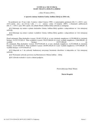 UCHWAŁA NR XVI/86/16 RADY MIASTA JEDLINA-ZDRÓJ z dnia 30 marca 2016 r. w sprawie zmiany budżetu Gminy Jedlina-Zdrój na 2016 rok. Na podstawie art. 18 ust. 2 pkt. 4 ustawy z dnia 8 marca 1990 r. o samorządzie gminnym (Dz. U. z 2015 r. poz. 1515 z późn. zm.), art. 212 ust. 1 pkt. 1 i 2 ustawy z dnia 27 sierpnia 2009 r. o finansach publicznych (Dz. U. z 2013 r. poz. 885 z późn. zm.),Rada Miasta Jedlina-Zdrój uchwala co następuje: § 1. Dokonuje się zmian w planie dochodów Gminy Jedlina-Zdrój zgodnie z załącznikiem nr 1 do niniejszej uchwały. § 2. Dokonuje się zmian w planie wydatków Gminy Jedlina-Zdrój zgodnie z załącznikiem nr 2 do niniejszej uchwały. Przed zmianami: Plan dochodów wynosi: 20.463.532,00 zł, w tym: dochody majątkowe: 4.238.000,00 zł, dochody bieżące: 16.225.532,00 zł. Plan wydatków wynosi: 20.033.084,60 zł w tym: wydatki majątkowe: 5.060.000,00 zł, wydatki bieżące: 14.973.084,60 zł; Po zmianach: Plan dochodów wynosi: 20.479.692,00 zł, w tym: dochody majątkowe: 4.252.600,00 zł, dochody bieżące: 16.227.092,00 zł. Plan wydatków wynosi: 20.049.244,60 zł w tym: wydatki majątkowe: 5.074.600,00 zł, wydatki bieżące: 14.974.644,60 zł; § 3. Załącznik nr 3 do uchwały budżetowej otrzymuje brzmienie określone w załączniku nr 3 do niniejszej uchwały. § 4. Wykonanie uchwały powierza się Burmistrzowi Miasta Jedlina – Zdrój. § 5. Uchwała wchodzi w życie z dniem podjęcia. Przewodnicząca Rady Miasta Maria Drapich Id: 5A5C7574-915B-4C6C-B479-2421124EB77A. Podpisany Strona 1 Zmiany w planie dochodów Gminy Jedlina-Zdrój Załącznik Nr 1 do Uchwały Nr XVI/86/16 Rady Miasta Jedlina-Zdrój z dnia 30 marca 2016r., Dział 630 Rozdział Paragraf 63003 75101 80110 852 740 000,00 Dotacja celowa otrzymana z tytułu pomocy finansowej udzielanej między jednostkami samorządu terytorialnego na dofinansowanie własnych zadań inwestycyjnych i zakupów inwestycyjnych Urzędy naczelnych organów władzy państwowej, kontroli i ochrony prawa oraz sądownictwa Urzędy naczelnych organów władzy państwowej, kontroli i ochrony prawa 2010 801 Przed zmianą Zadania w zakresie upowszechniania turystyki 6300 751 Turystyka Treść Dotacje celowe otrzymane z budżetu państwa na realizację zadań bieżących z zakresu administracji rządowej oraz innych zadań zleconych gminie (związkom gmin, związkom powiatowo-gminnym) ustawami Oświata i wychowanie 0970 85295 Gimnazja Wpływy z różnych dochodów Pomoc społeczna 6310 Razem: BeSTia Id: 5A5C7574-915B-4C6C-B479-2421124EB77A. Podpisany 11 000,00 751 000,00 751 000,00 11 000,00 11 000,00 1 000,00 4 760,00 5 760,00 1 000,00 4 760,00 5 760,00 45 470,00 400,00 45 870,00 0,00 400,00 400,00 1 000,00 3 193 802,00 Dotacje celowe otrzymane z budżetu państwa na realizację zadań bieżących z zakresu administracji rządowej oraz innych zadań zleconych gminie (związkom gmin, związkom powiatowo-gminnym) ustawami Dotacje celowe otrzymane z budżetu państwa na inwestycje i zakupy inwestycyjne z zakresu administracji rządowej oraz innych zadań zleconych gminom ustawami 11 000,00 Po zmianie 0,00 10,00 Pozostała działalność 2010 740 000,00 Zmiana 4 760,00 400,00 5 760,00 410,00 0,00 3 193 802,00 1 683 000,00 - 3 600,00 1 679 400,00 0,00 3 600,00 3 600,00 1 727 000,00 20 463 532,00 0,00 16 160,00 1 727 000,00 20 479 692,00 Strona 1 Strona 2 Zmiany w planie wydatków Gminy Jedlina-Zdrój Załącznik Nr 3 do Uchwały Nr XVI/86/16 Rady Miasta Jedlina-Zdrój z dnia 30 marca 2016r., Dział 630 Rozdział 63003 751 75101 801 80101 80110 Paragraf 6050 4210 4300 4520 4300 4390 4430 852 85295 4210 6060 Turystyka Treść Przed zmianą 1 136 000,00 Zadania w zakresie upowszechniania turystyki 1 136 000,00 Wydatki inwestycyjne jednostek budżetowych Urzędy naczelnych organów władzy państwowej, kontroli i ochrony prawa oraz sądownictwa Urzędy naczelnych organów władzy państwowej, kontroli i ochrony prawa Zakup materiałów i wyposażenia Oświata i wychowanie 1 000,00 800,00 Opłaty na rzecz budżetów jednostek samorządu terytorialnego Zakup usług pozostałych Zakup usług obejmujących wykonanie ekspertyz, analiz i opinii Pomoc społeczna 5 560,00 400,00 1 660 500,00 2 700,00 2 700,00 0,00 1 800,00 30 000,00 - 2 400,00 4 000,00 100,00 0,00 Razem: 4 760,00 5 760,00 1 660 100,00 7 500,00 Wydatki na zakupy inwestycyjne jednostek budżetowych 4 760,00 5 760,00 24 200,00 1 781 942,60 Zakup materiałów i wyposażenia 4 760,00 641 000,00 - 1 800,00 3 920 284,60 Pozostała działalność 11 000,00 1 147 000,00 26 000,00 0,00 Różne opłaty i składki 11 000,00 1 147 000,00 4 176 900,00 0,00 Gimnazja 11 000,00 Po zmianie 400,00 1 789 100,00 Zakup usług pozostałych Id: 5A5C7574-915B-4C6C-B479-2421124EB77A. Podpisany 1 000,00 4 176 500,00 Szkoły podstawowe BeSTia 630 000,00 Zmiana 20 033 084,60 1 789 100,00 1 800,00 27 600,00 4 100,00 0,00 3 920 284,60 - 3 600,00 3 900,00 0,00 3 600,00 16 160,00 1 781 942,60 3 600,00 20 049 244,60 Strona 1 Strona 3 Wykaz zadań inwestycyjnych planowanych do realizacji w 2016 roku Załącznik Nr 3 do Uchwały Nr XVI/86/16 Rady Miasta Jedlina-Zdrój z dnia 30 marca 2016r., Dział 630 852 Rozdział 63003 85295 Paragraf 6050 Turystyka Treść Przed zmianą 1 030 000,00 Zadania w zakresie upowszechniania turystyki 1 030 000,00 Wydatki inwestycyjne jednostek budżetowych KONCEPCJA ZAGOSPODAROWANIA TURYSTYCZNEGO TERENÓW LEŚNYCH MODERNIZACJA KOMPLEKSU SPORTOWO-REKREACYJNEGO PRZY UL.KŁODZKIEJ W JEDLINIE-ZDROJU Pomoc społeczna 6060 Pozostała działalność Wydatki na zakupy inwestycyjne jednostek budżetowych 630 000,00 0,00 11 000,00 11 000,00 22 000,00 1 041 000,00 1 041 000,00 641 000,00 22 000,00 - 11 000,00 619 000,00 0,00 3 600,00 3 600,00 0,00 0,00 Razem 11 000,00 Po zmianie 630 000,00 0,00 ZAKUPY INWESTYCYJNE Zmiana 5 060 000,00 3 600,00 3 600,00 3 600,00 14 600,00 3 600,00 3 600,00 3 600,00 5 074 600,00 Strona 1 z 1 Id: 5A5C7574-915B-4C6C-B479-2421124EB77A. Podpisan