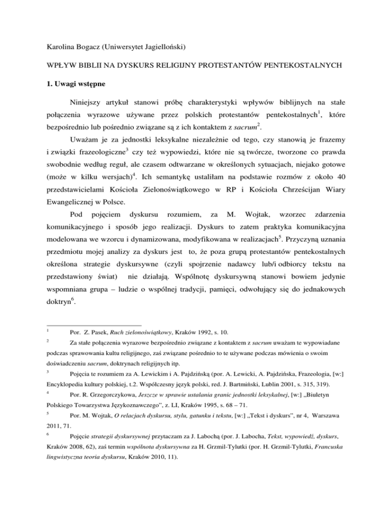 Karolina Bogacz (Uniwersytet Jagielloński) WPŁYW BIBLII NA DYSKURS RELIGIJNY PROTESTANTÓW PENTEKOSTALNYCH 1. Uwagi wstępne Niniejszy artykuł stanowi próbę charakterystyki wpływów biblijnych na stałe połączenia wyrazowe używane przez polskich protestantów pentekostalnych1, które bezpośrednio lub pośrednio związane są z ich kontaktem z sacrum2. Uważam je za jednostki leksykalne niezależnie od tego, czy stanowią je frazemy i związki frazeologiczne3 czy też wypowiedzi, które nie są twórcze, tworzone co prawda swobodnie według reguł, ale czasem odtwarzane w określonych sytuacjach, niejako gotowe (może w kilku wersjach)4. Ich semantykę ustaliłam na podstawie rozmów z około 40 przedstawicielami Kościoła Zielonoświątkowego w RP i Kościoła Chrześcijan Wiary Ewangelicznej w Polsce. Pod pojęciem dyskursu rozumiem, za M. Wojtak, wzorzec zdarzenia komunikacyjnego i sposób jego realizacji. Dyskurs to zatem praktyka komunikacyjna modelowana we wzorcu i dynamizowana, modyfikowana w realizacjach5. Przyczyną uznania przedmiotu mojej analizy za dyskurs jest to, że poza grupą protestantów pentekostalnych określona strategie dyskursywne (czyli spojrzenie nadawcy lub/i odbiorcy tekstu na przedstawiony świat) nie działają. Wspólnotę dyskursywną stanowi bowiem jedynie wspomniana grupa – ludzie o wspólnej tradycji, pamięci, odwołujący się do jednakowych doktryn6. 1 Por. Z. Pasek, Ruch zielonoświątkowy, Kraków 1992, s. 10. 2 Za stałe połączenia wyrazowe bezpośrednio związane z kontaktem z sacrum uważam te wypowiadane podczas sprawowania kultu religijnego, zaś związane pośrednio to te używane podczas mówienia o swoim doświadczeniu sacrum, doktrynach religijnych itp. 3 Pojęcia te rozumiem za A. Lewickim i A. Pajdzińską (por. A. Lewicki, A. Pajdzińska, Frazeologia, [w:] Encyklopedia kultury polskiej, t.2. Współczesny język polski, red. J. Bartmiński, Lublin 2001, s. 315, 319). 4 Por. R. Grzegorczykowa, Jeszcze w sprawie ustalania granic jednostki leksykalnej, [w:] „Biuletyn Polskiego Towarzystwa Językoznawczego”, z. LI, Kraków 1995, s. 68 – 71. 5 Por. M. Wojtak, O relacjach dyskursu, stylu, gatunku i tekstu, [w:] „Tekst i dyskurs”, nr 4, Warszawa 2011, 71. 6 Pojęcie strategii dyskursywnej przytaczam za J. Labochą (por. J. Labocha, Tekst, wypowiedź, dyskurs, Kraków 2008, 62), zaś termin wspólnota dyskursywna za H. Grzmil-Tylutki (por. H. Grzmil-Tylutki, Francuska lingwistyczna teoria dyskursu, Kraków 2010, 11). Powodem oddziaływania Pisma Świętego na dyskurs religijny protestantów pentekostalnych jest zapewne jedna z podstawowych doktryn protestantyzmu - sola scriptura, zgodnie z którą Biblię uważa się za ostateczny autorytet w sprawach wiary przy jednoczesnym odrzuceniu wszelkich tradycji. Wśród protestantów pentekostalnych niewątpliwie występuje także zjawisko tak zwanej ewangelicznej fabularyzacji, na które składa się bardzo dobra znajomość Pisma Świętego połączona z przeświadczeniem, że rozmówca zna je równie dobrze, zakładanie tożsamości świata ewangelicznego i własnego oraz dostrzeganie analogii między losami własnymi lub sobie współczesnych a losami bohaterów ewangelicznych. Analogia ta ma pełnić funkcję objaśnienia siebie sobie i innym. Wszystko to przekłada się na sposób komunikowania7. Najpopularniejszym wśród protestantów tłumaczeniem Pisma Świętego jest Biblia warszawska wydana w 1975 roku. Dlatego też założyłam, że to na jej podstawie powstało wiele spośród stałych połączeń wyrazowych używanych przez protestantów pentekostalnych. Ze względu na liczne kontakty członków polskich Kościołów reformowanych z protestantyzmem zagranicznym czasami odwoływałam się także do najpoczytniejszego wśród protestantów anglojęzycznych tłumaczenia Biblii, New International Version (1978). Zdaję sobie również sprawę z tego, że na dyskurs protestantów pentekostalnych wpływ może mieć także Biblia gdańska (1632), najpopularniejsze spośród starszych tłumaczeń Biblii wśród protestantów oraz starsze angielsko-, niemiecko- i rosyjskojęzyczne przekłady Pisma Świętego. Prowadząc obserwacje nie skupiałam się jednak na najstarszym pokoleniu członków Kościołów reformowanych, co może być przyczyną tego, że nie był widoczny ich wpływ na badane jednostki leksykalne. Analizując niniejszy dyskurs zauważyłam ponadto, że ze względu na to, iż część protestantów była kiedyś katolikami, wpływa na niego także najpopularniejsza wśród przedstawicieli tej denominacji Biblia Tysiąclecia. Dlatego, próbując wskazać etymologię jednostek leksykalnych odwołuję się też do niej. W niniejszym artykule przedstawiam analizę 18 wybranych jednostek leksykalnych, które formalnie lub treściowo są tożsame albo pokrewne z określonymi sformułowaniami 7 Pojęcie ewangelicznej fabularyzacji wprowadziła M. Grabowska w odniesieniu do członków katolickich wspólnot Odnowy w Duchu Świętym. N. Modnicka odnosi je także do protestantów ewangelikalnych (a więc również pentekostalnych) (por. N. Modnicka, „Nie jestem z tego świata” – czyli o osobliwościach mowy protestantów ewangelikalnych, [w:] Protestancka kultura słowa, red. Z. Pasek, Kraków 2009, 224). z Pisma Świętego8. Zostały one zgromadzone podczas obserwacji uczestniczącej prowadzonej wśród członków wspomnianych Kościołów pentekostalnych. 2. Analiza zgromadzonego materiału Co ciekawe, dokładne pod względem formalnym (zastosowanie określonych struktur gramatycznych i dobór leksyki) i treściowym (semantycznym) przytoczenia cytatów biblijnych zdarzają się jako aktualizacje omawianego dyskursu niezwykle rzadko. Przyjmuję, że dany fragment biblijny jest tożsamy semantycznie z określonym połączeniem wyrazowym, jeśli znaczeniowo jednostka ta dotyczy tych samych treści, co jej pierwowzór biblijny. Konkretne wersety biblijne uznawał