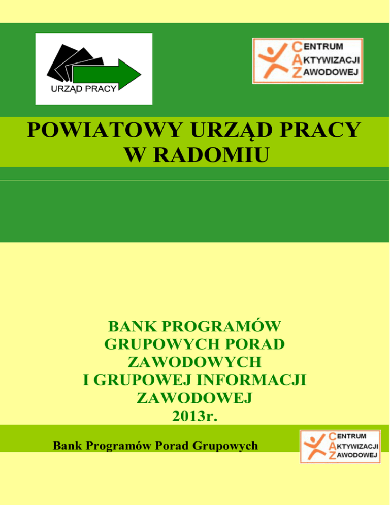 POWIATOWY URZĄD PRACY W RADOMIU BANK PROGRAMÓW GRUPOWYCH PORAD ZAWODOWYCH I GRUPOWEJ INFORMACJI ZAWODOWEJ 2013r. Bank Programów Porad Grupowych i Grupowych Informacji Zawodowych w Powiatowym Urzędzie Pracy w Radomiu Grupowe poradnictwo zawodowe 1. Bądź atrakcyjna na rynku pracy 2. Kwestionariusz Zainteresowań Zawodowych – skarbnicą wiedzy o sobie 3. Jak skutecznie poruszać się po rynku pracy, aby odnieść sukces 4. Odkrycie swojego potencjału zawodowego 5. Autoprezentacja – pierwszy krok do sukcesu 6. Bilans kompetencji – badanie predyspozycji zawodowych i osobowościowych osób bezrobotnych 7. Moje szanse na lokalnym rynku pracy. 8. Odkrycie i promocja swojego potencjału na rynku pracy Grupowa informacja zawodowa 1. Poznaj usługi rynku pracy 2. Własna firma – krok po kroku. Bądź atrakcyjna na rynku pracy Cel porady grupowej Przygotowanie kobiet do wejścia na rynek pracy - wzbogacenie ich atrakcyjności poprzez wykreowanie własnego wizerunku. Czas trwania porady grupowej i sposób organizacji Warsztaty jednodniowe, 5 godziny zegarowe ( od 10.oo do 15.oo), odbywające się w Powiatowym Urzędzie Pracy w Radomiu w Centrum Aktywizacji zawodowej ul. Ks. Łukasika 3 (I piętro), pok. 220, 221 (Klub Pracy). Wymagania wstępne dla uczestników porady grupowej Kobiety zarejestrowane w Powiatowym Urzędzie Pracy w Radomiu i Filie, zainteresowane tematem porady grupowej. Główne zagadnienia: 1. Sytuacja kobiet na rynku pracy - oczekiwania pracodawców 2. Kreowanie własnego wizerunku 3. Wzmocnienie poczucia własnej wartości 4. A może własna firma? Kwestionariusz Zainteresowań Zawodowych – skarbnicą wiedzy o sobie Cel porady grupowej • Określenie własnych preferencji / zainteresowań zawodowych • Określenie kierunku dalszego kształcenia lub szkolenia • Poznanie przez uczestników przyczyn dotychczasowych niepowodzeń zawodowych Czas trwania porady grupowej i sposób organizacji Warsztaty jednodniowe, 3 godziny zegarowe ( od 10.oo do 13.oo), odbywające się w Powiatowym Urzędzie Pracy w Radomiu w Centrum Aktywizacji zawodowej ul. Ks. Łukasika 3 (I piętro), pok. 220, 221 (Klub Pracy). Wymagania wstępne dla uczestników porady grupowej Osoby bezrobotne zarejestrowane w Powiatowym Urzędzie Pracy w Radomiu i Filie, zainteresowane tematem porady grupowej. Główne zagadnienia: 1. 2. 3. 4. 5. Co to jest KZZ? W czym może pomóc KZZ Jak jest zbudowany KZZ Co jest wynikiem badania KZZ Wykonanie testu KZZ (wersja papierowa) UWAGA! Analiza wyników testu osoby „badanej” tym narzędziem z doradcą zawodowym nastąpi na poradzie indywidualnej w ustalonym terminie. Jak skutecznie poruszać się po rynku pracy aby odnieść sukces Cel porady grupowej Uczestnicy warsztatów zdobędą umiejętności niezbędne do efektywnego poszukiwania i pozyskiwania zatrudnienia. Odkryją swoje preferencje zawodowej i spróbują skonfrontować je z tendencjami na rynku pracy. Dzięki praktycznym ćwiczeniom poznają jak efektywnie przygotować się do spotkania z pracodawcą, dowiedzą się m.in.: jakie są etapy rozmowy kwalifikacyjnej, jakie padają najczęściej pytania. Poznają także zasady planowania kariery zawodowej, wyznaczania sobie celów. Czas trwania porady grupowej i sposób organizacji Warsztaty jednodniowe, 5 godziny zegarowe ( od 10.oo do 15.oo), odbywające się w Powiatowym Urzędzie Pracy w Radomiu w Centrum Aktywizacji zawodowej ul. Ks. Łukasika 3 (I piętro), pok. 220, 221 (Klub Pracy). Wymagania wstępne dla uczestników porady grupowej Osoby bezrobotne zarejestrowane w Powiatowym Urzędzie Pracy w Radomiu i Filie, zainteresowane tematem porady grupowej . Główne zagadnienia: 1. Gdy szukasz pracy – kilka praktycznych wskazówek, strategie wytrwania w poszukiwana pracy 2. Czy znasz dobrze samego siebie – osiem kluczowych wartości 3. Opracowanie planu działania – Plan działania jest odpowiedzią na pytanie - Co mam zrobić aby osiągnąć cel? 4. Metody poszukiwania pracy – budowanie sieci kontaktów bezpośrednich, poszukiwanie ogłoszeń, zawodowi pośrednicy pracy, targi i giełdy pracy, samodzielne zwracanie się do pracodawcy, własne ogłoszenia. 5. Zachowanie interpersonalne w poszukiwaniu pracy 6. Dokumenty aplikacyjne 7. Rozmowa kwalifikacyjna 8. Nowa praca – pierwszy dzień nowej pracy, cechy dobrego pracownika, korzyści wynikające ze stosunku pracy powstałego w oparciu o umowę o pracę, wybrane umowy cywilno-prawne. Odkrycie swojego potencjału zawodowego Cel porady grupowej Określenie swoich mocnych stron, umiejętności i preferencji zawodowych, zwiększenie własne wartości. Czas trwania porady grupowej i sposób organizacji Warsztaty jednodniowe, 5 godziny zegarowe ( od 10.oo do 15.oo), odbywające się w Powiatowym Urzędzie Pracy w Radomiu w Centrum Aktywizacji zawodowej ul. Ks. Łukasika 3 (I piętro), pok. 220, 221 (Klub Pracy). Wymagania wstępne dla uczestników porady grupowej Osoby bezrobotne zarejestrowane w Powiatowym Urzędzie Pracy w Radomiu i Filie, zainteresowane tematem porady grupowej . Główne zagadnienia: 1. Postawy wobec poszukiwania pracy 2. Co to jest potencjał zawodowy (umiejętności, kompetencje, zainteresowania) 3. Osobowość a wybór zawodu 4. Praca zawodowa a mocne strony 5. Zainteresowana a umiejętności 6. Poczucie własnej wartości. Autoprezentacja – pierwszy krok do sukcesu Cel porady grupowej Poznanie własnych mocnych stron i wiary we własne możliwości. Czas trwania porady grupowej i sposób organizacji Warsztaty jednodniowe, 5 godziny zegarowe ( od 10.oo do 15.oo), odbywające się w Powiatowym Urzędzie Pracy w Radomiu w Centrum Aktywizacji zawodowej ul. Ks. Łukasika 3 (I piętro), pok. 220, 221 (Klub Pracy). Wymagania wstępne dla uczestników porady grupowej Osoby bezrobotne zarejestrowane w Powiatowym Urzędzie Pracy w Radomiu i Filie, zainteresowane tematem porady grupowej . Główne zagadnienia: 1. Analiza własnych atutów na rynku pracy 2. Sztuka autoprezentacji. B