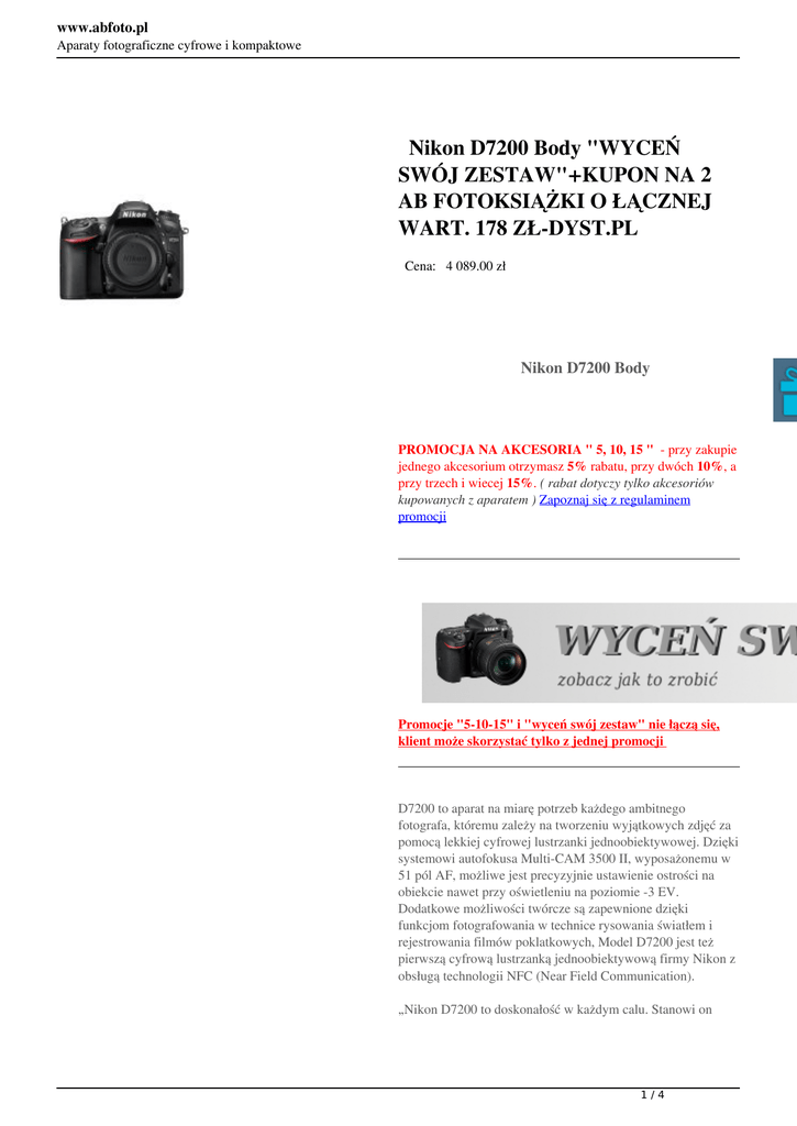 www.abfoto.pl Aparaty fotograficzne cyfrowe i kompaktowe Nikon D7200 Body "WYCEŃ SWÓJ ZESTAW"+KUPON NA 2 AB FOTOKSIĄŻKI O ŁĄCZNEJ WART. 178 ZŁ-DYST.PL Cena: 4 089.00 zł Nikon D7200 Body PROMOCJA NA AKCESORIA " 5, 10, 15 " - przy zakupie jednego akcesorium otrzymasz 5% rabatu, przy dwóch 10%, a przy trzech i wiecej 15%. ( rabat dotyczy tylko akcesoriów kupowanych z aparatem ) Zapoznaj się z regulaminem promocji Promocje "5-10-15" i "wyceń swój zestaw" nie łączą się, klient może skorzystać tylko z jednej promocji D7200 to aparat na miarę potrzeb każdego ambitnego fotografa, któremu zależy na tworzeniu wyjątkowych zdjęć za pomocą lekkiej cyfrowej lustrzanki jednoobiektywowej. Dzięki systemowi autofokusa Multi-CAM 3500 II, wyposażonemu w 51 pól AF, możliwe jest precyzyjnie ustawienie ostrości na obiekcie nawet przy oświetleniu na poziomie -3 EV. Dodatkowe możliwości twórcze są zapewnione dzięki funkcjom fotografowania w technice rysowania światłem i rejestrowania filmów poklatkowych, Model D7200 jest też pierwszą cyfrową lustrzanką jednoobiektywową firmy Nikon z obsługą technologii NFC (Near Field Communication). „Nikon D7200 to doskonałość w każdym calu. Stanowi on 1/4 www.abfoto.pl Aparaty fotograficzne cyfrowe i kompaktowe doskonały wybór zarówno dla doświadczonych fotografów, jak i użytkowników cyfrowych lustrzanek jednoobiektywowych klasy amatorskiej, poszukujących lepszego sprzętu. Zaawansowane funkcje filmowania aparatu D7200 na pewno zainteresują użytkowników, którym zależy na przenośnym sprzęcie do rejestrowania materiału wideo” – powiedziała Marina Gurevich, kierownik ds. produktów w dziale konsumenckich cyfrowych lustrzanek jednoobiektywowych w firmie Nikon Europe. Spełniaj ambicje Nikon D7200 to doskonały aparat do doskonalenia warsztatu fotograficznego. Duża matryca formatu DX, procesor przetwarzania obrazu EXPEED 4 i zakres czułości ISO 100–25600 gwarantują zdjęcia wyróżniające się szerokim zakresem dynamiki, niskim poziomem szumów i bogatymi przejściami tonalnymi. Piętnaście pól krzyżowych w centrum kadru, z których jedno współpracuje z przysłoną f/8, umożliwiają doskonałe uchwycenie obiektu, Aparatem można rejestrować zdjęcia z szybkością do 6 kl./s w formacie DX i do 7 kl./s w trybie kadrowania 1,3x Tryb kadrowania 1,3x umożliwia wydłużenie ogniskowej obiektywów NIKKOR DX nawet o 30%. Wszechstronne funkcje filmowania Model D7200 pozwala nagrywać filmy Full HD z szybkością do 25p/30p lub przełączyć się na tryb kadrowania 1,3x i rejestrować filmy w rozdzielczości do 1080/50p/60p. Aparat umożliwia korzystanie z funkcji Automatyczny dobór ISO w trybie M, gwarantującej płynne przejścia pomiędzy zacienionymi i jasnymi obszarami. Można też skorzystać z dodatkowych modułów Wyświetlanie Obszarów Prześwietlonych, Picture Control Równomierne oraz zaawansowanych funkcji sterowania dźwiękiem. Wyższy poziom udostępniania Aparat D7200 firmy Nikon to pierwsza cyfrowa lustrzanka jednoobiektywowa z obsługą zarówno sieci Wi-Fi, jak i technologii NFC. Aby przesłać zdjęcia do urządzenia inteligentnego z obsługą technologii NFC, wystarczy dotknąć urządzeniem aparatu D7200. Można też użyć wbudowanego interfejsu Wi-Fi do przesyłania zdjęć za pośrednictwem zgodnego smartfonu bądź tabletu. Poszukuj, twórz, eksperymentuj Monitor nowego aparatu ma przekątną 8 cm (3,2 cala) i rozdzielczość 1 229 000 punktów, a jego balans kolorów oraz jasność można podczas fotografowania dostosować do osobistych preferencji. W konstrukcji wizjera zastosowano organiczny wyświetlacz elektroluminescencyjny o wysokiej 2/4 www.abfoto.pl Aparaty fotograficzne cyfrowe i kompaktowe jasności i kontrastowości prezentowanych informacji oraz niskim poborze mocy. Autorski system Picture Control drugiej generacji dostarcza cennych narzędzi, zapewniających pełną kontrolę nad wyostrzaniem, kontrastem, jasnością, odcieniem, przejrzystością i nasyceniem zdjęć i materiału filmowego. Dodatkowe możliwości kreatywne oferuje funkcja rejestrowania zdjęć poklatkowych z płynnymi zmianami ekspozycji za pomocą prostych operacji w menu. Aparat umożliwia też tworzenie efektownych fotografii w technice rysowania światłem z zastosowaniem trybu zdjęć seryjnych z czasem otwarcia migawki 4 s lub dłuższym. Podsumowanie najważniejszych funkcji modelu D7200: Matryca formatu DX o rozdzielczości 24,2 mln pikseli umożliwia rejestrowanie zdjęć o szerokim zakresie dynamiki, niskim poziomie szumów i bogatych przejściach tonalnych. EXPEED 4 znacznie zwiększa ogólną wydajność aparatu i umożliwia uzyskanie doskonałych rezultatów. Profesjonalny autofokus: 51-polowy system AF Multi-CAM 3500 II. Działa nawet przy poziomie oświetlenia -3 EV (ISO 100, 20°C). Szeroki zakres czułości ISO - 100–25600. Tryb zdjęć seryjnych o dużej szybkości do 6 kl./s w formacie DX i do 7 kl./s w trybie kadrowania 1,3x pozwala zarejestrować w jednej serii maksymalnie 27 zdjęć w 12-bitowym formacie RAW i maksymalnie 100 zdjęć wysokiej jakości w formacie JPEG². Zdjęcia seryjne bez ograniczeń: jedyne ograniczenie liczby rejestrowanych zdjęć wykonywanych z czasem otwarcia migawki 4 s i dłuższym wynika z pojemności karty pamięci i wydajności zasilania. Film poklatkowy: możliwość rejestrowania sekwencji poklatkowych z płynnymi zmianami ekspozycji. Łatwa łączność: obsługa sieci Wi-Fi1 i technologii NFC ułatwia udostępnianie wykonanych zdjęć. Funkcja nagrywania filmów D-Movie - filmy Full HD formatu DX z szybkością do 25p/30p lub filmy w rozdzielczości do 1080/50p/60p w trybie kadrowania 1,3x 3/4 www.abfoto.pl Aparaty fotograficzne cyfrowe i kompaktowe Nagrywanie dźwięku w wysokiej jakości: zaawansowane opcje sterowania pozwalają uzyskać materiał filmowy z dźwiękiem profesjonalnej jakości. Tryb kadrowania 1,3x wydłużona ogniskowa,