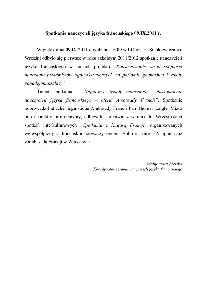 Spotkanie nauczycieli języka francuskiego 09.IX.2011 r. W piątek dnia 09.IX.2011 o godzinie 16.00 w LO im. H. Sienkiewicza we Wrześni odbyło się pierwsze w roku szkolnym 2011/2012 spotkanie nauczycieli języka francuskiego w ramach projektu „Konstruowanie zasad spójności nauczania przedmiotów ogólnokształcących na poziomie gimnazjum i szkoły ponadgimnazjalnej”. Temat spotkania: „Najnowsze trendy nauczania - doskonalenie nauczycieli języka francuskiego – oferta Ambasady Francji”. Spotkanie poprowadził attaché linguistique Ambasady Francji Pan Thomas Laigle. Miało ono charakter informacyjny, odbywało się również w ramach Wrzesińskich spotkań interkulturowych „Spotkania z Kulturą Francji” organizowanych we współpracy z francuskim stowarzyszeniem Val de Loire –Pologne oraz z ambasadą Francji w Warszawie. Małgorzata Bielska Koordynator zespołu nauczycieli języka francuskiego