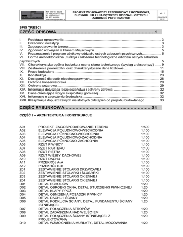 NIP 949 167 36 28 ul. Róży Wiatrów 13/3 53-023 Wrocław tel. 603 950 959 mail [email protected] PROJEKT WYKONAWCZY PRZEBUDOWY Z ROZBUDOWĄ BUDYNKU NR 21 NA POTRZEBY ODDZIAŁU OSTRYCH ZABURZEŃ PSYCHICZNYCH str. 1 GRUDZIEŃ 2012 SPIS TREŚCI CZĘŚĆ OPISOWA…………………………………………..……………….1 I. Podstawa opracowania:..................................................................................................... 3 II. Przedmiot inwestycji .......................................................................................................... 3 III. Zagospodarowanie terenu: ................................................................................................ 3 IV. Zgodność rozwiązań z Planem Miejscowym ...................................................................... 5 V. Przeznaczenie i program użytkowy oddziału ostrych zaburzeń psychicznych.................... 5 VI. Forma architektoniczna , funkcja i założenia technologiczne oddziału ostrych zaburzeń psychicznych .............................................................................................................................. 5 VII. Charakterystyka ogólna budynku z oceną stanu technicznego (wyciąg z ekspertyzy) ....... 9 VIII. Zestawienia powierzchni oraz charakterystyczne dane liczbowe ..................................... 11 IX. Prace budowlane ............................................................................................................. 15 X. Konstrukcja...................................................................................................................... 23 XI. Dostępność dla osób niepełnosprawnych ........................................................................ 28 XII. Ochrona konserwatorska ................................................................................................. 29 XIII. Ochrona pożarowa .......................................................................................................... 29 XIV. Informacja dotycząca bezpieczeństwa i ochrony zdrowia: ............................................... 32 XV. Dane określające wpływ eksploatacji górniczej ................................................................ 32 XVI. Informacje o zagrożeniu środowiska ................................................................................ 32 XVII. Klasyfikacja dopuszczalnych nieistotnych odstąpień od projektu budowlanego ............... 33 CZĘŚĆ RYSUNKOWA………………………..…………..……………….34 CZĘŚĆ I – ARCHITEKTURA I KONSTRUKCJE A01 A02 A03 A04 A05 A06 A07 A08 A09 A10 A11 A12 Z01 Z02 Z03 Z04 D01 D02 D03 D04 D05 D06 D07 D08 D09 D10 PROJEKT ZAGOSPODAROWANIE TERENU ELEWACJA POŁUDNIOWO-WSCHODNIA ELEWACJA PÓŁNOCNO-WSCHODNIA ELEWACJA POŁUDNIOWO-ZACHODNIA ELEWACJA PÓŁNOCNO-ZACHODNIA RZUT PIWNICY RZUT PARTERU RZUT PIĘTRA RZUT WIĘźBY DACHOWEJ RZUT DACHU PRZEKRÓJ A-A PRZEKRÓJ B-B ZESTAWIENIE STOLARKI DRZWIOWEJ ZESTAWIENIE STOLARKI I ŚLUSARKI ZESTAWIENIE STOLARKI OKIENNEJ ZESTAWIENIE STOLARKI OKIENNEJ DETAL SCHODÓW DETAL OBRÓBKI OKNA, DETAL STUDZIENKI PIWNICZNEJ DETAL KLAPY PPOŻ. DETAL OBNIŻENIA POSADZKI PIWNICY DETAL DACHU I ŚCIANY DETAL PODKUCIA ŚCIANY, DETAL FUNDAMENTU ŚCIANY ISTNIEJĄCEJ DETAL POŁĄCZENIA STROPÓW DETAL ZADASZENIA NAD WEJŚCIEM DETAL POŁĄCZENIA ŚCIANY ISTNIEJĄCEJ Z PROJEKTOWANĄ DETAL WZMOCNIENIA MURŁATY, DETAL MOCOWANIA 1:500 1:100 1:100 1:100 1:100 1:100 1:100 1:100 1:100 1:100 1:100 1:100 1:100 1:100 1:100 1:100 1:20 1:20 1:20 1:20 1:20 1:20 1:20 1:20 1:20 1:20 NIP 949 167 36 28 ul. Róży Wiatrów 13/3 53-023 Wrocław tel. 603 950 959 mail [email protected] K01 K02 K03 K04 K05 K06 K07 K08 K09 K09A K010 K011 K012 K013 K014 K015 K016 K016A K016B K016C K017 K018 K019 K020 K021 INW.01 INW.02 INW.03 INW.04 INW.05 INW.06 INW.07 PROJEKT WYKONAWCZY PRZEBUDOWY Z ROZBUDOWĄ BUDYNKU NR 21 NA POTRZEBY ODDZIAŁU OSTRYCH ZABURZEŃ PSYCHICZNYCH KROKWI RZUT FUNDAMENTÓW RZUT STROPU NAD PIWNICĄ RZUT STROPU NAD PARTEREM RZUT STROPU NAD PIĘTREM RZUT KONSTRUKCJI PODDASZA ZBROJENIE SZYBU DźWIGU ZBROJENIE SZYBU DźWIGU PŁYTA FUNDAMENTOWA POD SZYB DŹWIG OSOBOWY SZPITALNY-PRZEKRÓJ DŹWIG OSOBOWY SZPITALNY-RZUT SZYB POD WINDĘ GASTRONIMICZNĄ ZBROJENIE KLATKI K3 ZBROJENIE KLATKI K3 KLATKA K2 ZBROJENIE KLATKI K2 ZBROJENIE NADPROŻY ZBROJENIE BELEK ŻELBETOWYCH ZBROJENIE BELEK ŻELBETOWYCH ZBROJENIE BELEK ŻELBETOWYCH ZBROJENIE BELEK ŻELBETOWYCH ZBROJENIE WIEŃCY I TRZPIENI ZBROJENIE ŚCIANY ŻELBETOWEJ ZBROJENIE ŚCIANY ŻELBETOWEJ ZBROJENIE ŚCIANY ŻELBETOWEJ ZBROJENIE FUNDAMENTÓW ELEWACJA PŁN.-ZACH., PŁD.-ZACH. ELEWACJA PŁD.-WSCH., PŁN.-WSCH. RZUT PIWNICY RZUT PARTERU RZUT PIĘTRA RZUT WIĘźBY RZUT DACHU 1:100 1:100 1:100 1:100 1:100 1:25 1:25 1:25 1:50 1:25 1:25 1:25 1:25 1:25 1:25 1:25 1:25 1:25 1:25 1:25 1:20 1:20 1:20 1:20 1:25 1:100 1:100 1:100 1:100 1:100 1:100 1:100 str. 2 GRUDZIEŃ 2012 NIP 949 167 36 28 ul. Róży Wiatrów 13/3 53-023 Wrocław tel. 603 950 959 mail [email protected] PROJEKT WYKONAWCZY PRZEBUDOWY Z ROZBUDOWĄ BUDYNKU NR 21 NA POTRZEBY ODDZIAŁU OSTRYCH ZABURZEŃ PSYCHICZNYCH str. 3 GRUDZIEŃ 2012 CZĘŚĆ I – ARCHITEKTURA I KONSTRUKCJE I. 1. 2. 3. 4. 5. 6. II. Podstawa opracowania: Umowa o prace projektowe Projekt budowlany Inwentaryzacja budynku. Obowiązujące przepisy, normy oraz wytyczne w zakresie projektowania. Program funkcjonalno-użytkowy Uzgodnienia z inwestorem Przedmiot inwestycji Przedmiotem inwestycji jest opracowanie dokumentacji projektowej przebudowy i rozbudowy budynku nr 21 zlokalizowanego na terenie Samodzielnego Publicznego Psychiatrycznego Zakładu Opieki Zdrowotnej im. dr. Stanisława Deresza w Choroszczy przy Placu Z. Brodowicza 1 na działce nr 101/26. Budynek objęty opracowaniem powstał około 1900r jako jeden z obiektów dawnej fabryki włókienniczej Moesow, dostosowany w późniejszym czasie do potrzeb szpitala psychiatrycznego. Inwestycja pod nazwą 