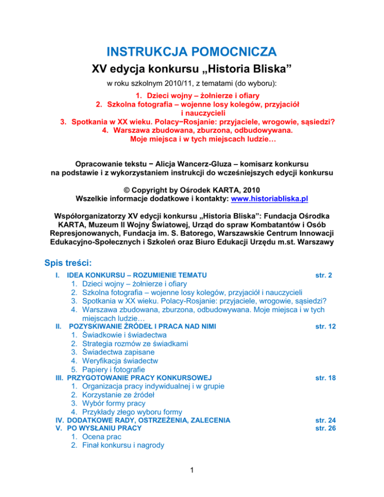 INSTRUKCJA POMOCNICZA XV edycja konkursu „Historia Bliska” w roku szkolnym 2010/11, z tematami (do wyboru): 1. Dzieci wojny – żołnierze i ofiary 2. Szkolna fotografia – wojenne losy kolegów, przyjaciół i nauczycieli 3. Spotkania w XX wieku. Polacy−Rosjanie: przyjaciele, wrogowie, sąsiedzi? 4. Warszawa zbudowana, zburzona, odbudowywana. Moje miejsca i w tych miejscach ludzie… Opracowanie tekstu − Alicja Wancerz-Gluza – komisarz konkursu na podstawie i z wykorzystaniem instrukcji do wcześniejszych edycji konkursu © Copyright by Ośrodek KARTA, 2010 Wszelkie informacje dodatkowe i kontakty: www.historiabliska.pl Współorganizatorzy XV edycji konkursu „Historia Bliska”: Fundacja Ośrodka KARTA, Muzeum II Wojny Światowej, Urząd do spraw Kombatantów i Osób Represjonowanych, Fundacja im. S. Batorego, Warszawskie Centrum Innowacji Edukacyjno-Społecznych i Szkoleń oraz Biuro Edukacji Urzędu m.st. Warszawy Spis treści: I. IDEA KONKURSU – ROZUMIENIE TEMATU 1. 2. 3. 4. II. Dzieci wojny – żołnierze i ofiary Szkolna fotografia – wojenne losy kolegów, przyjaciół i nauczycieli Spotkania w XX wieku. Polacy-Rosjanie: przyjaciele, wrogowie, sąsiedzi? Warszawa zbudowana, zburzona, odbudowywana. Moje miejsca i w tych miejscach ludzie… POZYSKIWANIE ŹRÓDEŁ I PRACA NAD NIMI 1. 2. 3. 4. 5. str. 12 Świadkowie i świadectwa Strategia rozmów ze świadkami Świadectwa zapisane Weryfikacja świadectw Papiery i fotografie III. PRZYGOTOWANIE PRACY KONKURSOWEJ 1. 2. 3. 4. str. 2 str. 18 Organizacja pracy indywidualnej i w grupie Korzystanie ze źródeł Wybór formy pracy Przykłady złego wyboru formy IV. DODATKOWE RADY, OSTRZEŻENIA, ZALECENIA V. PO WYSŁANIU PRACY 1. Ocena prac 2. Finał konkursu i nagrody 1 str. 24 str. 26 I. IDEA KONKURSU – ROZUMIENIE TEMATU 1. Dzieci wojny – żołnierze i ofiary Często natrafiamy na te „migawki” w telewizji: ogarnięty wojną region świata, strzelający żołnierze, bomby, wybuchy, zabici i ranni, uciekająca ludność cywilna, cierpienie, głód, strach… Czy jest to kraj sąsiedzki czy odległy geograficznie – wszystko wydaje się być „na wyciagnięcie ręki”: przez plastyczność krwawych obrazów, czasem przez obecność tam naszych żołnierzy, różne sojusznicze powiązania i np. grożące w konsekwencji zaangażowania się po którejś ze stron konfliktu − terrorystyczne akcje odwetowe. W pewnym sensie każda wojna staje się nasza i każda może stać się światową. Straszliwym efektem rozwoju maszynerii wojennej w XXI wieku, jest to, co już rozpoczęła II wojna światowa w wieku ubiegłym – zanikanie wyrazistych linii frontów i przeniesienie ciężaru masowych strat ludzkich z armii (żołnierze) na całe społeczności walczących krajów (ludność cywilna) – wojny stają się wszechogarniające, totalne. Zbliżenia na ekranie pozwalają spojrzeć z bliska w oczy żołnierzy i ofiar. Często są to twarze dzieci. Dzieci porwane ze szkół czy przydomowych pół i siłą wcielone do oddziałów partyzanckich w Ugandzie, Kongo, Nikaragui.., dzieci dżihadu, kilkuletni bojownicy Hamasu… Czy z takiej − dzisiejszej − perspektywę można bez emocji patrzeć na pomnik Małego Powstańca na warszawskiej Starówce? Mali żołnierze – to zawsze ofiary wojny! Takie założenie pozwoli nam rekomendować ten temat do badania konkursowego bez poczucia relatywizmu historyczno-moralnego – po prosty pragniemy przyjąć tu perspektywę dziecięcych świadków najtrudniejszej historii. ● XX wiek przetoczył się przez terytorium Polski wojnami i totalitaryzmami. Ta pierwsza − Wielka Wojna (jak ją długo nazywano nim wojny światowe zaczęto numerować) mimo walk bratobójczych polskiego żołnierza w armii rosyjskiej, pruskiej, austriackiej − wskrzesiła po latach niewoli niepodległe państwo polskie. Kolejne konflikty zbrojne: wojna polsko-ukraińska (19181919), potem polsko-bolszewicka roku 1920, a także walka o granicę zachodnią (powstanie wielkopolskie i powstania śląskie), starcia na Zaolziu, zajęcie Litwy Środkowej − towarzyszyły temu bolesnemu odradzaniu się Polski i pokazały, jak trudny i długotrwały musiał być to proces. II wojna światowa przyszła potem tak szybko, przyniosła agresję ze strony dwóch sąsiadów: nazistowskich Niemiec z zachodu i komunistycznego Związku Radzieckiego ze wschodu − stanowiła dla młodego państwa niewyobrażalny kataklizm: rujnacja kraju, represje i śmierć milionów, potem przesunięcie granic i konieczność przesiedlenia setek tysięcy obywateli. Straty ludzkie spowodowane obydwiema okupacjami w latach 1939−1945 przekroczyły wszelkie dotychczasowe wyobrażenia, co do możliwego losu ludności cywilnej w kraju dotkniętym wojną. Stowarzyszenia Dzieci Wojny w Polsce, przedstawiając genezę swojego powstania dokonuje swoistej „autodefinicji”: W wyniku agresji na Polskę w dniu 1 września 1939 roku, zwłaszcza zbrodniczej polityki ludobójstwa i masowego terroru III Rzeszy Niemieckiej, śmierć poniosło ponad 2 mln dzieci polskich, a ponad 200 tys. zostało zabranych od rodzin, przy czym z tej liczby zaginęło bez wieści ok. 170 tys. Dzieci polskie ginęły podczas działań i wydarzeń wojennych w więzieniach i obozach zagłady, były mordowane w katowniach gestapo, w „szpitalach”, poddawane pseudomedycznym eksperymentom, w czasie wykonywania ciężkiej i 2 nieludzkiej pracy fizycznej, z głodu, zimna, szykan i poniewierki. Po zakończeniu działań wojennych, w maju 1945 roku tysiące dzieci, zwłaszcza pozbawionych opieki rodzicielskiej, znalazło się w niezwykle trudnym położeniu. Brakowało nam wszystkiego: ciepła rodzinnego, elementarnych warunków egzystencji, często dachu nad głową.1 Pomijając sprawę padających tu liczb (ofiary II wojny ciągle czekają na „dokładne policzenie” i indywidualne upamiętnienie!) warto zwrócić uwagę, że podkreślany jest właśnie aspekt martyrologii,