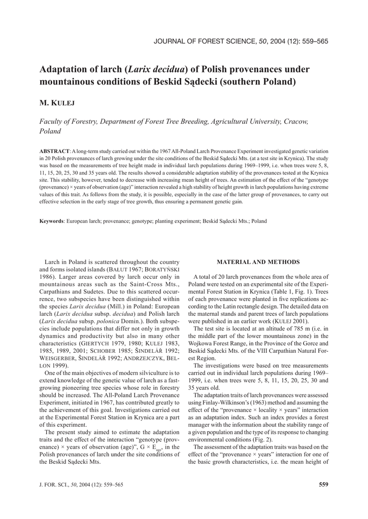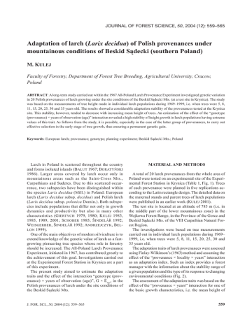 JOURNAL OF FOREST SCIENCE, 50, 2004 (12): 559–565 Adaptation of larch (Larix decidua) of Polish provenances under mountainous conditions of Beskid Sądecki (southern Poland) M. KULEJ Faculty of Forestry, Department of Forest Tree Breeding, Agricultural University, Cracow, Poland ABSTRACT: A long-term study carried out within the 1967 All-Poland Larch Provenance Experiment investigated genetic variation in 20 Polish provenances of larch growing under the site conditions of the Beskid Sądecki Mts. (at a test site in Krynica). The study was based on the measurements of tree height made in individual larch populations during 1969–1999, i.e. when trees were 5, 8, 11, 15, 20, 25, 30 and 35 years old. The results showed a considerable adaptation stability of the provenances tested at the Krynica site. This stability, however, tended to decrease with increasing mean height of trees. An estimation of the effect of the “genotype (provenance) × years of observation (age)” interaction revealed a high stability of height growth in larch populations having extreme values of this trait. As follows from the study, it is possible, especially in the case of the latter group of provenances, to carry out effective selection in the early stage of tree growth, thus ensuring a permanent genetic gain. Keywords: European larch; provenance; genotype; planting experiment; Beskid Sądecki Mts.; Poland Larch in Poland is scattered throughout the country and forms isolated islands (BAŁUT 1967; BORATYŃSKI 1986). Larger areas covered by larch occur only in mountainous areas such as the Saint-Cross Mts., Carpathians and Sudetes. Due to this scattered occurrence, two subspecies have been distinguished within the species Larix decidua (Mill.) in Poland: European larch (Larix decidua subsp. decidua) and Polish larch (Larix decidua subsp. polonica Domin.). Both subspecies include populations that differ not only in growth dynamics and productivity but also in many other characteristics (GIERTYCH 1979, 1980; KULEJ 1983, 1985, 1989, 2001; SCHOBER 1985; ŠINDELÁŘ 1992; WEISGERBER, ŠINDELÁŘ 1992; ANDRZEJCZYK, BELLON 1999). One of the main objectives of modern silviculture is to extend knowledge of the genetic value of larch as a fastgrowing pioneering tree species whose role in forestry should be increased. The All-Poland Larch Provenance Experiment, initiated in 1967, has contributed greatly to the achievement of this goal. Investigations carried out at the Experimental Forest Station in Krynica are a part of this experiment. The present study aimed to estimate the adaptation traits and the effect of the interaction “genotype (provenance) × years of observation (age)”, G × Eage, in the Polish provenances of larch under the site conditions of the Beskid Sądecki Mts. J. FOR. SCI., 50, 2004 (12): 559–565 MATERIAL AND METHODS A total of 20 larch provenances from the whole area of Poland were tested on an experimental site of the Experimental Forest Station in Krynica (Table 1, Fig. 1). Trees of each provenance were planted in five replications according to the Latin rectangle design. The detailed data on the maternal stands and parent trees of larch populations were published in an earlier work (KULEJ 2001). The test site is located at an altitude of 785 m (i.e. in the middle part of the lower mountainous zone) in the Wojkowa Forest Range, in the Province of the Gorce and Beskid Sądecki Mts. of the VIII Carpathian Natural Forest Region. The investigations were based on tree measurements carried out in individual larch populations during 1969– 1999, i.e. when trees were 5, 8, 11, 15, 20, 25, 30 and 35 years old. The adaptation traits of larch provenances were assessed using Finlay-Wilkinson’s (1963) method and assuming the effect of the “provenance × locality × years” interaction as an adaptation index. Such an index provides a forest manager with the information about the stability range of a given population and the type of its response to changing environmental conditions (Fig. 2). The assessment of the adaptation traits was based on the effect of the “provenance × years” interaction for one of the basic growth characteristics, i.e. the mean height of 559 Table 1. Location of maternal stands of larches investigated at a test site in Krynica within 1967 All-Poland Larch Provenance Experiment; numbering of provenances according to KOCIĘCKI (1977) Prov. Provenance name No. Geographical coordinates latitude longitude Altitude (m) Natural forest region Natural forest province 1 Myślibórz Północ 52°54´ 14°52´ 50–75 I – Bałtycka Niziny Szczecińskiej 2 Pelplin 53°56´ 18°43´ 50–75 I – Bałtycka Pojezierza DrawskoKaszubskiego 4 Konstancjewo “Płonne” reserve 53°07´ 19°04´ 50–75 III – WielkopolskoPomorska Pojezierza ChełmińskoDobrzyńskiego 6 Konstancjewo “Tomkowo” reserve 53°07´ 19°04´ 50–75 III – WielkopolskoPomorska Pojezierza ChełmińskoDobrzyńskiego 7 Czerniejewo 52°26´ 17°30´ 100–120 III – WielkopolskoPomorska Niziny WielkopolskoKujawskiej 8 Rawa Mazowiecka 51°48´ 20°15´ 180 IV – MazowieckoPodlaska Równiny WarszawskoKutnowskiej 9 Grójec 51°52´ 20°52´ 180 IV – MazowieckoPodlaska Równiny WarszawskoKutnowskiej 10 Marcule 51°08´ 21°15´ 200–220 VI – Małopolska Radomsko-Iłżecka 11 Skarżysko 51°10´ 20°46´ 350–400 VI – Małopolska Gór Świętokrzyskich 12 Bliżyn 51°05´ 20°45´ 280–320 VI – Małopolska Gór Świętokrzyskich 13 Świętokrzyski PN 50°55´ 21°04´ 300–400 VI – Małopolska Gór Świętokrzyskich 14 Moskorzew 50°39´ 19°56´ 250 VI – Małopolska Wyżyny Środkowomałopolskiej 16 Hołubla 49°48´ 22°48´ 300–350 VIII – Karpacka Pogórza Karpackiego 18 Krościenko 49°27´ 20°26´ 640–660 VIII – Karpacka Gorców i Beskidu Sądeckiego 19 Pilica 50°28´ 19°40´ 450 VI – Małopolska Wyżyny KrakowskoCzęstochowskiej 20 Prószków 50°35´ 17°52´ 180 V – Śląska R