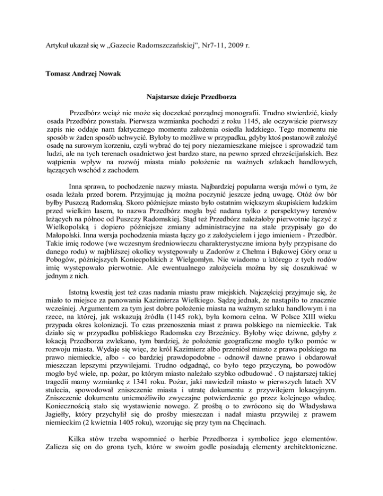 Artykuł ukazał się w „Gazecie Radomszczańskiej”, Nr7-11, 2009 r. Tomasz Andrzej Nowak Najstarsze dzieje Przedborza Przedbórz wciąż nie może się doczekać porządnej monografii. Trudno stwierdzić, kiedy osada Przedbórz powstała. Pierwsza wzmianka pochodzi z roku 1145, ale oczywiście pierwszy zapis nie oddaje nam faktycznego momentu założenia osiedla ludzkiego. Tego momentu nie sposób w żaden sposób uchwycić. Byłoby to możliwe w przypadku, gdyby ktoś postanowił założyć osadę na surowym korzeniu, czyli wybrać do tej pory niezamieszkane miejsce i sprowadzić tam ludzi, ale na tych terenach osadnictwo jest bardzo stare, na pewno sprzed chrześcijańskich. Bez wątpienia wpływ na rozwój miasta miało położenie na ważnych szlakach handlowych, łączących wschód z zachodem. Inna sprawa, to pochodzenie nazwy miasta. Najbardziej popularna wersja mówi o tym, że osada leżała przed borem. Przyjmując ją można poczynić jeszcze jedną uwagę. Otóż ów bór byłby Puszczą Radomską. Skoro późniejsze miasto było ostatnim większym skupiskiem ludzkim przed wielkim lasem, to nazwa Przedbórz mogła być nadana tylko z perspektywy terenów leżących na północ od Puszczy Radomskiej. Stąd też Przedbórz należałoby pierwotnie łączyć z Wielkopolską i dopiero późniejsze zmiany administracyjne na stałe przypisały go do Małopolski. Inna wersja pochodzenia miasta łączy go z założycielem i jego imieniem - Przedbór. Takie imię rodowe (we wczesnym średniowieczu charakterystyczne imiona były przypisane do danego rodu) w najbliższej okolicy występowały u Zadorów z Chełma i Bąkowej Góry oraz u Pobogów, późniejszych Koniecpolskich z Wielgomłyn. Nie wiadomo u którego z tych rodów imię występowało pierwotnie. Ale ewentualnego założyciela można by się doszukiwać w jednym z nich. Istotną kwestią jest też czas nadania miastu praw miejskich. Najczęściej przyjmuje się, że miało to miejsce za panowania Kazimierza Wielkiego. Sądzę jednak, że nastąpiło to znacznie wcześniej. Argumentem za tym jest dobre położenie miasta na ważnym szlaku handlowym i na rzece, na której, jak wskazują źródła (1145 rok), była komora celna. W Polsce XIII wieku przypada okres kolonizacji. To czas przenoszenia miast z prawa polskiego na niemieckie. Tak działo się w przypadku pobliskiego Radomska czy Brzeźnicy. Byłoby więc dziwne, gdyby z lokacją Przedborza zwlekano, tym bardziej, że położenie geograficzne mogło tylko pomóc w rozwoju miasta. Wydaje się więc, że król Kazimierz albo przeniósł miasto z prawa polskiego na prawo niemieckie, albo - co bardziej prawdopodobne - odnowił dawne prawo i obdarował mieszczan lepszymi przywilejami. Trudno odgadnąć, co było tego przyczyną, bo powodów mogło być wiele, np. pożar, po którym miasto należało szybko odbudować . O najstarszej takiej tragedii mamy wzmiankę z 1341 roku. Pożar, jaki nawiedził miasto w pierwszych latach XV stulecia, spowodował zniszczenie miasta i utratę dokumentu z przywilejem lokacyjnym. Zniszczenie dokumentu uniemożliwiło zwyczajne potwierdzenie go przez kolejnego władcę. Koniecznością stało się wystawienie nowego. Z prośbą o to zwrócono się do Władysława Jagiełły, który przychylił się do prośby mieszczan i nadał miastu przywilej z prawem niemieckim (2 kwietnia 1405 roku), wzorując się przy tym na Chęcinach. Kilka stów trzeba wspomnieć o herbie Przedborza i symbolice jego elementów. Zalicza się on do grona tych, które w swoim godle posiadają elementy architektoniczne. Składa się z dwóch wież, ze stożkowymi dachami, flankującymi bramę bez podwoi. W XVIII wieku na pieczęci burmistrzowskiej widniało nieco inne godło. Nadal były to dwie wieże, ale miały korony nad sobą, po środku zaś była wieża luzem, niższa od wież z bramy, zwieńczona stożkowym dachem. Takie godło w herbie miasta wiązało się z obecnością w nim ważnego zamku królewskiego. Henryk Seroka, heraldyk, który zajął się herbami miast Małopolski, tłumaczy pojawienie się w herbie koron próbami odbudowy autorytetu królewskiego w II pół. XVII wieku po okresie zniszczeń wojennych. Pierwsze dziesięciolecia następnego stulecia przyniosły kolejne modyfikacje. W epoce saskiej zaczęto w heraldyce miejskiej stosować nie jedną a kilka koron (trzy w Przedborzu). Autor ten podkreśla, że charakterystyczne jest umieszczenie koron na wieżach budowli, symbolizujących królewskie zamki \ przypada na okres ich zniszczenia i degradacji. Korony królewskie miały symbolizować gwarancję powrotu opieki króla nad miastami i podniesienia ich z upadku. Zamek Zamek przedborski to chyba najbardziej znany zabytek miasta i nie byłoby w tym nic dziwnego, gdyby nie fakt, że obecnie nie istnieje, oraz że tak na prawdę to bardzo niewiele o nim wiadomo. Nim powstał zamek murowany, pewnie mniej więcej w tym samym miejscu musiało istnieć jakieś inne - zapewne drewniane - miejsce obronne. Genezy umocnień tego typu należy dopatrywać się wraz z powstaniem osady leżącej na przeprawie rzecznej. Gdy do tego dodamy, że Pilica była granicą księstw, to umocniony gród staje się prawie faktem. Pytanie tylko, kiedy to nastąpiło? Powszechnie zamek w Przedborzu wiąże się z fundacją Kazimierza Wielkiego. Kronikarz Janko z Czarnkowa pisze o wybudowaniu na nowo dworu i miasta, czyli wcześniej jakieś umocnienia istnieć tu musiały. Jan Długosz piszący w XV wieku już wprost wyliczył przedborski zamek wśród fundacji króla Kazimierza. I jest to całkiem prawdopodobne. Archeolodzy badający sondażowe fragmenty miasta doszli do wniosku, że pierwotny zamek powstał gdzieś między 1350 a 1375 rokiem. Usytuowany był na przeprawie przez rzekę na północ od miasta. Na dawnym wzgórzu zamkowym dzisiaj stoją budynki mieszkalne. Jedynym zachowanym reliktem po tej budowli jest dzisiaj przypora, wykonana z miejscowego piaskowca. Pi