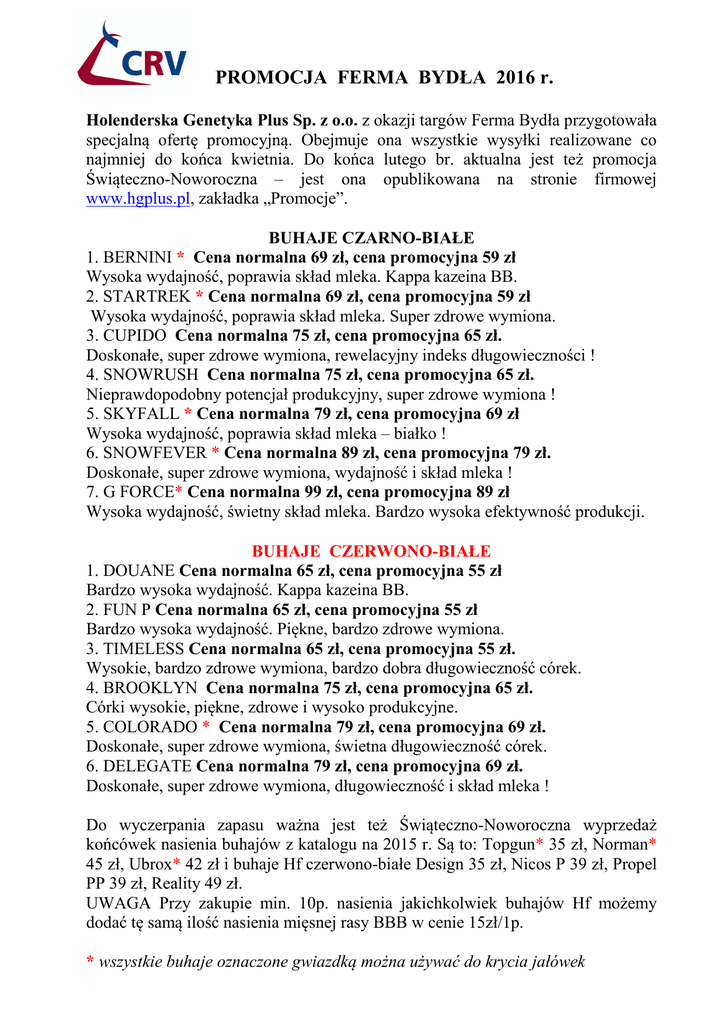 PROMOCJA FERMA BYDŁA 2016 r. Holenderska Genetyka Plus Sp. z o.o. z okazji targów Ferma Bydła przygotowała specjalną ofertę promocyjną. Obejmuje ona wszystkie wysyłki realizowane co najmniej do końca kwietnia. Do końca lutego br. aktualna jest też promocja Świąteczno-Noworoczna – jest ona opublikowana na stronie firmowej www.hgplus.pl, zakładka „Promocje”. BUHAJE CZARNO-BIAŁE 1. BERNINI * Cena normalna 69 zł, cena promocyjna 59 zł Wysoka wydajność, poprawia skład mleka. Kappa kazeina BB. 2. STARTREK * Cena normalna 69 zł, cena promocyjna 59 zł Wysoka wydajność, poprawia skład mleka. Super zdrowe wymiona. 3. CUPIDO Cena normalna 75 zł, cena promocyjna 65 zł. Doskonałe, super zdrowe wymiona, rewelacyjny indeks długowieczności ! 4. SNOWRUSH Cena normalna 75 zł, cena promocyjna 65 zł. Nieprawdopodobny potencjał produkcyjny, super zdrowe wymiona ! 5. SKYFALL * Cena normalna 79 zł, cena promocyjna 69 zł Wysoka wydajność, poprawia skład mleka – białko ! 6. SNOWFEVER * Cena normalna 89 zł, cena promocyjna 79 zł. Doskonałe, super zdrowe wymiona, wydajność i skład mleka ! 7. G FORCE* Cena normalna 99 zł, cena promocyjna 89 zł Wysoka wydajność, świetny skład mleka. Bardzo wysoka efektywność produkcji. BUHAJE CZERWONO-BIAŁE 1. DOUANE Cena normalna 65 zł, cena promocyjna 55 zł Bardzo wysoka wydajność. Kappa kazeina BB. 2. FUN P Cena normalna 65 zł, cena promocyjna 55 zł Bardzo wysoka wydajność. Piękne, bardzo zdrowe wymiona. 3. TIMELESS Cena normalna 65 zł, cena promocyjna 55 zł. Wysokie, bardzo zdrowe wymiona, bardzo dobra długowieczność córek. 4. BROOKLYN Cena normalna 75 zł, cena promocyjna 65 zł. Córki wysokie, piękne, zdrowe i wysoko produkcyjne. 5. COLORADO * Cena normalna 79 zł, cena promocyjna 69 zł. Doskonałe, super zdrowe wymiona, świetna długowieczność córek. 6. DELEGATE Cena normalna 79 zł, cena promocyjna 69 zł. Doskonałe, super zdrowe wymiona, długowieczność i skład mleka ! Do wyczerpania zapasu ważna jest też Świąteczno-Noworoczna wyprzedaż końcówek nasienia buhajów z katalogu na 2015 r. Są to: Topgun* 35 zł, Norman* 45 zł, Ubrox* 42 zł i buhaje Hf czerwono-białe Design 35 zł, Nicos P 39 zł, Propel PP 39 zł, Reality 49 zł. UWAGA Przy zakupie min. 10p. nasienia jakichkolwiek buhajów Hf możemy dodać tę samą ilość nasienia mięsnej rasy BBB w cenie 15zł/1p. * wszystkie buhaje oznaczone gwiazdką można używać do krycia jałówek