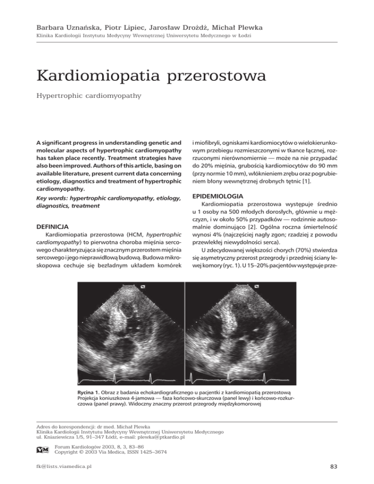 Barbara Uznańska, Piotr Lipiec, Jarosław Drożdż, Michał Plewka Klinika Kardiologii Instytutu Medycyny Wewnętrznej Uniwersytetu Medycznego w Łodzi Kardiomiopatia przerostowa Hypertrophic cardiomyopathy A significant progress in understanding genetic and molecular aspects of hypertrophic cardiomyopathy has taken place recently. Treatment strategies have also been improved. Authors of this article, basing on available literature, present current data concerning etiology, diagnostics and treatment of hypertrophic cardiomyopathy. i miofibryli, ogniskami kardiomiocytów o wielokierunkowym przebiegu rozmieszczonymi w tkance łącznej, rozrzuconymi nierównomiernie — może na nie przypadać do 20% mięśnia, grubością kardiomiocytów do 90 mm (przy normie 10 mm), włóknieniem zrębu oraz pogrubieniem błony wewnętrznej drobnych tętnic [1]. Key words: hypertrophic cardiomyopathy, etiology, diagnostics, treatment EPIDEMIOLOGIA DEFINICJA Kardiomiopatia przerostowa (HCM, hypertrophic cardiomyopathy) to pierwotna choroba mięśnia sercowego charakteryzująca się znacznym przerostem mięśnia sercowego i jego nieprawidłową budową. Budowa mikroskopowa cechuje się bezładnym układem komórek Kardiomiopatia przerostowa występuje średnio u 1 osoby na 500 młodych dorosłych, głównie u mężczyzn, i w około 50% przypadków — rodzinnie autosomalnie dominująco [2]. Ogólna roczna śmiertelność wynosi 4% (najczęściej nagły zgon; rzadziej z powodu przewlekłej niewydolności serca). U zdecydowanej większości chorych (70%) stwierdza się asymetryczny przerost przegrody i przedniej ściany lewej komory (ryc. 1). U 15–20% pacjentów występuje prze- Rycina 1. Obraz z badania echokardiograficznego u pacjentki z kardiomiopatią przerostową Projekcja koniuszkowa 4-jamowa — faza końcowo-skurczowa (panel lewy) i końcowo-rozkurczowa (panel prawy). Widoczny znaczny przerost przegrody międzykomorowej Adres do korespondencji: dr med. Michał Plewka Klinika Kardiologii Instytutu Medycyny Wewnętrznej Uniwersytetu Medycznego ul. Kniaziewicza 1/5, 91–347 Łódź, e-mail: [email protected] Forum Kardiologów 2003, 8, 3, 83–86 Copyright © 2003 Via Medica, ISSN 1425–3674 [email protected] 83 Forum Kardiologów 2003, tom 8, nr 3 Rycina 2. Obraz z badania echokardiograficznego u pacjentki z kardiomiopatią przerostową z zawężaniem drogi odpływu lewej komory — projekcja koniuszkowa 5-jamowa. Badanie dopplerowskie metodą impulsową — profil przepływu w drodze odpływu lewej komory z pomiarem maksymalnej prędkości (4,5 m/s) i gradientu (80 mm Hg) rost podstawy przegrody (> 15 mm), u starszych osób często powiązany z nadciśnieniem tętniczym. U 8–10% osób obserwuje się koncentryczny przerost lewej komory. U części pacjentów dochodzi do dynamicznego zawężenia drogi odpływu lewej komory przez pogrubiałą przegrodę międzykomorową i tak zwany skurczowy ruch przedniego płatka zastawki mitralnej (SAM, systolic anterior motion), co prowadzi do powstania gradientu skurczowego [kardiomiopatia przerostowa z zawężaniem drogi odpływu lewej komory (HOCM, hyperthrophic obstructive cardiomyopathy)] (ryc. 2). U 25% chorych na HCM występuje przewlekłe migotanie przedsionków [3]. ETIOLOGIA Mutacje genetyczne Wyróżniono ponad 150 mutacji w 10 różnych genach kodujących składniki sarkomeru. Niektóre z nich określano jako łagodne, to znaczy wiążące się z prawie normalnym przeżyciem — pogląd ten opiera się na wynikach badania przeprowadzonego tylko wśród pojedynczych rodzin. Obecnie poddaje się w wątpliwość ich łagodny charakter [4]. Poniżej przedstawiono przykładowe mutacje: — chromosom 1q3: gen troponiny T TNNT2. Łagodna: S179F, złośliwe: Int15G1ÆA, DE160, R92Q, 179N; — chromosom 19q13.4: gen troponiny I. Mutacja złośliwa DK183; — chromosom 14q11·2–12: gen łańcucha ciężkiego b-miozyny MYH7. Mutacje złośliwe: R403Q, R453C, G716R, R719W; łagodne: N232S, G256E, F513C, V606M, R719Q, L908V; — chromosom 15q22: gen a-tropomiozyny TPM1. Łagodna: D175N, złośliwa: V95A; — chromosom 11p11.2: gen białka C wiążącego miozynę; 84 — chromosom 7q3: gen podjednostki regulującej kinaz białkowych aktywowanych AMP PRKAg2; — chromosom 3q21: gen lekkiego łańcucha-1 miozyny; — chromosom 12q23–24.3: gen lekkiego łańcucha-2 miozyny; — chromosom 15q14: gen aktyny. Około 35% rodzinnych przypadków HCM wiąże się z mutacjami genu ciężkiego łańcucha b-miozyny, 20% — genu białka C wiążącego miozynę, 15% — genu troponiny T, mniej niż 3% — genu a-tropomiozyny. Kardiomiopatia przerostowa może stanowić część zespołu chorobowego wywołanego mutacją mitochondrialnego DNA. W genie tRNALeu(UUR) rozpoznano 11 patogenetycznych mutacji, kilka z nich powoduje HCM u dzieci lub dorosłych. Najczęstszą taką mutacją jest mtDNA MTTL1*MELAS3243G — występują tu, między innymi, HCM oraz zaburzenia przewodzenia (zespół Wolffa-Parkinsona-White’a) [5]. Kardiomiopatię przerostową początkowo nazywano chorobą sarkomeru (podkreślając jego nieprawidłową budowę, a więc i niesprawność), lecz wydaje się, że trafniejsze jest określenie choroba metaboliczna z ogólnym defektem wykorzystania ATP. Mutacje miozyny mogą upośledzać kurczliwość, co prowadzi do przerostu, natomiast mutacje troponiny I lub a-tropomiozyny ograniczają relaksację. Nieprawidłowością wspólną dla rozmaitych fenotypów mutacji wszystkich białek kurczliwych jest najprawdopodobniej niesprawna produkcja i wykorzystanie ATP w sarkomerze. Mutacja wspólna dla członków danej rodziny powinna wywoływać u nich takie same zmiany morfologiczne, nie stanowi to jednak reguły. Może to się wiązać z czynnikami środowiska, takimi jak ćwiczenia fizyczne, albo z towarzyszącymi chorobami sercowo-naczyniowymi, na przykład nadciśnieniem. Istotne jest indywidualne tło genetyczne, na przykład modyfikującą rolę odgrywają geny 