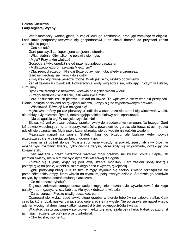 Helena Kutuzowa Lady Mglistej Wyspy Wiatr marszczył wodną gładź, a żagiel łowił go zazdrośnie, próbując zamknąć w objęcia. Łódź łatwo podporządkowywała się gospodarzowi i ten chciał dotrzeć do przystani zanim zepsuje się pogoda. - Coś nie tak? Gard pochwycił zaniepokojone spojrzenie sternika. - Wiatr słabnie. Oby tylko nie pojawiła się mgła. - Mgła? Przy takim wietrze? Gospodarz tylko opędził się od przemądrzałego pasażera. - A dlaczego jezioro nazywają Mlecznym? - Dlaczego, dlaczego... Nie daj Boże pojawi się mgła, wtedy zrozumiesz. Gard uśmiechnął się i wrócił do siostry. - Kołysze? Wytrzymaj jeszcze trochę. Wiatr jest silny, szybko dopłyniemy. Żagiel zaklaskał i zwiotczał. Powierzchnia wody wygładziła się, odbijając, niczym w lustrze, cumulusy. Rybak zakrzątnął się nerwowo, wstawiając ciężkie wiosła w dulki. - Czego siedzicie? Wiosłujcie, jeśli wam życie miłe! Gard posłusznie zrzucił płaszcz i usiadł na ławce. To wpisywało się w warunki przejazdu. Dłonie, pokryte odciskami od rękojeści miecza, ułożyły się na wypolerowanym drewnie. - Wiosłować. Równiej! Nie ociągać się! Mężczyźni, którzy po raz pierwszy usiedli do wioseł, uczciwie starali się wiosłować w takt, ale efekty były mizerne. Rybak, dostrzegając daleko białawy pas, spanikował. - Nie ociągajcie się! Wiosłujcie szybciej! No! Słowa, którymi okraszał rozkazy, przekonywały do nieudawanych zmagań. Na brzegu, Gard już dawno wepchnąłby mu te nieprzyzwoitości z powrotem do gardła, ale teraz, strach rybaka udzielił się pozostałym. Mgła przybliżała, ślizgając się po wodzie nieważkim woalem. Mężczyźni naparli na wiosła. Statek mknął do brzegu, ale białawe kłęby, powoli przetaczając się w czarującym tańcu, dogoniły go. Jasny miraż pożarł słońce. Mgliste strumienie wpełzły na pokład, zgęstniały i wkrótce nie można było rozróżnić twarzy, tylko ciemne zarysy, które zbiły się w gromadę, oczekując na kolejny atak. I ten nastąpił - przez niezliczone warstwy mgły przebiło się światło. Żółte i ciepłe, jak płomień świecy, ale w nim nie było dynamiki właściwej dla ognia. Zbliżało się. Rybak, kryjąc się pod ławą, szeptał modlitwy. Gard zasłonił sobą siostrę i położył rękę na pasie, w pobliżu szerokiego noża z wytartą rękojeścią. Ognik podpłynął bliżej. Tuż za nim, z mgły, wyłoniło się czółno. Światło przesączało się przez żółte szkło lampy, która wisiała na wysokim, pałąkowatym dziobie. Starczało go zaledwie na tyle, by dostrzec postać otuloną płaszczem. - Co mi oddasz, rybaku? Z głosu, zniekształconego przez wodę i mgłę, nie można było wywnioskować do kogo należy – do mężczyzny, czy kobiety. Ale rybak dobrze to wiedział. - Zaraz, zaraz... Proszę chwilę poczekać, pani. Opanował się, wylazł spod ławki, długo grzebał w stercie tobołów na dziobie statku. Cały czas ta, którą rybak nazwał panią, stała, opierając się na wiośle. Nie poruszyła się nawet wtedy, gdy ten wyciągnął drewnianą klatkę i przeniósł bliżej jedynego źródła światła. W klatce, bez życia, zwiesiwszy głowę między prętami, leżała pstra kura. Rybak poszturchał ją, mając nadzieję, że ptak po prostu zdrętwiał. - Chwileczkę, moment... 1 Ale, ile by nie potrząsł pstrą grudką, cud się nie wydarzył. Kiedy nadzieja rozruszania kury uleciała, kobieta znów spytała: - Co mi oddasz, rybaku? Nieborak zajęczał. Bezradnie popatrzył na pasażerów i zakomunikował ochrypłym nagle głosem: - Jeden z was musi pójść z nią. Napięcie zawrzało, niczym rzeka gotowa przerwać śluzy i buszującym potokiem wyrwało się na zewnątrz: - Dlaczego? Kim ona jest, że powinniśmy iść z nią? Rybak, którym mężczyźni potrząsali jak drzewem owocowym w porze dojrzewania płodów, próbował wyjaśnić: - Mglista Lady zawsze zabiera życie. Jedni wożą ze sobą kurę, inni kotkę lub psa. Inaczej, zabierze człowieka. Dlatego ktoś powinien pójść z nią. - Więc idź z nią! - rybaka popchnięto w kierunku burty. - Nie mogę! - mężczyzna rozpaczliwie wczepił się w mokre od mgły i bryzg deski. - Mam starą żonę, dzieci... - A my? Myślisz, że nie mamy? - Może i macie. Ale to jest moja łódź i wątpię, czy ktoś z was dobrze zna wody Mlecznego Jeziora, by doprowadzić ją bezpiecznie do brzegu? Paniczny skowyt rybaka ostudził mężczyzn. Gniew się uśmierzył, zostawiając strach i zakłopotanie. - A co będzie, jeśli ta Lady nie otrzyma tego, czego żąda? - Wtedy wszyscy odpłyniemy w mgłę, żeby wiecznie tułać się w mlecznej ułudzie. Cisza stała się namacalna i gęsta, jak dobowa śmietanka i cichy głos Mglistej Lady zabrzmiał spiżem: - Co mi oddasz, rybaku? Gard popatrzył na siostrę. Ta konwulsyjnie tuliła w swój płaszcz córeczkę, starając się uchronić ją nie tyle od wilgoci, ile od lepkiego przerażenia przesycającego powietrze. Na brzegu, który nagle stał się dla nich taki daleki, czekał mąż. Rybak... On ma rację. Bez niego, nikt nie dotrze do brzegu. Pozostali mało go interesowali - ratować świata nie zamierzał. Ale śmiech małej siostrzenicy, która ciągnęła do niego rączyny i zapalczywy blask w oczach swojej młodszej siostry, musi zachować za wszelką cenę. - Weźmiesz mnie! Pójdę z tobą, dostojna pani! - Gard! Siostra wczepiła się w rękaw, ale Gard z uśmiechem odsunął ją od siebie i zwrócił się do rybaka: - Przekaż ją osobiście do rąk męża. Jeśli oszukasz - wrócę z mgły i ona wyda ci się pożądaną częścią twego życia. - Oczywiście, panie. Gard objął na pożegnanie siostrę, chwycił niepotrzebny płaszcz i wyskoczył za burtę, prosto do czółna. Mała łódka nawet się nie zachwiała, jakby stała nie na wodzie, a na brzegu. Mglista Lady bez słowa wskazała na dziób i Gard posłusznie usiadł na jasnej desce. 