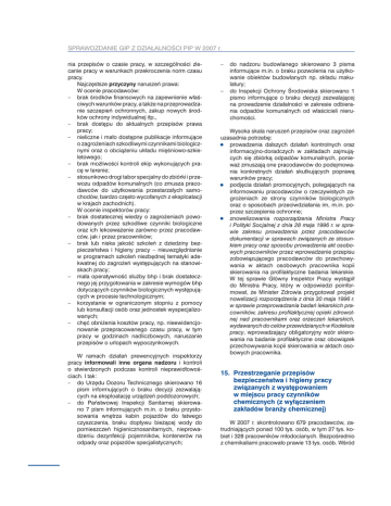 SPRAWOZDANIE GIP Z DZIAŁALNOŚCI PIP W 2007 r. nia przepisów o czasie pracy, w szczególności zlecanie pracy w warunkach przekroczenia norm czasu pracy. Najczęstsze przyczyny naruszeń prawa: W ocenie pracodawców: – brak środków finansowych na zapewnienie właściwych warunków pracy, a także na przeprowadzanie szczepień ochronnych, zakup nowych środków ochrony indywidualnej itp., – brak dostępu do aktualnych przepisów prawa pracy; – nieliczne i mało dostępne publikacje informujące o zagrożeniach szkodliwymi czynnikami biologicznymi oraz o obciążeniu układu mięśniowo-szkieletowego; – brak możliwości kontroli ekip wykonujących pracę w terenie; – stosunkowo drogi tabor specjalny do zbiórki i przewozu odpadów komunalnych (co zmusza pracodawców do użytkowania przestarzałych samochodów, bardzo często wycofanych z eksploatacji w krajach zachodnich). W ocenie inspektorów pracy: – brak dostatecznej wiedzy o zagrożeniach powodowanych przez szkodliwe czynniki biologiczne oraz ich lekceważenie zarówno przez pracodawców, jak i przez pracowników; – brak lub niska jakość szkoleń z dziedziny bezpieczeństwa i higieny pracy – nieuwzględnianie w programach szkoleń niezbędnej tematyki adekwatnej do zagrożeń występujących na stanowiskach pracy; – mała operatywność służby bhp i brak dostatecznego jej przygotowania w zakresie wymogów bhp dotyczących czynników biologicznych występujących w procesie technologicznym; – korzystanie w ograniczonym stopniu z pomocy lub konsultacji osób oraz jednostek wyspecjalizowanych; – chęć obniżenia kosztów pracy, np. nieewidencjonowanie przepracowanego czasu pracy, w tym pracy w godzinach nadliczbowych, naruszanie przepisów o urlopach wypoczynkowych. W ramach działań prewencyjnych inspektorzy pracy informowali inne organa nadzoru i kontroli o stwierdzonych podczas kontroli nieprawidłowościach. I tak: – do Urzędu Dozoru Technicznego skierowano 16 pism informujących o braku decyzji zezwalających na eksploatację urządzeń poddozorowych; – do Państwowej Inspekcji Sanitarnej skierowano 7 pism informujących m.in. o braku przystosowania wnętrza kabin pojazdów do łatwego czyszczenia, braku dopływu bieżącej wody do pomieszczeń higienicznosanitarnych, nieprowadzeniu dezynfekcji pojemników, kontenerów na odpady oraz pojazdów specjalistycznych; – – do nadzoru budowlanego skierowano 3 pisma informujące m.in. o braku pozwolenia na użytkowanie obiektów budowlanych np. składu makulatury; do Inspekcji Ochrony Środowiska skierowano 1 pismo informujące o braku decyzji zezwalającej na prowadzenie działalności w zakresie odbierania odpadów komunalnych od właścicieli nieruchomości. Wysoka skala naruszeń przepisów oraz zagrożeń uzasadnia potrzebę: y prowadzenia dalszych działań kontrolnych oraz informacyjno-doradczych w zakładach zajmujących się zbiórką odpadów komunalnych, ponieważ zmuszają one pracodawców do podejmowania konkretnych działań skutkujących poprawą warunków pracy; y podjęcia działań promocyjnych, polegających na informowaniu pracodawców o rzeczywistych zagrożeniach ze strony czynników biologicznych oraz o sposobach przeciwdziałania im, m.in. poprzez szczepienia ochronne; y znowelizowania rozporządzenia Ministra Pracy i Polityki Socjalnej z dnia 28 maja 1996 r. w sprawie zakresu prowadzenia przez pracodawców dokumentacji w sprawach związanych ze stosunkiem pracy oraz sposobu prowadzenia akt osobowych pracowników przez wprowadzenie przepisu zobowiązującego pracodawców do przechowywania w aktach osobowych pracownika kopii skierowania na profilaktyczne badania lekarskie. W tej sprawie Główny Inspektor Pracy wystąpił do Ministra Pracy, który w odpowiedzi poinformował, że Minister Zdrowia przygotował projekt nowelizacji rozporządzenia z dnia 30 maja 1996 r. w sprawie przeprowadzania badań lekarskich pracowników, zakresu profilaktycznej opieki zdrowotnej nad pracownikami oraz orzeczeń lekarskich, wydawanych do celów przewidzianych w Kodeksie pracy, wprowadzający obligatoryjny wzór skierowania na badanie profilaktyczne oraz obowiązek przechowywania kopii skierowania w aktach osobowych pracownika. 15. Przestrzeganie przepisów bezpieczeństwa i higieny pracy związanych z występowaniem w miejscu pracy czynników chemicznych (z wyłączeniem zakładów branży chemicznej) W 2007 r. skontrolowano 679 pracodawców, zatrudniających ponad 100 tys. osób, w tym 27 tys. kobiet i 328 pracowników młodocianych. Bezpośrednio z chemikaliami pracowało prawie 13 tys. osób. Wśród WYNIKI KONTROLI UJĘTYCH W PLANIE ROCZNYM skontrolowanych zakładów większość (60%) stanowiły zakłady małe i średnie (do 49 pracowników). Były wśród nich m.in. pralnie odzieży, drukarnie i zakłady poligraficzne, firmy uzdatniające wodę pitną i basenową, zakłady wykonujące prace malarskie oraz lakierowanie wyrobów z drewna i metalu. Wyniki kontroli wskazują, że pracodawcy nie dysponują informacjami niezbędnymi do pełnej identyfikacji występujących w zakładzie niebezpiecznych czynników chemicznych, w tym o właściwościach rakotwórczych, a także osób pracujących w kontakcie z czynnikami rakotwórczymi. 30% pracodawców nie typuje do pomiarów chemicznych czynników szkodliwych lub typuje je nieprawidłowo (w 2006 r. – 18%), ponieważ nie potrafi ich właściwie identyfikować na stanowiskach pracy, a także ze względów finansowych. W co piątym zakładzie, w którym dokonano pomiaru, nie prowadzono dokumentacji z pomiarów (rejestr i karta pomiaru) lub prowadzono ją w sposób niezgodny z przepisami. Szczególnie niepokojące są nieprawidłowości w zakresie informowania o zagrożeniu związanym z niebezpiecznymi chemikaliami, w tym o działaniu rakotwórczym i mutagennym. Prawie połowa pracodawców nie zapewniła pracownikom niezbędnych informacji w tym zakresie. Niewystarczające jest zwłaszcza informow