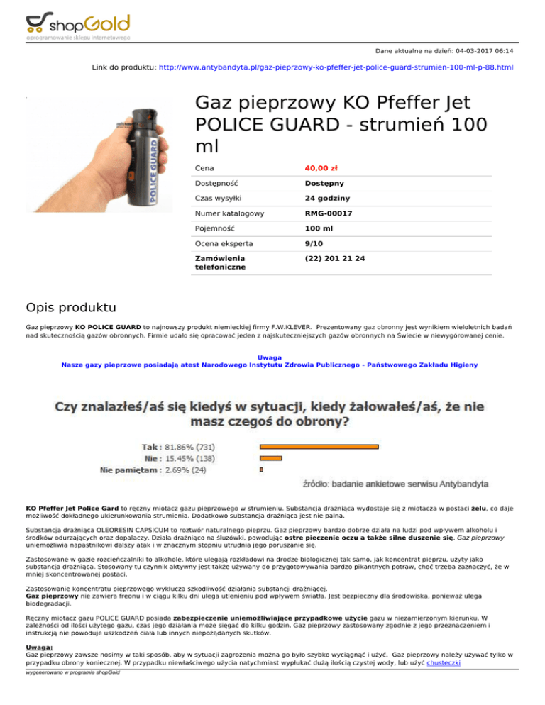 Dane aktualne na dzień: 04-03-2017 06:14 Link do produktu: http://www.antybandyta.pl/gaz-pieprzowy-ko-pfeffer-jet-police-guard-strumien-100-ml-p-88.html Gaz pieprzowy KO Pfeffer Jet POLICE GUARD - strumień 100 ml Cena 40,00 zł Dostępność Dostępny Czas wysyłki 24 godziny Numer katalogowy RMG-00017 Pojemność 100 ml Ocena eksperta 9/10 Zamówienia telefoniczne (22) 201 21 24 Opis produktu Gaz pieprzowy KO POLICE GUARD to najnowszy produkt niemieckiej firmy F.W.KLEVER. Prezentowany gaz obronny jest wynikiem wieloletnich badań nad skutecznością gazów obronnych. Firmie udało się opracować jeden z najskuteczniejszych gazów obronnych na Świecie w niewygórowanej cenie. Uwaga Nasze gazy pieprzowe posiadają atest Narodowego Instytutu Zdrowia Publicznego - Państwowego Zakładu Higieny KO Pfeffer Jet Police Gard to ręczny miotacz gazu pieprzowego w strumieniu. Substancja drażniąca wydostaje się z miotacza w postaci żelu, co daje możliwość dokładnego ukierunkowania strumienia. Dodatkowo substancja drażniąca jest nie palna. Substancja drażniąca OLEORESIN CAPSICUM to roztwór naturalnego pieprzu. Gaz pieprzowy bardzo dobrze działa na ludzi pod wpływem alkoholu i środków odurzających oraz dopalaczy. Działa drażniąco na śluzówki, powodując ostre pieczenie oczu a także silne duszenie się. Gaz pieprzowy uniemożliwia napastnikowi dalszy atak i w znacznym stopniu utrudnia jego poruszanie się. Zastosowane w gazie rozcieńczalniki to alkohole, które ulegają rozkładowi na drodze biologicznej tak samo, jak koncentrat pieprzu, użyty jako substancja drażniąca. Stosowany tu czynnik aktywny jest także używany do przygotowywania bardzo pikantnych potraw, choć trzeba zaznaczyć, że w mniej skoncentrowanej postaci. Zastosowanie koncentratu pieprzowego wyklucza szkodliwość działania substancji drażniącej. Gaz pieprzowy nie zawiera freonu i w ciągu kilku dni ulega utlenieniu pod wpływem światła. Jest bezpieczny dla środowiska, ponieważ ulega biodegradacji. Ręczny miotacz gazu POLICE GUARD posiada zabezpieczenie uniemożliwiające przypadkowe użycie gazu w niezamierzonym kierunku. W zależności od ilości użytego gazu, czas jego działania może sięgać do kilku godzin. Gaz pieprzowy zastosowany zgodnie z jego przeznaczeniem i instrukcją nie powoduje uszkodzeń ciała lub innych niepożądanych skutków. Uwaga: Gaz pieprzowy zawsze nosimy w taki sposób, aby w sytuacji zagrożenia można go było szybko wyciągnąć i użyć. Gaz pieprzowy należy używać tylko w przypadku obrony koniecznej. W przypadku niewłaściwego użycia natychmiast wypłukać dużą ilością czystej wody, lub użyć chusteczki wygenerowano w programie shopGold dekontaminacyjnej, którą można kupić tutaj - kliknij Dane techniczne: POLICE GUARD - ręczny miotacz gazu w strumieniu Bardzo agresywny naturalny środek obezwładniający Możliwość wielokrotnego użycia Pojemność: 100 ml Wysokość: 15 cm Średnica: 4.5 cm Producent: F.W.KLEVER (Niemcy) Niemiecka firma F.W.KLEVER istniejąca od 1874 roku jest znanym producentem gazów obronnych, preparatów ko czyszczenia i konserwacji broni. Wykorzystując swoją ogromną wiedzę z zakresu chemii a także potencjał nowoczesnych maszyn i technologii produkuje gazy obronne bardzo wysokiej jakości. W ofercie posiada gazy zarówno pieprzowe (KO PFEFFER, ANTY HUND) jak i CS (KO CS, DEFENOL CS). W ostatnim czasie obok gazów aerozolowych w palecie produkcyjnej znalazły się gazy w strumieniu (KO JET), które od razu zostały docenione i zauważone przez rynek. ABC gazów pieprzowych Gazy pieprzowe, czy to w formie ręcznych typu spray, czy w formie pistoletu to skuteczne narzędzie służące samoobronie, na które nie jest wymagane żadne zezwolenie. Poniżej znajdziesz kilka przydatnych informacji na ich temat. Gazy pieprzowe są legalnymi substancjami, pochodzącymi głównie z roślin pieprzowych. Taka substancja umieszczana jest z pojemniku pod ciśnieniem, skąd można ją miotać w stronę napastnika/ów. Najważniejszym składnikiem gazów pieprzowych jest Oleoresin Capsicum czyli w skrócie OC. Oleoresin Capsicum działa drażniąco na błony śluzowe powodując ostre pieczenie, trudności w oddychaniu oraz łzawienie. Czas działania gazu pieprzowego wynosi minimum 10 minut, a w przypadku gazów z wyższej półki (np. Antybandyta Terminator) do 40 minut, co daje możliwość ucieczki oraz wezwania pomocy. Największą zaletą gazów pieprzowych jest to, że działają one na wszystkich ludzi oraz zwierzęta. Gaz pieprzowy działa również na napastników będących pod wpływem alkoholu, narkotyków oraz innych środków, w tym również dopalaczy. Gaz pieprzowy posiadający atest Państwowego Zakładu Higieny (np. IDC RSG 3/2000 lub Antybandyta Terminator) nie powoduje uszczerbku na zdrowiu, więc można go używać w każdej sytuacji zagrożenia. Jak nosić gaz pieprzowy? Noszenie gazu pieprzowego jest kluczową sprawą. Ze względu na wielkość pojemnika gazowego oraz jego budowę, można go nosić w kaburze, na klipsie przymocowanym do paska lub w kieszeni. Gaz pieprzowy powinno się nosić w taki sposób aby w sytuacji zagrożenia jak najszybciej można go było wyciągnąć i użyć. Noszenie gazu pieprzowego w torebce nie jest dobrym pomysłem. Zmotoryzowani użytkownicy mogą przewozić gaz w bocznym schowku drzwi lub podłokietniku. Zalecamy trening przed lustrem wyciągania i celowania. W ten sposób wyrobimy w sobie nawyk, który może stać się nieoceniony w sytuacji zagrożenia. Gdzie kierować strumień gazu? Najbardziej wskazanym miejscem są okolice oczu. W tych okolicach gaz działa najszybciej i z największą mocą. Warto przy tym zaznaczyć, że celując w oczy w większości przypadków podrażniona zostaje cała twarz co ma dodatkowy wpływ na skuteczność gazu. W tym momencie warto wspomnieć o dwóch rodzajach strumienia gazu. Wyróżniamy gazy pieprzowe w formie stożka chmury (z ang.f