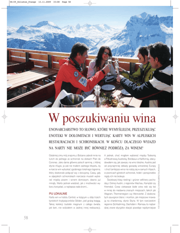 58-59_felieton_Prange 13.11.2009 15:08 Page 58 W poszukiwaniu wina ENONARCIARSTWO TO S¸OWO, KTÓRE WYMYÂLI¸EM, PRZESZUKUJÑC ENOTEKI W DOLOMITACH I WERTUJÑC KARTY WIN W ALPEJSKICH RESTAURACJACH I SCHRONISKACH. W KO¡CU DLACZEGO WYJAZD Ostatniej zimy mój znajomy z Bolzano zabra∏ mnie na lunch do jednego ze schronisk na stokach Plan de Corones. Jako danie g∏ówne poleci∏ sarnin´, z której s∏ynie rifugio, ja zaÊ nie mia∏em ˝adnego k∏opotu, by w karcie win wy∏uskaç zgrabnego lokalnego lagreina, który doskonale po∏àczy∏ si´ z dziczyznà. Czasy, gdy w alpejskich schroniskach narciarze musieli wybieraç mi´dzy piwem i winem domowym, dawno ju˝ min´∏y. Warto jednak wiedzieç, jak z mo˝liwoÊci wyboru korzystaç, a najlepsza rada brzmi... PIJ LOKALNIE Karta win w hotelu Central, w le˝àcym u stóp trzech tyrolskich trzytysi´czników Sölden, jest grubà ksi´gà. Takiej kolekcji butelek magnum z ca∏ego Êwiata, jak tam, nie widzia∏em w ˝adnej innej restauracji. 58 A jednak, choç mog∏em wybieraç mi´dzy Toskanià a Po∏udniowà Australià, Bordeaux a Kalifornià, zdecydowa∏em si´, jak zawsze, na wino lokalne. Austria jest od przynajmniej dekady gwiazdà winiarskiej Europy i choç tamtejsze wina nie rodzà si´ w samych Alpach, w piwnicach górskich schronisk, hoteli i pensjonatów nigdy ich nie brakuje. Âwiatowej klasy rieslingi i grüner veltlinery pochodzà z Dolnej Austrii, z regionów Wachau, Kamptal czy Kremstal. Coraz ciekawsze bia∏e wina robi si´ te˝ w mniej do niedawna znanych miejscach, takich jak Wagram, Thermenregion czy Weinviertel. Z doskona∏ych sauvignon blanc i morillon, jak miejscowi mawiajà na chardonnay, s∏ynie Styria. W tym narciarskim regionie (Schladming, Dachstein i Ramsau to najbardziej znane styryjskie stacje) powstaje najs∏ynniejsze FOT. DARKO TODOROVIC/VORARLBERG TOURISMUS NA NARTY NIE MO˚E BYå RÓWNIE˚ PODRÓ˚Ñ ZA WINEM?