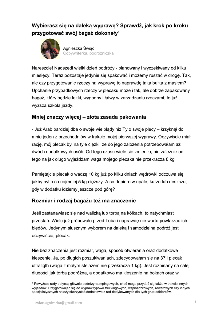 Wybierasz się na daleką wyprawę? Sprawdź, jak krok po kroku przygotować swój bagaż dokonały1 Agnieszka Świąć Copywriterka, podróżniczka Nareszcie! Nadszedł wielki dzień podróży - planowany i wyczekiwany od kilku miesięcy. Teraz pozostaje jedynie się spakować i możemy ruszać w drogę. Tak, ale czy przygotowanie rzeczy na wyprawę to naprawdę taka bułka z masłem? Upchanie przypadkowych rzeczy w plecaku może i tak, ale dobrze zapakowany bagaż, który będzie lekki, wygodny i łatwy w zarządzaniu rzeczami, to już wyższa szkoła jazdy. Mniej znaczy więcej – złota zasada pakowania - Już Arab bardziej dba o swoje wielbłądy niż Ty o swoje plecy – krzyknął do mnie jeden z przechodniów w trakcie mojej pierwszej wyprawy. Oczywiście miał rację, mój plecak był na tyle ciężki, że do jego założenia potrzebowałam aż dwóch dodatkowych osób. Od tego czasu wiele się zmieniło, nie zależnie od tego na jak długo wyjeżdżam waga mojego plecaka nie przekracza 8 kg. Pamiętajcie plecak o wadzę 10 kg już po kilku dniach wędrówki odczuwa się jakby był o co najmniej 5 kg cięższy. A co dopiero w upale, kurzu lub deszczu, gdy w dodatku idziemy jeszcze pod górę? Rozmiar i rodzaj bagażu też ma znaczenie Jeśli zastanawiasz się nad walizką lub torbą na kółkach, to natychmiast przestań. Wielu już próbowało przed Tobą i naprawdę nie warto powtarzać ich błędów. Jedynym słusznym wyborem na daleką i samodzielną podróż jest oczywiście, plecak. Nie bez znaczenia jest rozmiar, waga, sposób otwierania oraz dodatkowe kieszenie. Ja, po długich poszukiwaniach, zdecydowałam się na 37 l plecak ultraligth (waga z małym stelażem nie przekracza 1 kg). Jest rozpinany na całej długości jak torba podróżna, a dodatkowo ma kieszenie na bokach oraz w 1 Powyższe rady dotyczą głównie podróży trampingowych, choć mogą przydać się także w trakcie innych wyjazdów. Przygotowując się do wypraw typowo trekkingowych, wspinaczkowych, rowerowych czy innych specjalistycznych należy skorzystać dodatkowo z rad dedykowanych dla tych grup odbiorców. [email protected] 1 klapie i na pasku. Naprawdę nie żałuję, bo plecak służy mi już ponad 8 lat, a kupiłam go za jedyne 150 zł! Najlepiej, gdy wymiary naszego plecaka nie przekraczają standardowych rozmiarów bagażu podręcznego w tanich liniach lotniczych, gdyż obniży to zdecydowanie koszty naszej podróży. W przypadku ekskluzywnych linii lotniczych nie ma to już tak dużego znaczenia, ponieważ bagaż główny zawarty jest w podstawowej cenie biletu lotniczego. Mały bagaż to większe bezpieczeństwo podróży w lokalnych pociągach i autobusach, gdzie możemy swobodnie trzymać go na kolanach, bez obawy, że ktoś właśnie przeszukuje nasze rzeczy. Elementy istotne przy wyborze plecaka na wyprawy trampingowe: waga do 1,5 kg, pojemność 35 - 45 l, możliwość rozpięcia plecaka na całej Wizz Air, Easyjet długości, dopasowany system nośny, kieszenie i przegródki, rozmiary zbliżone do standardowych wymiarów bagażu podręcznego w tanich linach lotniczych. Ryanir * Podczas przygotowania do podróży po krajach, gdzie stan infrastruktury jest na bardzo niskim poziomie np. Mongolia, warto zabrać większy plecak, w którym zmieszczą się dodatkowe zapasy jedzenia. Dużym atutem jest możliwość rozpięcia plecaka na całej długości. Sprawdzi się to szczególnie, gdy nagle złapie nas burza, a my zamiast wywalać całą zawartość naszego bagażu, sięgniemy od razu po kurtkę przeciwdeszczową i pełne buty. A jeśli już mowa o burzy i deszczu, to nie zapomnijmy oczywiście o pokrowcu przeciwdeszczowym, który ochroni nas nie tylko przed zabrudzeniem czy zniszczeniem plecaka, ale również spoi w jedną całość doczepione do niego rzeczy. [email protected] 2 Miss z plecakiem, czyli słów kilka o ubraniach na podróż fot. własna Autostopowa podróż po Indiach Trudno rozstać się z ukochanym swetrem czy wypchaną po brzegi kosmetyczką, ale jeszcze trudniej nosić to wszystko w upale czy w strugach deszczu. Niezależnie od tego, czy jesteś kobietą, czy mężczyzną, to nawet na bardzo długą wyprawę, wystarczy Ci minimalny zestaw ubrań. Prawie wszystko możesz kupić na miejscu i to nawet taniej niż w Polsce. Możesz też, łatwo i tanio, wyprać rzeczy u lokalnych gospodarzy lub w pralni. Najlepiej zabrać ze sobą dodatkowe mydło, które w zupełności zastąpi nam proszki, płyny oraz inne środki do prania. Mój podstawowy zestaw ubrań na wyjazd letni: trzy koszulki, bluzka z długim rękawem, długie i krótkie spodnie, bielizna (stanik, 3-4 pary bawełnianych majtek, 3 pary skarpet), polar (nawet w tropikach potrafi być dużo zimniej niż się tego spodziewamy), kurtka przeciwdeszczowa, chusta, czapka z daszkiem lub bandamka, [email protected] 3 lekkie buty trekkingowe, sandały lub klapki, kostium kąpielowy (najlepiej dwuczęściowy - góra świetnie sprawdzi się jako zapasowy stanik). Na zimowy wyjazd: zamieniam krótkie spodenki na długie, a czapkę z daszkiem na bawełnianą, dokładam ciepłą koszulę, szalik, rękawiczki, bieliznę termo–aktywną (góra i dół) i grube skarpety. Zarówno letni jak i zimowy zestaw, po małej korekcie, sprawdzi się także dla mężczyzn. Rzeczy, które zabieramy w podróż, powinny być lekkie i szybkoschnące. Skrajnie nie praktyczne jest zabieranie grubych, ciężkich swetrów czy jeansów. Najlepiej sprawdzą się ubrania w kolorach w neutralnych: beżowe, szare i jasnobrązowe. Jaskrawe przyciągają owady, białe brud, a czarne nie odbijają słońca. Nie polecam też zabierania ubrań w wojskowych wzorach, w niektórych krajach może to być bardzo źle odebrane i tylko wpakujemy się w kłopoty. Uwaga, kobiety koniecznie powinny zabrać koszulki zakrywające ramiona i dekolt oraz spodenki za kolana. Wynika to nie tylko ze względów bezpieczeństwa, ale również z szacunku do zwyczajów panuj