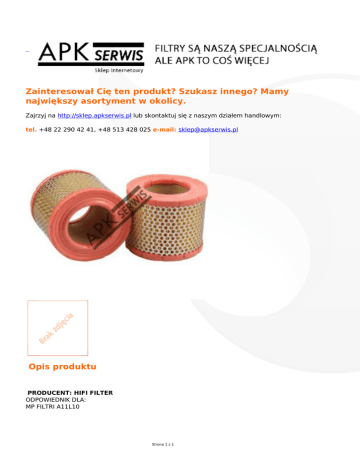Zainteresował Cię ten produkt? Szukasz innego? Mamy największy asortyment w okolicy. Zajrzyj na http://sklep.apkserwis.pl lub skontaktuj się z naszym działem handlowym: tel. +48 22 290 42 41, +48 513 428 025 e-mail: [email protected] Opis produktu PRODUCENT: HIFI FILTER ODPOWIEDNIK DLA: MP FILTRI A11L10 Strona 1 z 1