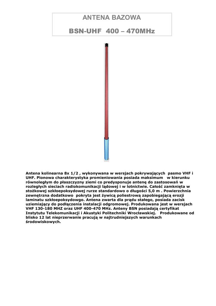 ANTENA BAZOWA BSN-UHF 400 – 470MHz Antena kolinearna 8x 1/2 , wykonywana w wersjach pokrywających pasmo VHF i UHF. Pionowa charakterystyka promieniowania posiada maksimum w kierunku równoległym do płaszczyzny ziemi co predysponuje antenę do zastosowań w rozległych sieciach radiokomunikacji lądowej i w lotnictwie. Całość zamknięta w stożkowej szkłoepoksydowej rurze standardowo o długości 5,0 m . Powierzchnia zewnętrzna dodatkowo pokryta jest żywicą poliestrową zapobiegającą erozji laminatu szkłoepoksydowgo. Antena zwarta dla prądu stałego, posiada zacisk uziemiający do podłączenia instalacji odgromowej. Produkowana jest w wersjach VHF 130-180 MHZ oraz UHF 400-470 MHz. Anteny BSN posiadają certyfikat Instytutu Telekomunikacji i Akustyki Politechniki Wrocławskiej. Produkowane od blisko 12 lat nieprzerwanie pracują w najtrudniejszych warunkach środowiskowych. Właściwości elektryczne Zysk energetyczny w z gl ę de m d i p o la λ/2 8 dB Charakterystyka promieniowania Dookólna Impedancja 50 Ω Typ anteny Współczynnik fali SWR w p a śm i e p r a c y a nte ny Maksymalna moc doprowadzona kolinearna, 8 x 1/2 λ <1,5 200 W Pasmo pracy 20 MHz Podział anteny na wykonania w funkcji częstotliwości pracy Wykonanie Pasmo pracy [MHz] 1 400-420 2 410-430 3 420-440 4 430-450 5 440-460 6 450-470 Dostępne również inne wykonania wg potrzeb Zamawiającego K o d p o z i o me j c ha r a k t e r y s ty k i p r o mi e ni o w a ni a a n te ny ( w p ła sz c z y ź ni e w e k t o r a H ) 000ND00 (według Zalecenia CEPT T/R 25-08) K o d p i o no w e j c h a r a k t e r y s ty k i p r o mi e ni o w a ni a a n te ny ( w p ła sz c z y ź ni e w e k t o r a E ) 003DE18 (według Zalecenia CEPT T/R 25-08) Cechy mechaniczne Rodzaj złącza N Materiał Aluminium, szkłoepoxyd, Polaryzacja pionowa Średnica masztu mocującego 50mm M a sa a n te n y 5 kg Zabezpieczenie antyodgromowe galwaniczne, dodatkowym przewodem D ł ug o ś ć c a łk o w i ta a nte ny : 5230 mm Okres gwarancji 2 lata Opakowanie Karton D ł ug o ś ć r ur y sł uż ą c e j d o mo c o w a n i a a nte n y 610 mm Maksymalna prędkość wiatru 45 m/s Warunki klimatyczne Z a k r e s te mp e r a tur p r a c y -40°C ÷ +70°C W i l g o t no ś ć w z g l ę d na < 100% w temp. +40°C VSWR BSN - UHF M1: 1.139 @ 417.08 MHz M2: 1.532 @ 426.74 MHz M3: 3.329 @ 405.12 MHz M4: 2.578 @ 410.00 MHz 9 8 7 VSWR 6 5 4 3 2 M3 M4 M1 M2 1 380 390 400 Resolution: 130 Date: Model: S331A 410 420 430 440 Frequency (380.0 - 470.0 MHz) 450 460 CAL:ON(COAX) Time: Serial #: 00036029 470 CW: OFF VSWR BSN450 2,75 M1: 1,062 @ 469,20 MHz M2: 1,03 @ 467,20 MHz M3: 1,068 @ 465,20 MHz M4: 1,667 @ 444,80 MHz 2,50 VSWR 2,25 2,00 1,75 1,50 Limit : 1,5 1,25 M4 M3 M2 M1 1,00 400 410 420 Resolution: 130 Model: MS 430 440 450 460 Frequency (400,0 - 485,0 MHz) 470 CAL:ON(COAX) Serial #: 00000000 480 CW: ON Smoothing: 0 VSWR BSN 400 M1: 1,503 VSWR @ 428,40 MHz M2: 1,02 VSWR @ 434,00 MHz M3: 1,506 VSWR @ 441,60 MHz M4: 7,00 VSWR @ 400,50 MHz VSWR 2.5 M4 2.0 M1 M2 M3 1.5 390 400 410 420 430 440 MHz 450 Przebieg charakterystyk SWR 460 470 480