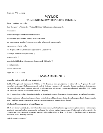 Sygn. akt IV U 1441/14 WYROK W IMIENIU RZECZYPOSPOLITEJ POLSKIEJ Dnia 7 kwietnia 2015 roku Sąd Okręgowy w Tarnowie – Wydział IV Pracy i Ubezpieczeń Społecznych w składzie: Przewodniczący: SSO Kazimierz Kostrzewa Protokolant: protokolant sądowy Marta Bartusiak po rozpoznaniu w dniu 7 kwietnia 2015 roku w Tarnowie na rozprawie sprawy z odwołania M. P. od decyzji Zakładu Ubezpieczeń Społecznych Oddział w T. z dnia 30 września 2014 roku nr (...) w sprawie M. P. przeciwko Zakładowi Ubezpieczeń Społecznych Oddział w T. o rentę socjalną oddala odwołanie. Sygn. akt IV U 1441/14 UZASADNIENIE wyroku z dnia 07 kwietnia 2015 roku Zakład Ubezpieczeń Społecznych Oddział w T. decyzją z dnia 30.09.2014 r. odmówił M. P. prawa do renty socjalnej podnosząc, iż ubezpieczona nie spełnia żadnego z ustawowych wymogów do przyznania tego świadczenia. W szczególności organ rentowy wskazał, że ubezpieczona nie została orzeczeniem komisji lekarskiej ZUS z dnia 29.09.2014r. uznana za całkowicie niezdolną do pracy. M. P. w odwołaniu od tej decyzji podniosła, że się z nią nie zgadza, domagając się skierowania na badanie lekarskie. Organ rentowy w odpowiedzi na odwołanie wniósł o jego oddalenie, powołując się na brak przesłanek do przyznania renty socjalnej, podtrzymując tym samym argumenty zawarte w zaskarżonej decyzji. Sąd ustalił następujący stan faktyczny: M. P. urodzona w dniu (...) r., ma wykształcenie zawodowe, ukończyła szkołę podstawową i zawodową o obniżonym poziomie wymagań, zdobywając zawód kucharza. Dotychczas nigdy nie pracowała. W okresach od 28.02.2006r. do 31.08.2014r. nieprzerwanie pobierała rentę socjalną. Odwołująca w dniu 12.08.2014 r. złożyła wniosek o ponowne ustalenie prawa do renty socjalnej. /okoliczności bezsporne/ Celem wyjaśnienia istoty sporu tj. istnienia u M. P. niezdolności do pracy zarobkowej w rozumieniu art. 12, art. 13 ustawy z dnia 17 grudnia 1998 r. o emeryturach i rentach z Funduszu Ubezpieczeń Społecznych (Dz. U. Nr 162 poz. 1118 z późń zm.) w zw. z art. 5 ustawy z dnia 27 czerwca 2003 r. o rencie socjalnej (Dz. U. Nr 135, poz. 1268) Sąd dopuścił dowód z opinii biegłego sądowego specjalisty z zakresu psychiatrii. Sąd na podstawie opinii biegłego lekarza sądowego specjalisty psychiatry ustalił, że u odwołującej występuje: - upośledzenie umysłowe lekkie. Biegły sądowy stwierdził, że odwołująca nie jest całkowicie niezdolna do pracy od 01.09.2014r. W szczególności biegły wskazał, że u odwołującej występują zaburzenia adaptacyjne z rozpoznaniem od 2005r. zaburzeń zachowania i osobowości u osoby upośledzonej umysłowo w stopniu lekkim. Od 2001 roku pozostaje w opiece psychologicznej. W okresie 10.07.2013r. do 31.07.2013r. była hospitalizowana w Oddziale Psychiatrycznym. W badaniach psychologicznych w 2008 roku stwierdzono obniżenie sprawności intelektualnej do przedziału upośledzenia umysłowego w stopniu lekkim /II=56/, w czasie badania psychologicznego w 2014 roku oceniono sprawność intelektualną na poziomie upośledzenia umysłowego w stopniu lekkim /II=62/. W czasie badania psychiatrycznego. Poza deficytem intelektualnym nie stwierdzono istotnych odchyleń od stanu prawidłowego. Z wywiadu od oponowanej oraz od matki opiniowanej wynika, że w zakresie zaburzeń zachowania nastąpiła poprawa. Odwołująca ukończyła szkołę zawodową, zdobywając zawód kucharza. Dotychczas nie pracowała zarobkowo. Obecnie stan psychiczny odwołującej oraz funkcjonowanie intelektualne, emocjonalne i społeczne nie dają podstaw do uznania odwołującej za całkowicie niezdolną do pracy od dnia 01.09.2014r. (dowód: opinia sądowo-lekarska - k.8-10 as). Sąd w całości podzielił stanowisko biegłego lekarza sądowego. W szczególności Sąd uznał przedłożoną opinię za miarodajną dla ustalenia stanu zdrowia odwołującej w zakresie jej zdolności do wykonywania pracy. Opiniujący w sposób wyczerpujący i szczegółowy wyjaśnił podstawy i przyczyny, dla których nie uznał odwołującą za całkowicie niezdolną do pracy od 01.09.2014 r. Opinia biegłego w ocenie Sądu spełnia ponadto wymogi przewidziane dla tego rodzaju środków dowodowych w art. 278 kpc i art. 285 kpc, a także w Rozporządzeniu Ministra Polityki Społecznej z 14.12.2004 r. w sprawie orzekania o niezdolności do pracy w związku z art. 12-14 ustawy z 17 grudnia 1998 r. o emeryturach i rentach z FUS. Żadna ze stron nie kwestionowała opinii. Sąd rozważył, co następuje: Odwołanie nie zasługuje na uwzględnienie. Kwestią sporną pomiędzy stronami było ustalenie, czy odwołująca spełniała w chwili orzekania przesłanki do pobierania renty socjalnej. Zgodnie z art. 4 ust. 1 ustawy z dnia 27 czerwca 2003 r. o rencie socjalnej ( Dz.U. Nr 135, poz. 1268), renta socjalna przysługuje osobie pełnoletniej całkowicie niezdolnej do pracy z powodu naruszenia sprawności organizmu, które powstało: - przed ukończeniem 18 roku życia, - w trakcie nauki w szkole lub w szkole wyższej – przed ukończeniem 25 roku życia, - w trakcie studiów doktoranckich lub aspirantury naukowej. Przedmiotem postępowania było ustalenie, czy ubezpieczona ze względu na stan zdrowia jest całkowicie niezdolna do pracy, czy też stan jej zdrowia uległ zmianie, jak to wynika z zakwestionowanej opinii komisji lekarskiej i wydanej na jej podstawie decyzji ZUS. W toku postępowania sądowego ubezpieczona została poddana badaniu przez biegłego lekarza psychiatrę. W świetle opinii biegłego odwołująca nie jest osobą całkowicie niezdolną do pracy od 01.09.2014 r. Z okoliczności sprawy wynika, że u M. P. z przyczyn psychiatrycznych nie stwierdza się niezdolności do pracy. Obecnie u odwołującej nie stwierdza się istotnych odchyleń od stanu prawidłowego w tym zaburzeń funkcji poznawczych, zaburzeń afektywnych, zaburzeń zachowania zaburzeń psychotycznych. Aktualny stan psychiczny oraz 
