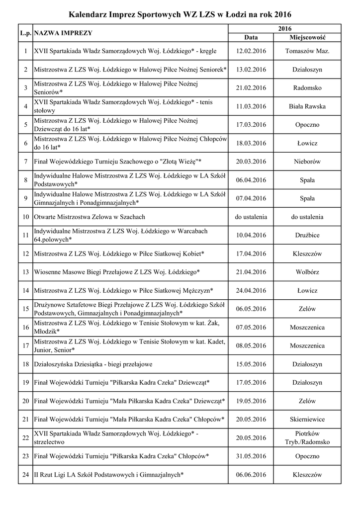 Kalendarz Imprez Sportowych WZ LZS w Łodzi na rok 2016