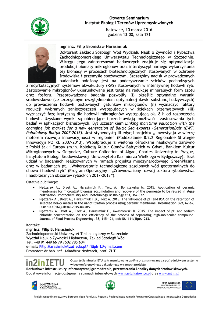 Otwarte Seminarium Instytut Ekologii Terenów Uprzemysłowionych Katowice, 10 marca 2016 godzina 13:00, sala 121 mgr inż. Filip Bronisław Harasimiuk Doktorant Zakładu Sozologii Wód Wydziału Nauk o Żywności i Rybactwa Zachodniopomorskiego Uniwersytetu Technologicznego w Szczecinie. W kręgu jego zainteresowań badawczych znajduje się optymalizacja produkcji biomasy mikroglonów oraz interdyscyplinarnego wykorzystania tej biomasy w procesach biotechnologicznych stosowanych w ochronie środowiska i przemyśle spożywczym. Szczególny nacisk w prowadzonych badaniach położony jest na podczyszczanie ścieków pochodzących z recyrkulacyjnych systemów akwakultury (RAS) stosowanych w intensywnej hodowli ryb. Zastosowanie mikroglonów ukierunkowane jest tutaj na redukcję mineralnych form azotu oraz fosforu. Przeprowadzone badania pozwoliły (i) określić optymalne warunki środowiskowe (ze szczególnym uwzględnieniem optymalnej dawki substancji odżywczych) do prowadzenia hodowli testowanych gatunków mikroglonów (ii) wyznaczyć faktory redukcji wybranych zanieczyszczeń występujących w ściekach przemysłowych (iii) wyznaczyć fazę krytyczną dla hodowli mikroglonów występującą ok. 8 h od rozpoczęcia hodowli. Uzyskane wyniki są obiecujące i przedstawiają możliwości zastosowania tych badań w aplikacjach biznesowych. Był uczestnikiem Linking maritime education with the changing job market for a new generation of Baltic Sea experts –GenerationBalt (EWT, Południowy Bałtyk 2007-2013). Jest stypendystą III edycji projektu „ Inwestycja w wierzę motorem rozwoju innowacyjności w regionie” (Poddziałanie 8.2.2 Regionalne Strategie Innowacyji PO KL 2007-2013). Współpracuje z wieloma ośrodkami naukowymi zarówno z Polski jak i Europy (m.in. Kolekcją Kultur Glonów Bałtyckich w Gdyni, Bankiem Kultur Mikroglonowych w Getyndze, Culture Collection of Algae, Charles University in Prague, Instytutem Biologii Środowiskowej Uniwersytetu Kazimierza Wielkiego w Bydgoszczy). Brał udział w badaniach realizowanych w ramach projektu międzynarodowego GreenPlasma oraz w badaniach pt. „Wykorzystanie technologiczne zasolonych wód geotermalnych do chowu i hodowli ryb” (Program Operacyjny – „Zrównoważony rozwój sektora rybołówstwa i nadbrzeżnych obszarów rybackich 2017-2013”). Ostatnie publikacje: Nędzarek A., Drost A., Harasimiuk F., Tórz A., Bonisławska M. 2015. Application of ceramic membranes for microalgal biomass accumulation and recovery of the permeate to be reused in algae cultivation. Photochemistry and Photobiology B: Biology 153, 367-372. Nędzarek A., Drost A., Harasimiuk F.B., Tórz A. 2015. The influence of pH and BSA on the retention of selected heavy metals in the nanofiltration process using ceramic membrane. Desalination 369, 62-67, DOI: 10.1016/j.desal.2015.04.019. Nędzarek A. Drost A., Tórz A., Harasimiuk F., Kwaśniewski D. 2015. The impact of pH and sodium chloride concentration on the efficiency of the process of separating high-molecular compound. Journal of Food Process Engineering, 38, 115-124, doi:10.1111/jfpe.1213. Kontakt: mgr inż. Filip B. Harasimiuk Zachodniopomorski Uniwersytet Technologiczny w Szczecinie Wydział Nauk o Żywności i Rybactwa, Zakład Sozologii Wód Tel. +48 91 449 66 79 /502 785 604 e-mail: [email protected]/ [email protected] Promotor: dr hab. inż. Arkadiusz Nędzarek, prof. ZUT Otwarte Seminaria IETU są transmitowane on-line oraz nagrywane za pośrednictwem systemu wideokonferencyjnego zakupionego w ramach projektu Rozbudowa infrastruktury informatycznej gromadzenia, przetwarzania i analizy danych środowiskowych. Dodatkowe informacje dostępne na stronach internetowych www.ietu.katowice.pl oraz www.in2in.pl Projekt współfinansowany z Europejskiego Funduszu Rozwoju Regionalnego ramach Programu Operacyjnego Innowacyjna Gospodarka
