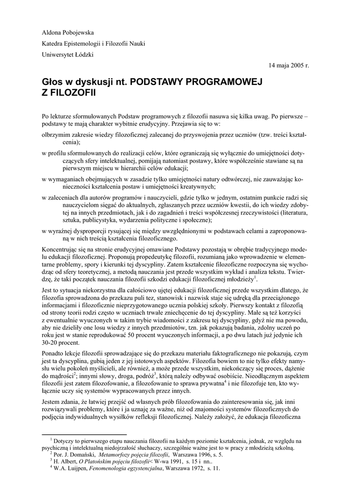 Aldona Pobojewska Katedra Epistemologii i Filozofii Nauki Uniwersytet Łódzki 14 maja 2005 r. Głos w dyskusji nt. PODSTAWY PROGRAMOWEJ Z FILOZOFII Po lekturze sformułowanych Podstaw programowych z filozofii nasuwa się kilka uwag. Po pierwsze – podstawy te mają charakter wybitnie erudycyjny. Przejawia się to w: olbrzymim zakresie wiedzy filozoficznej zalecanej do przyswojenia przez uczniów (tzw. treści kształcenia); w profilu sformułowanych do realizacji celów, które ograniczają się wyłącznie do umiejętności dotyczących sfery intelektualnej, pomijają natomiast postawy, które współcześnie stawiane są na pierwszym miejscu w hierarchii celów edukacji; w wymaganiach obejmujących w zasadzie tylko umiejętności natury odtwórczej, nie zauważając konieczności kształcenia postaw i umiejętności kreatywnych; w zaleceniach dla autorów programów i nauczycieli, gdzie tylko w jednym, ostatnim punkcie radzi się nauczycielom sięgać do aktualnych, zgłaszanych przez uczniów kwestii, do ich wiedzy zdobytej na innych przedmiotach, jak i do zagadnień i treści współczesnej rzeczywistości (literatura, sztuka, publicystyka, wydarzenia polityczne i społeczne); w wyraźnej dysproporcji rysującej się między uwzględnionymi w podstawach celami a zaproponowaną w nich treścią kształcenia filozoficznego. Koncentrując się na stronie erudycyjnej omawiane Podstawy pozostają w obrębie tradycyjnego modelu edukacji filozoficznej. Proponują propedeutykę filozofii, rozumianą jako wprowadzenie w elementarne problemy, spory i kierunki tej dyscypliny. Zatem kształcenie filozoficzne rozpoczyna się wychodząc od sfery teoretycznej, a metodą nauczania jest przede wszystkim wykład i analiza tekstu. Twierdzę, że taki początek nauczania filozofii szkodzi edukacji filozoficznej młodzieży1. Jest to sytuacja niekorzystna dla całościowo ujętej edukacji filozoficznej przede wszystkim dlatego, że filozofia sprowadzona do przekazu puli tez, stanowisk i nazwisk staje się udręką dla przeciążonego informacjami i filozoficznie nieprzygotowanego ucznia polskiej szkoły. Pierwszy kontakt z filozofią od strony teorii rodzi często w uczniach trwałe zniechęcenie do tej dyscypliny. Małe są też korzyści z ewentualnie wyuczonych w takim trybie wiadomości z zakresu tej dyscypliny, gdyż nie ma powodu, aby nie dzieliły one losu wiedzy z innych przedmiotów, tzn. jak pokazują badania, zdolny uczeń po roku jest w stanie reprodukować 50 procent wyuczonych informacji, a po dwu latach już jedynie ich 30-20 procent. Ponadto lekcje filozofii sprowadzające się do przekazu materiału faktograficznego nie pokazują, czym jest ta dyscyplina, gubią jeden z jej istotowych aspektów. Filozofia bowiem to nie tylko efekty namysłu wielu pokoleń myślicieli, ale również, a może przede wszystkim, niekończący się proces, dążenie do mądrości2; innymi słowy, droga, podróż3, którą należy odbywać osobiście. Nieodłącznym aspektem filozofii jest zatem filozofowanie, a filozofowanie to sprawa prywatna4 i nie filozofuje ten, kto wyłącznie uczy się systemów wypracowanych przez innych. Jestem zdania, że łatwiej przejść od własnych prób filozofowania do zainteresowania się, jak inni rozwiązywali problemy, które i ja uznaję za ważne, niż od znajomości systemów filozoficznych do podjęcia indywidualnych wysiłków refleksji filozoficznej. Należy założyć, że edukacja filozoficzna 1 Dotyczy to pierwszego etapu nauczania filozofii na każdym poziomie kształcenia, jednak, ze względu na psychiczną i intelektualną niedojrzałość słuchaczy, szczególnie ważne jest to w pracy z młodzieżą szkolną. 2 Por. J. Domański, Metamorfozy pojęcia filozofii, Warszawa 1996, s. 5. 3 H. Albert, O Platońskim pojęciu filozofii< W-wa 1991, s. 15 i nn.. 4 W.A. Luijpen, Fenomenologia egzystencjalna, Warszawa 1972, s. 11. nie kończy się na szkole, lecz winna być kontynuowana po jej ukończeniu, czy to w formie zorganizowanej (studia), czy samokształcenia. Zatem szkolną edukację filozoficzną należy rozpoczynać od wyrobienia w uczniach odpowiednich do tego kompetencji, na które składają się określone postawy poznawcze, umiejętności oraz motywacje. Są one rozmaite i znane od tysiącleci. Wymienię tu tylko podstawowe. Świadomość własnej niewiedzy, tj. rozpoznanie, że zdroworozsądkowa wizja świata, w której tkwimy i którą uznajemy za oczywistą, oczywista nie jest. Bez jego spełnienia tego warunku uczeń nie dostrzega sensu filozofii, a prezentowane przez nauczyciela koncepcje filozoficzne traktuje jako - oderwany od rzeczywistości, nie dotyczący słuchacza, wymysł chorej wyobraźni. Wrażliwość intelektualna i moralna, które stanowią warunek umiejętności dostrzeżenia problemów natury poza operacyjnej, należących zarówno do filozofii teoretycznej, jak i praktycznej. Zdolność stawienia siebie w sytuacji pytania. Niezbędnych jest do tego szereg kompetencji i umiejętności: umiejętność koncentracji, dociekliwość poznawcza, zaangażowanie, zdolność scalania posiadanej wiedzy i odejście od ustalonych schematów myślenia itd. Sztuka dialogu. Narzędziem filozofii nie jest wykład, narracja, czy opowiadanie, lecz swoiste myślenie i dialog. Aktywności te wzajemnie się stymulują. Nie ma dialogu bez myślenia, ale również dialog wzmaga refleksję, gdyż angażujące się w dialog osoby zmuszone są do intensywnego namysłu. Wprowadzanie do szkoły filozofii jako systemu tez oraz koncepcji, a odsunięcie na dalszy plan metodycznego wdrażania wychowanków do samodzielnego filozofowania, nie tylko zmniejsza szanse na uświadomienie uczniom specyfiki tej dyscypliny, ale zaprzepaszcza możliwość wykorzystania filozofii do realizacji podstawowych celów edukacji jako takiej, celów, które tak trudno osiągnąć w polskiej szkole. Najistotniejszy z nich upatruję w przygotowaniu ucznia do rozumienia świata i umiejęt